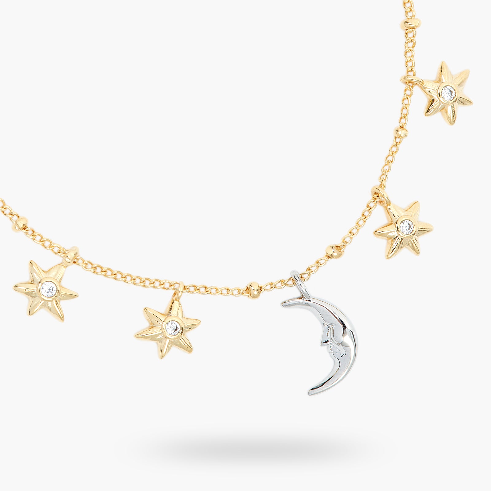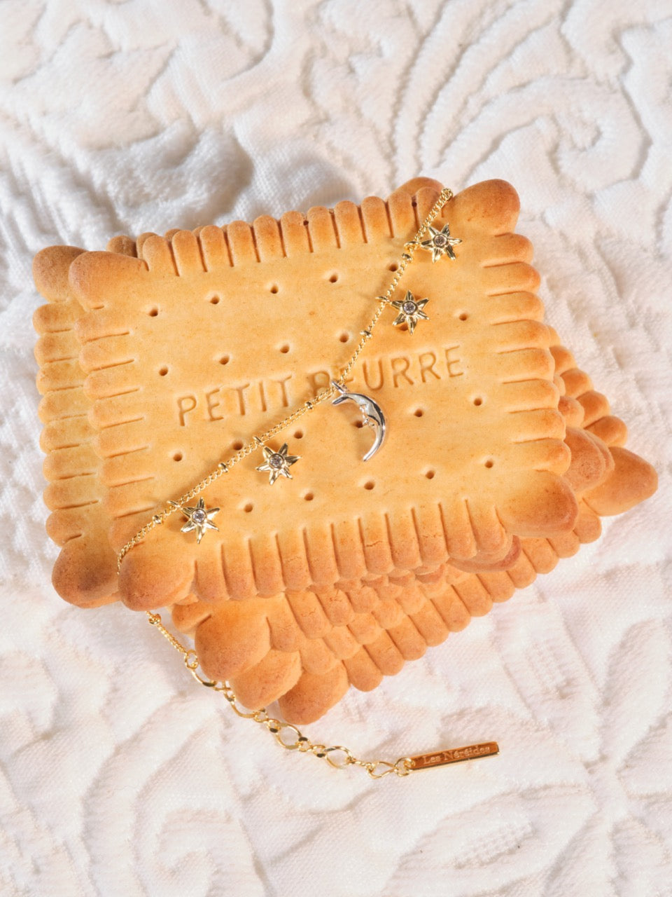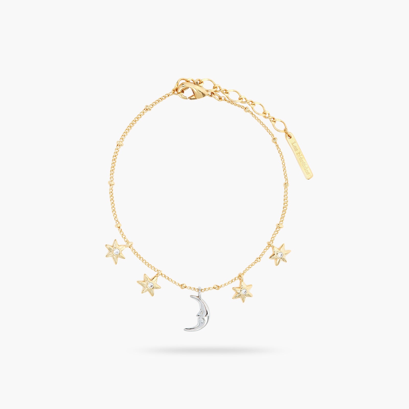 Elevate your style with the exquisite beauty of the Fine Stars and Moon Charm Bracelet from Les Nereides. This stunning piece features a delicate moon with a friendly face, crafted with platinum plating. Flanked on either side are two gold stars, creating a celestial symphony of elegance.