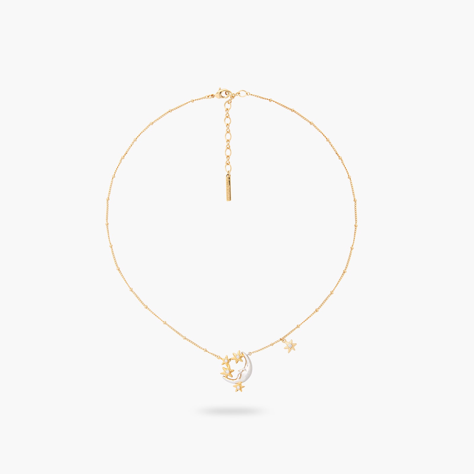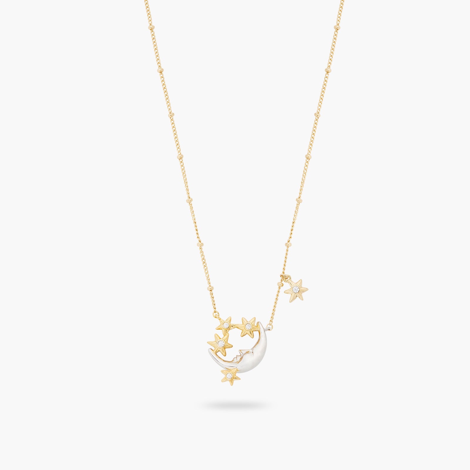 Featuring a platinum-plated crescent moon delicately held by four golden stars, this necklace is a true testament to the wonders of the cosmos. The intricate detailing and impeccable craftsmanship make it a stunning accessory that will surely turn heads.