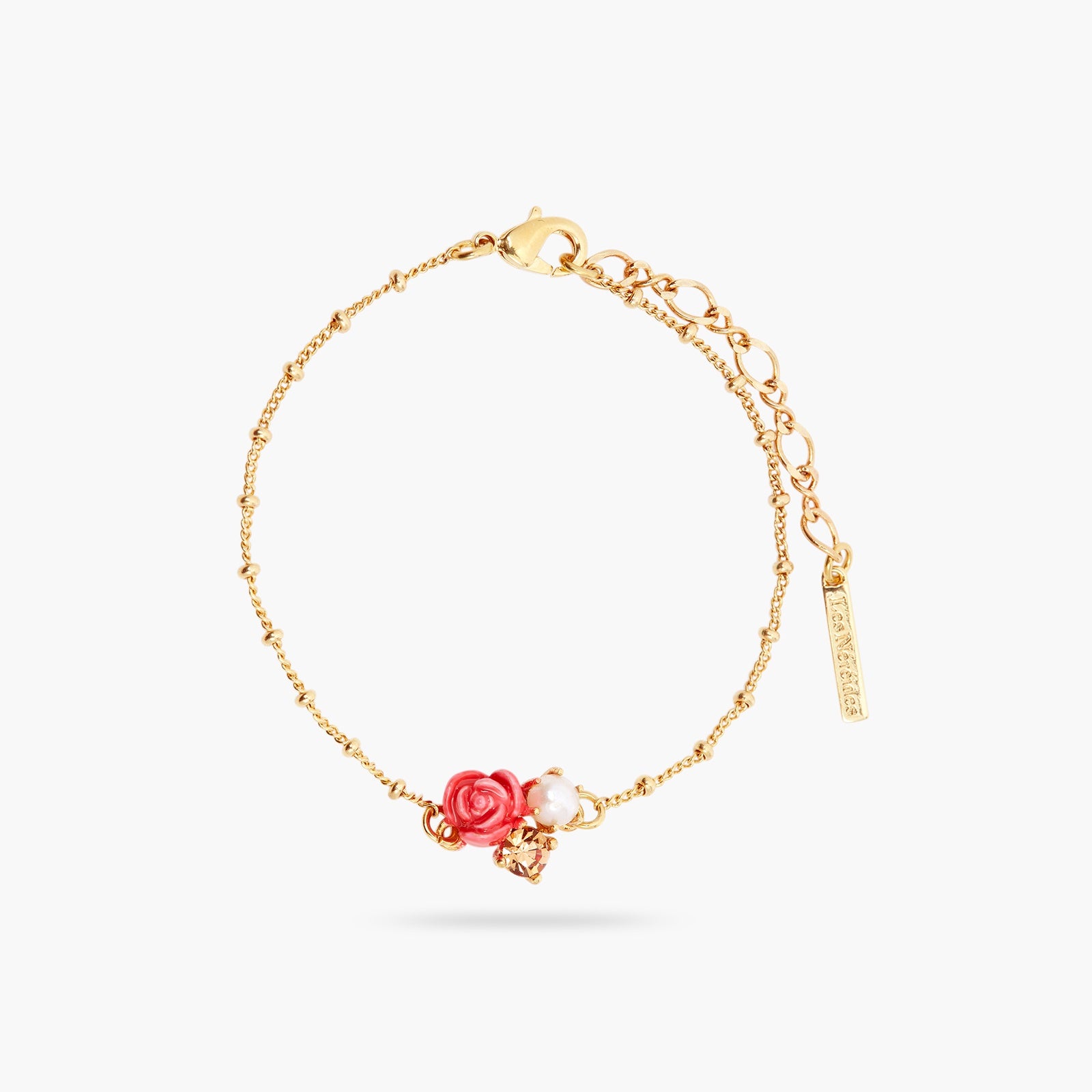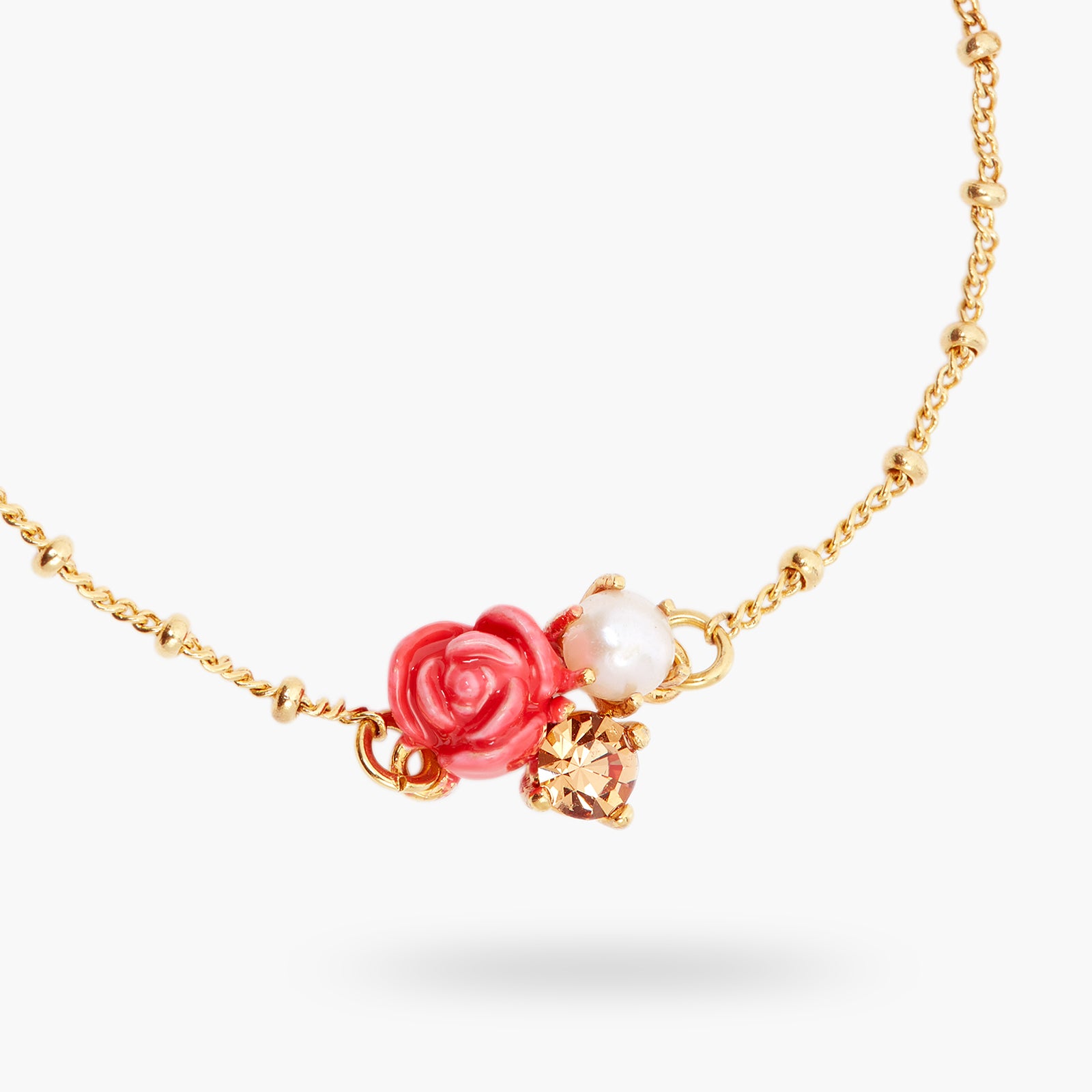 This bracelet is a creation from the Antica Rosa collection, which draws its inspiration from a long forgotten rose garden with a romantic charm. It is composed of a trio of jewellery elements: a cultured pearl, a round faceted stone and an enamelled rose, all mounted on a fine gold-plated chain. The cultured pearl, similar to a rosebud, is also featured on other costume jewellery designs in this poetic collection. This bracelet will be an ideal gift for your mother or a dear friend.