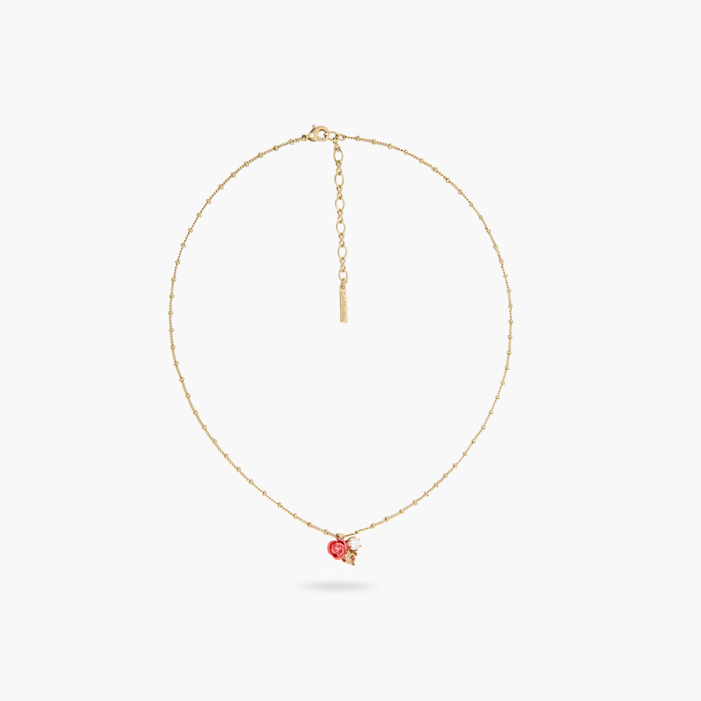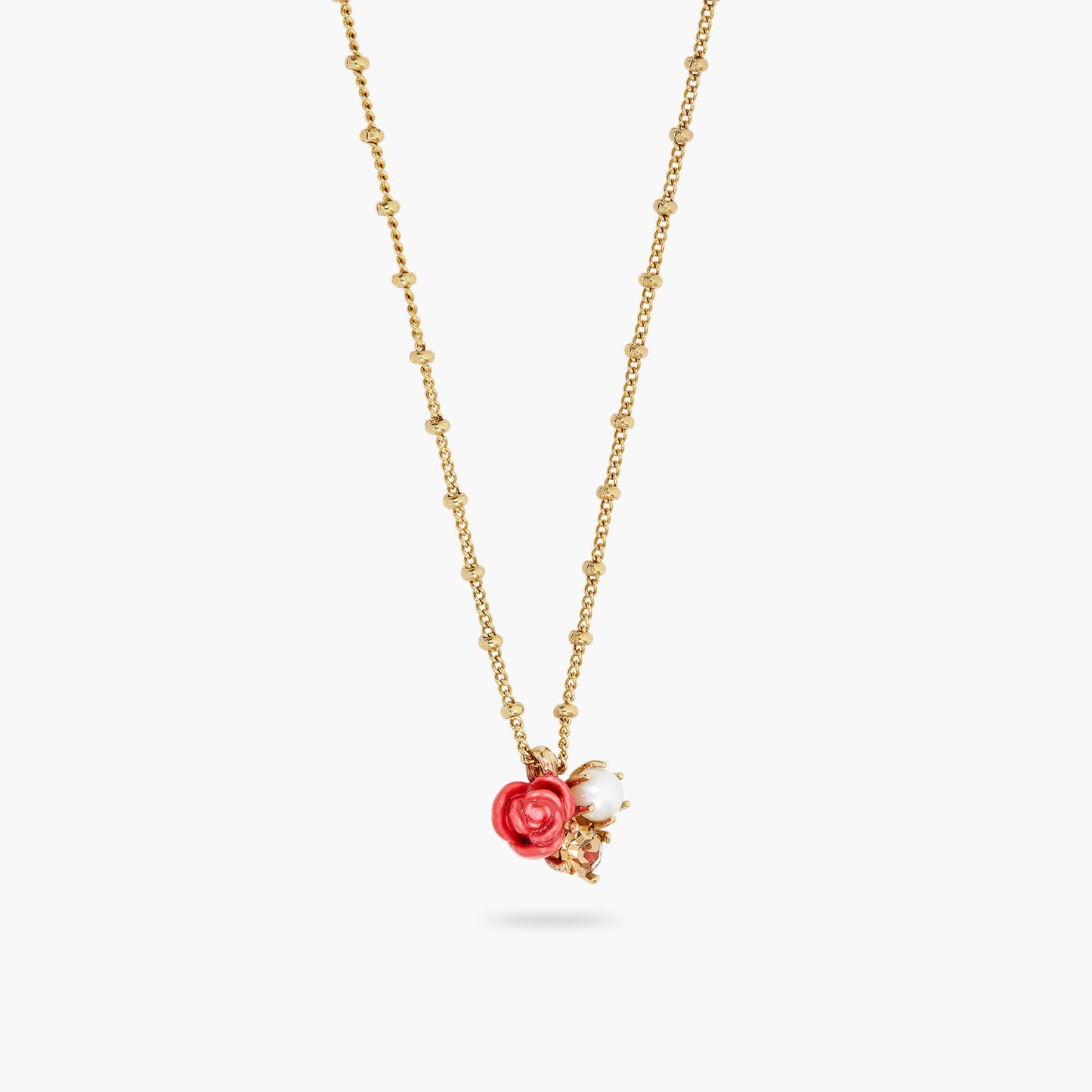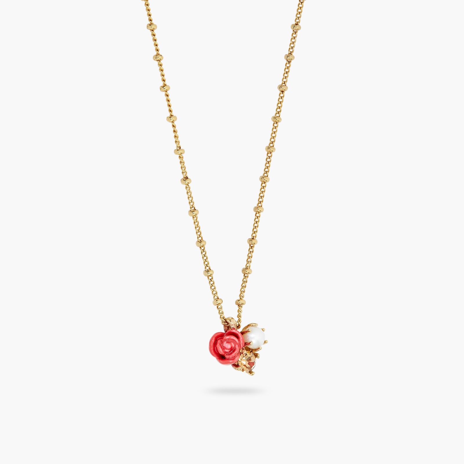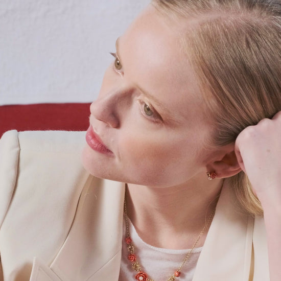 The Antica Rosa collection features a lovely round pendant necklace made up of three pieces of jewellery, including a cultured pearl, a hand-enamelled rose and a bronze faceted crystal stone. This pendant is mounted on a fine gold-plated chain and will look great with your everyday wear, adding a touch of elegance to your look. It is the perfect accessory for women looking to make a statement.