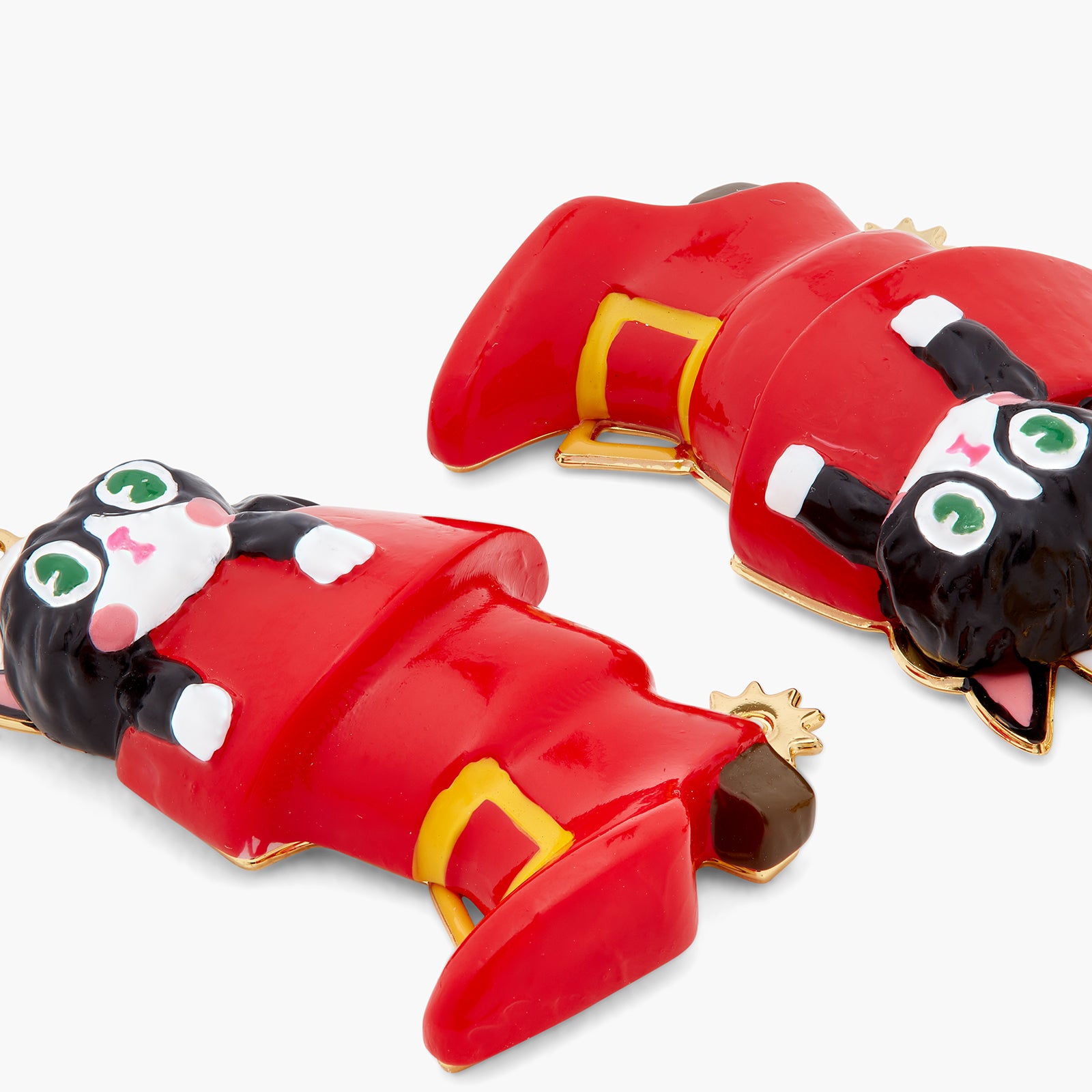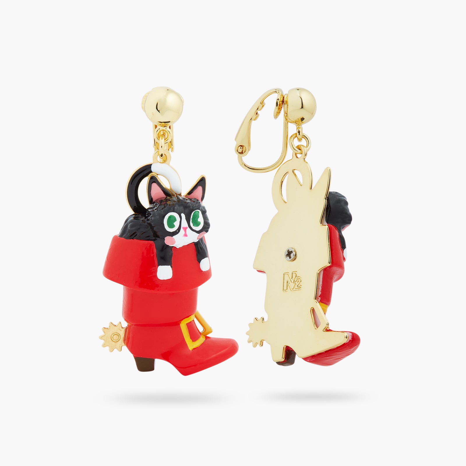 The renowned Puss in Boots, a character from Perrault's fairytale, is beautifully encapsulated in this charming red boot. Full of mischief and cunning, let this iconic cat become your favorite companion with these designer clip-on earrings. N2 by Les Néréides celebrates this lovable character from Perrault's fairytale who, in his finest boots, will bring vibrant colors into your life. Crafted from gold-plated brass, hand-enamelled resin, and crystal pearl bead.