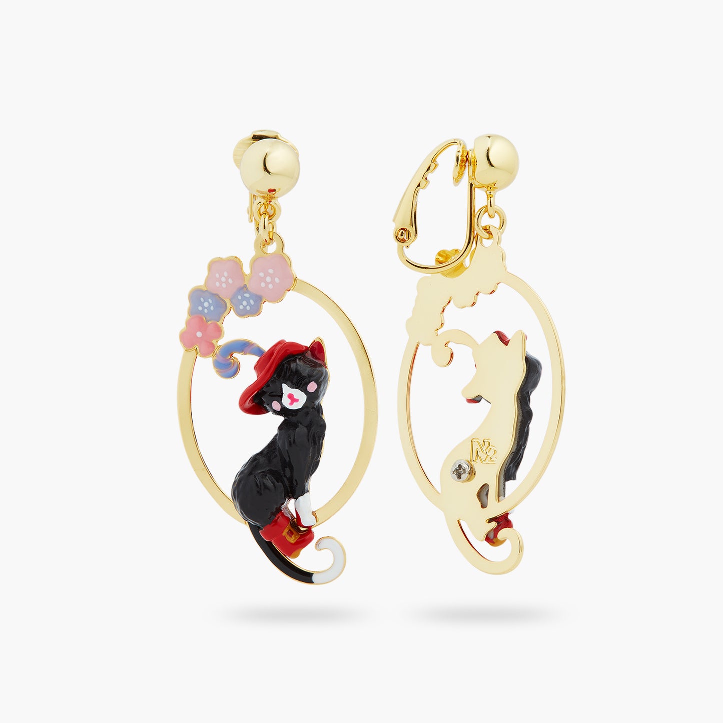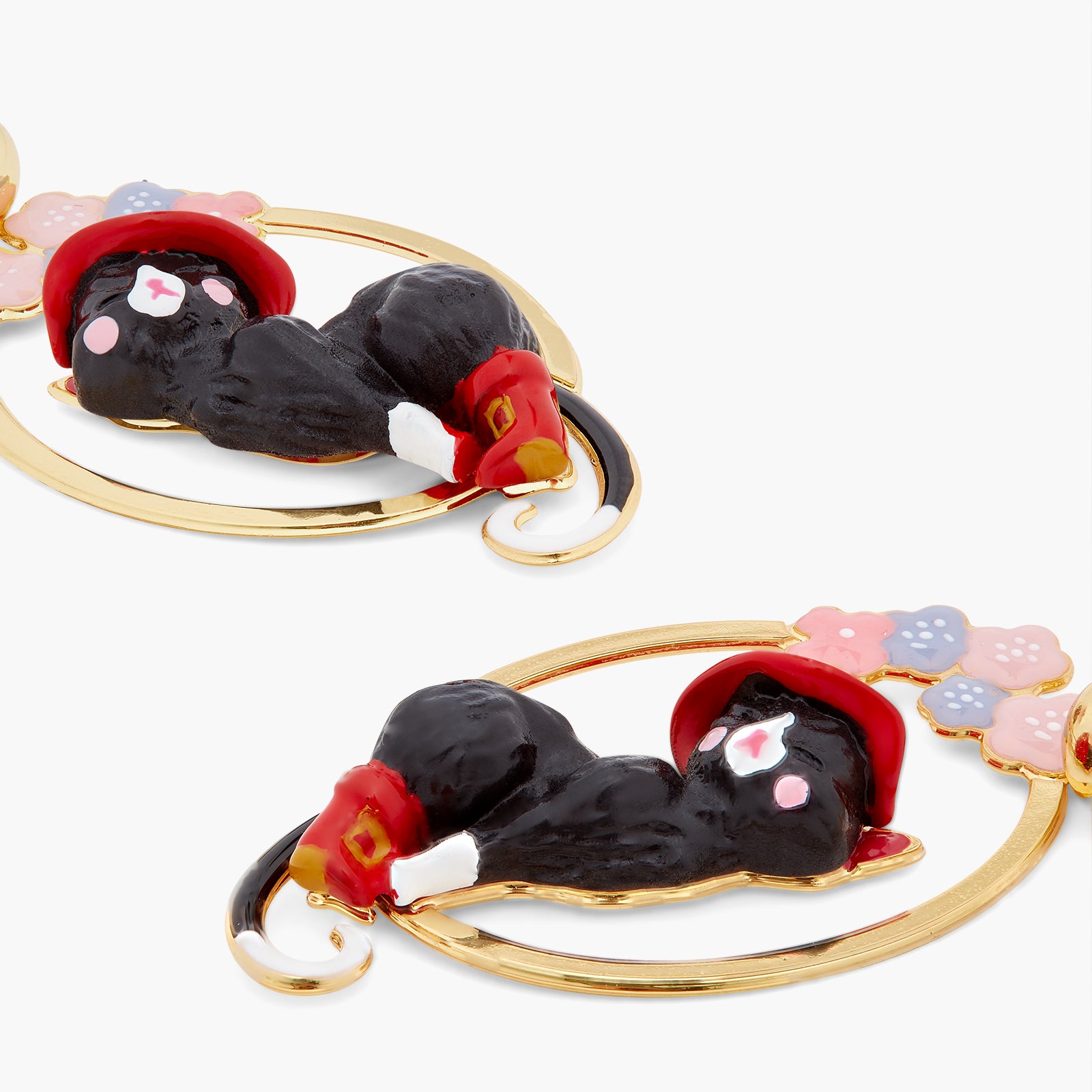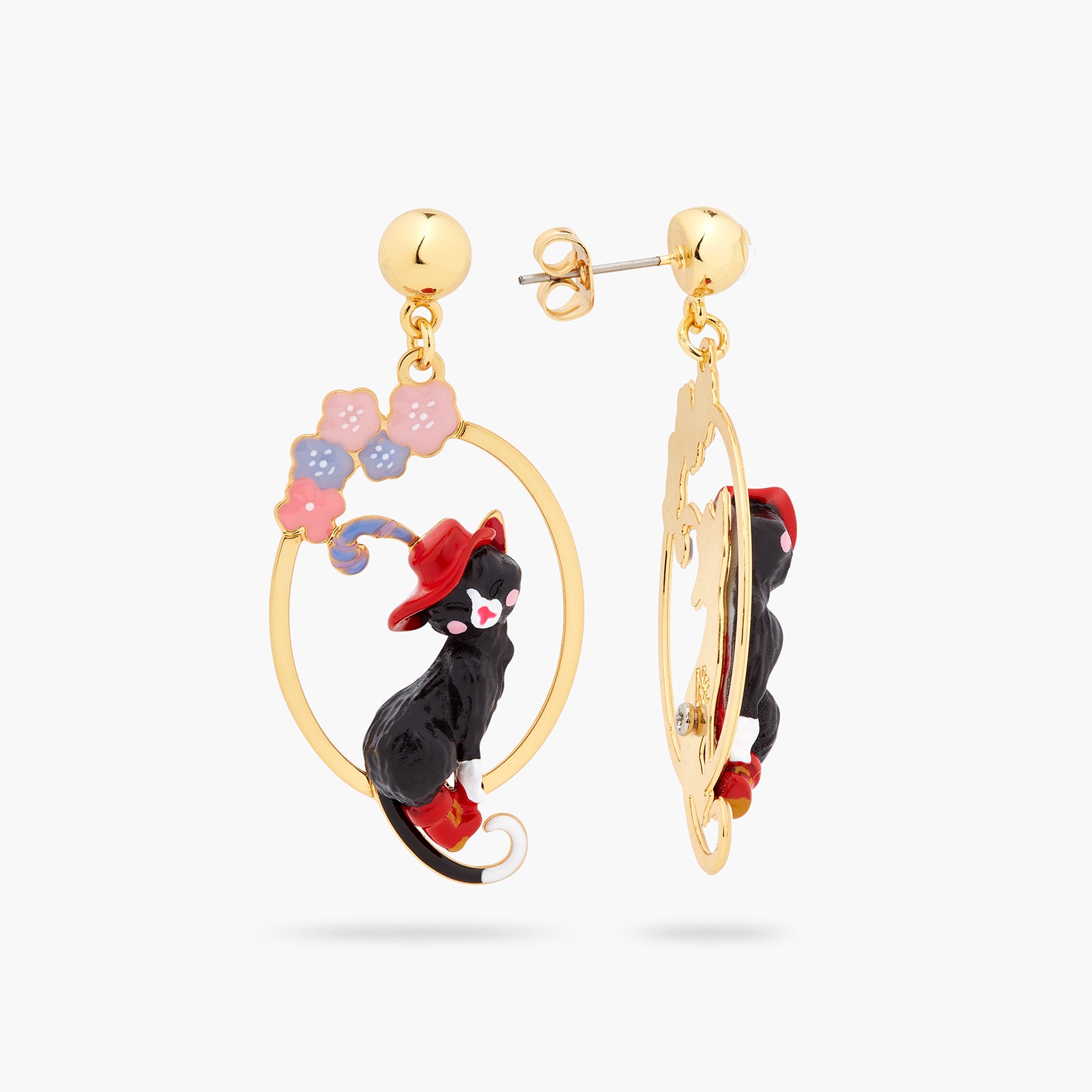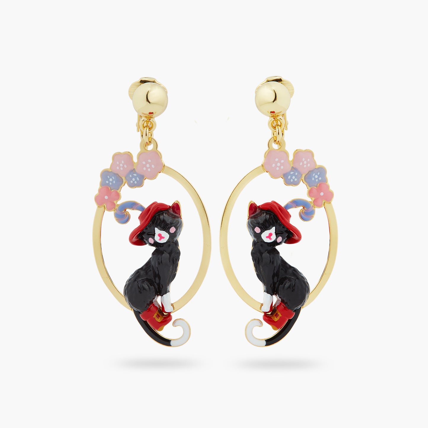 At the heart of this exquisite oval openwork design, you'll find the charming Puss in Boots, donned in his iconic boots and a striking red hat embellished with a feather. He is encircled by stunning flowers featuring pastel blue and pink petals, infusing a playful element into this designer piece. Pair these earrings with the delightful cat and flower pendant necklace for a style that exudes whimsy. Crafted from gold-plated brass, hand-enamelled resin, and crystal pearl bead.
