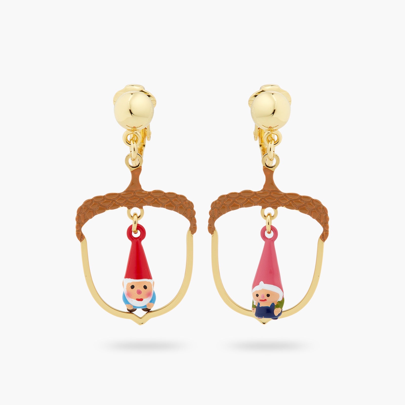 Experience the irresistible charm of the famous gnome couple from The Toadstool Family with this exquisite pair of clip-on earrings. These enchanting earrings feature the couple proudly hanging by their colourful headdresses, delicately suspended under a hazelnut-shaped openwork design.
