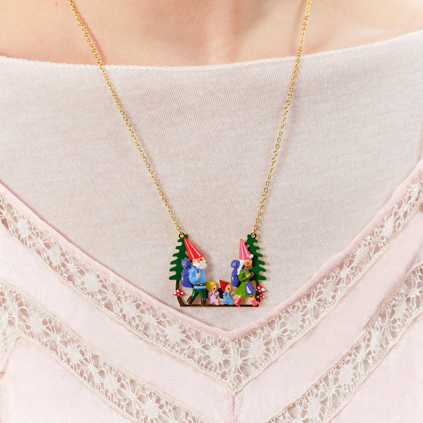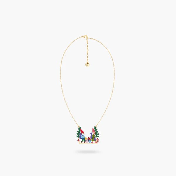 Step into a world of high-fantasy with our exquisite Toadstool Family Statement Necklace. This stunning piece features the charming gnomes of the Toadstool Family as they embark on a walk through the enchanting forest. Surrounded by lush green leafy trees and vibrant red mushrooms, this necklace captures the whimsical beauty of nature.