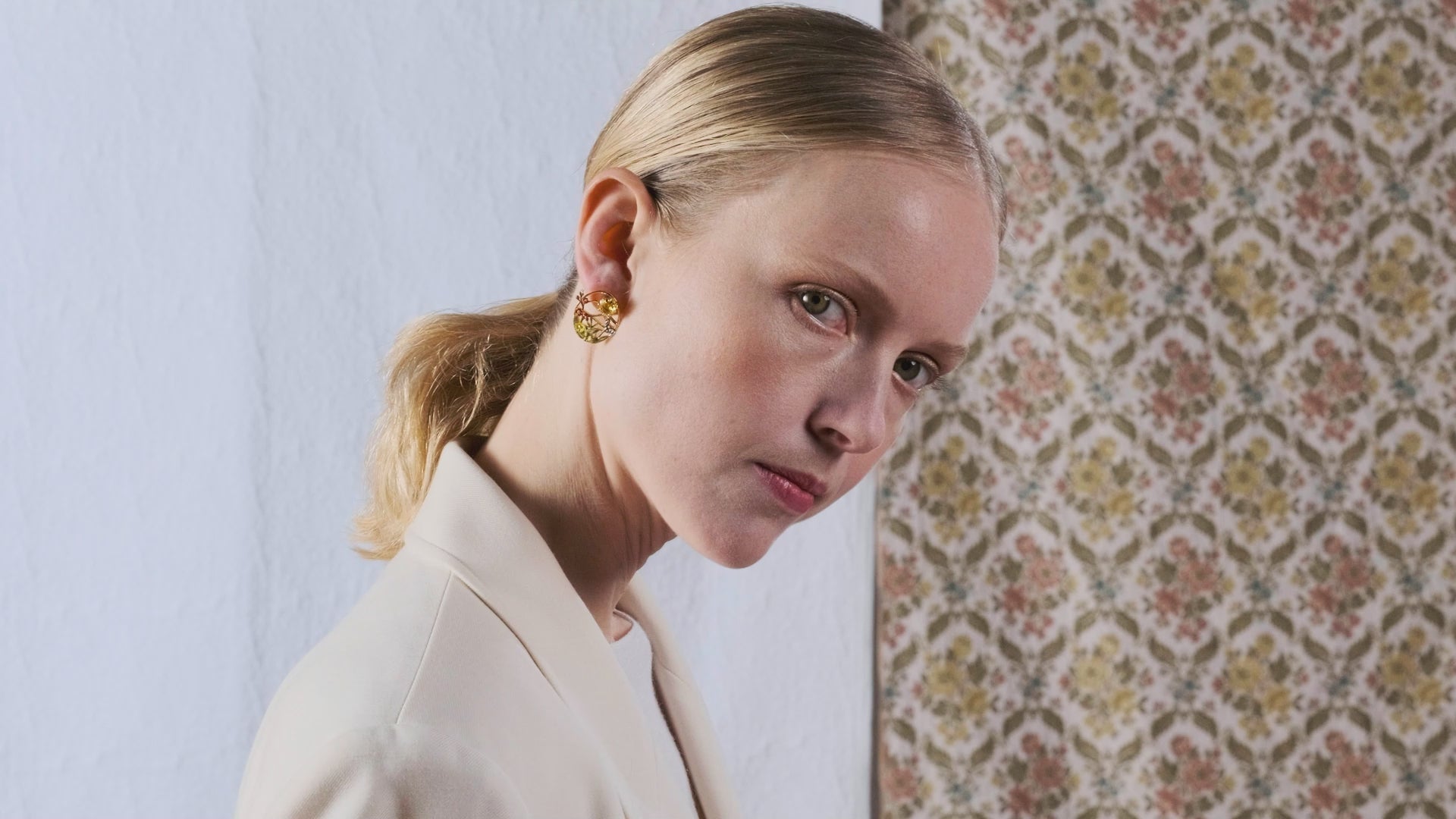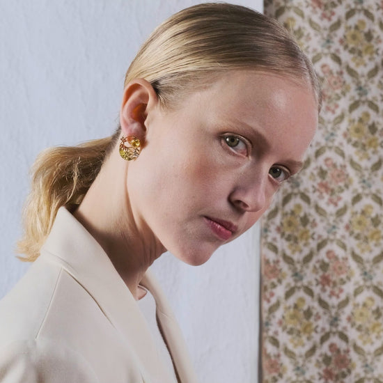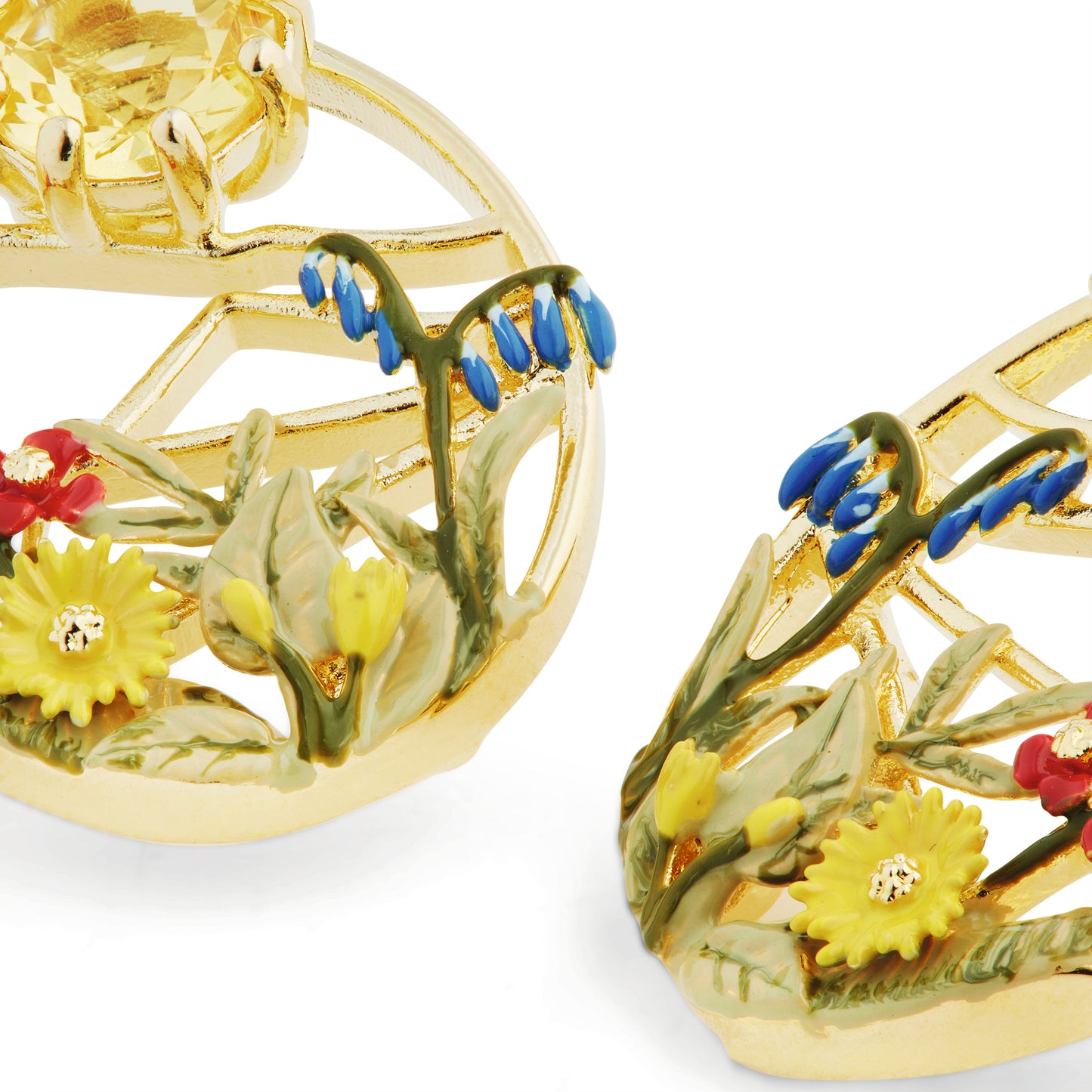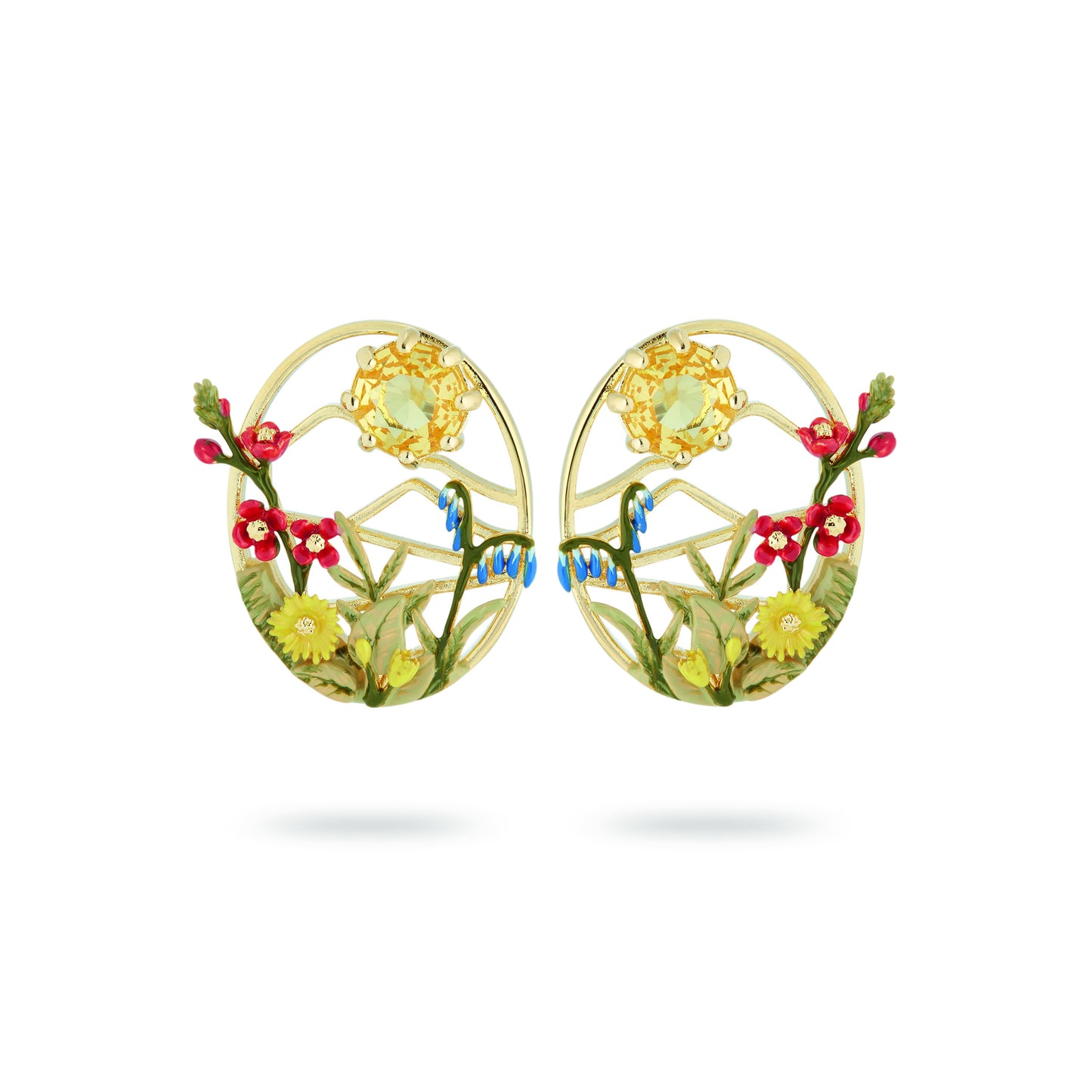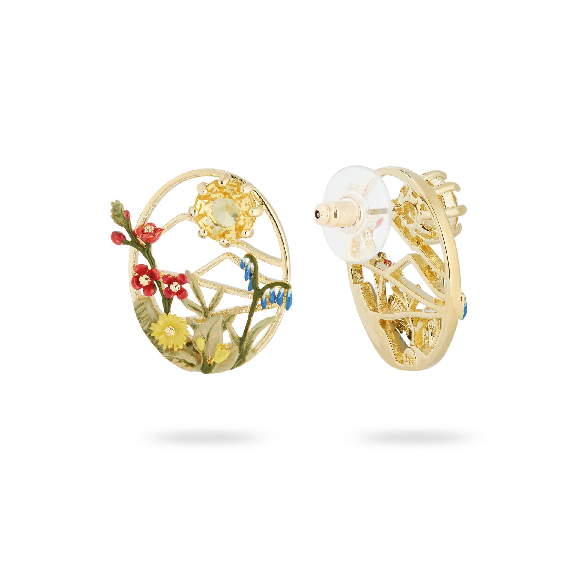 Feast your eyes on the Mount Fuji and round stone earrings, where a breathtaking landscape is revealed within a golden oval. The faceted yellow crystal symbolizes the sun, the golden lines portray majestic mountains, and in the foreground, dandelions, hyacinths and crocosmias sway elegantly. Whether for a special evening, a formal event or simply to elevate your everyday attire, this pair of fashionable earrings is the ideal accessory. This piece of jewellery from the Rising Sun collection is designed for those who value natural beauty and timeless elegance.