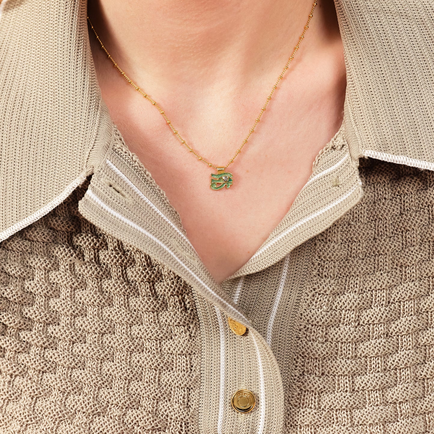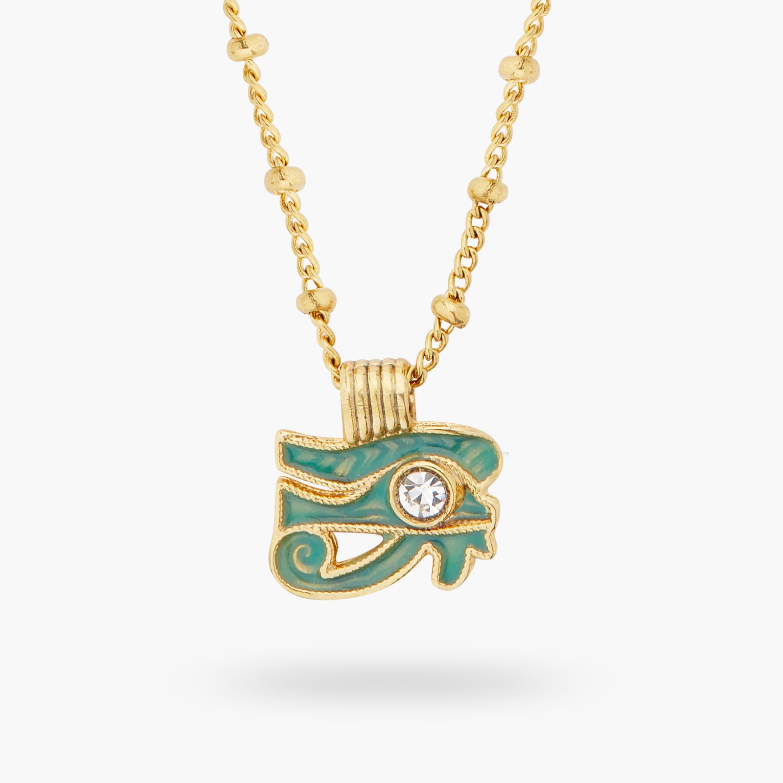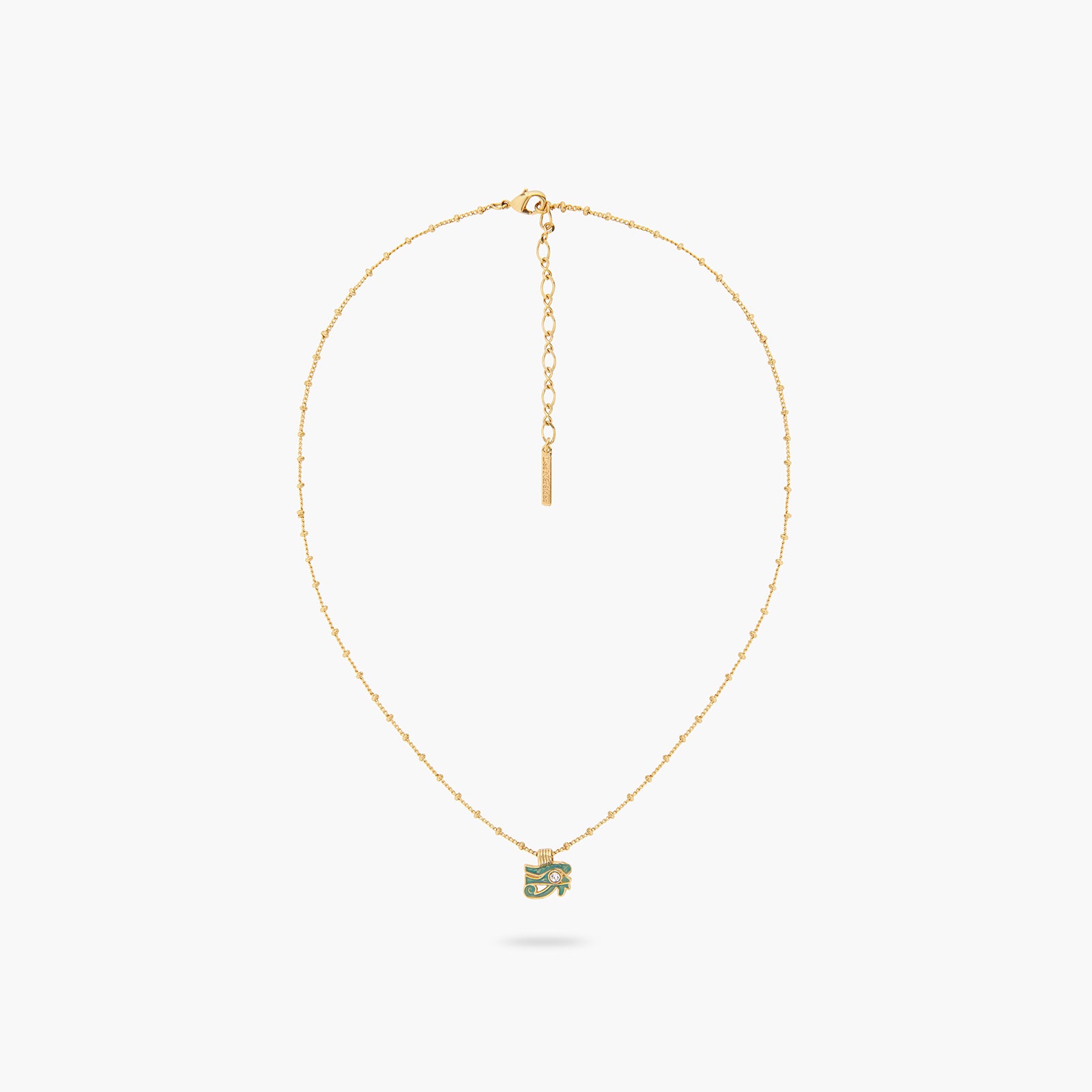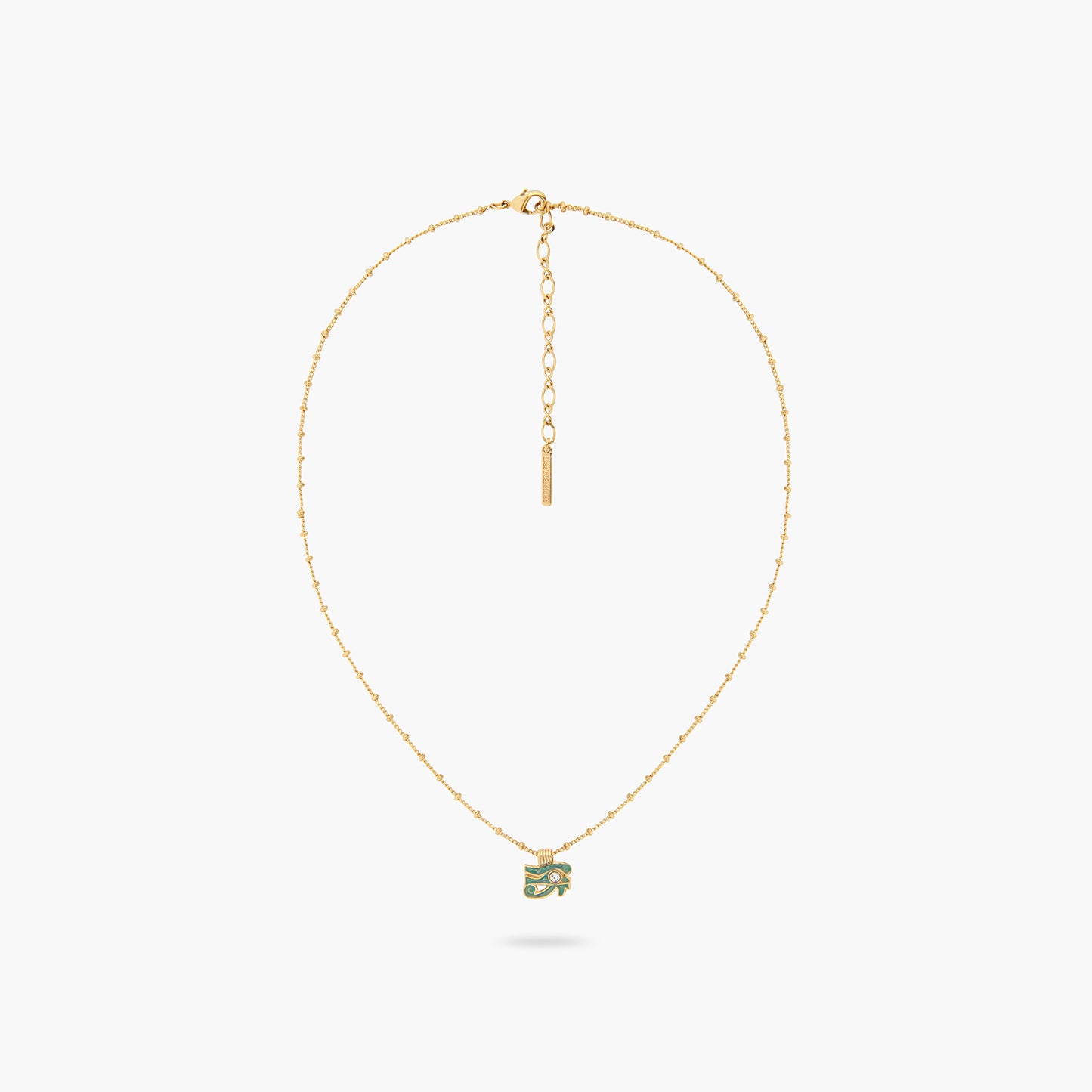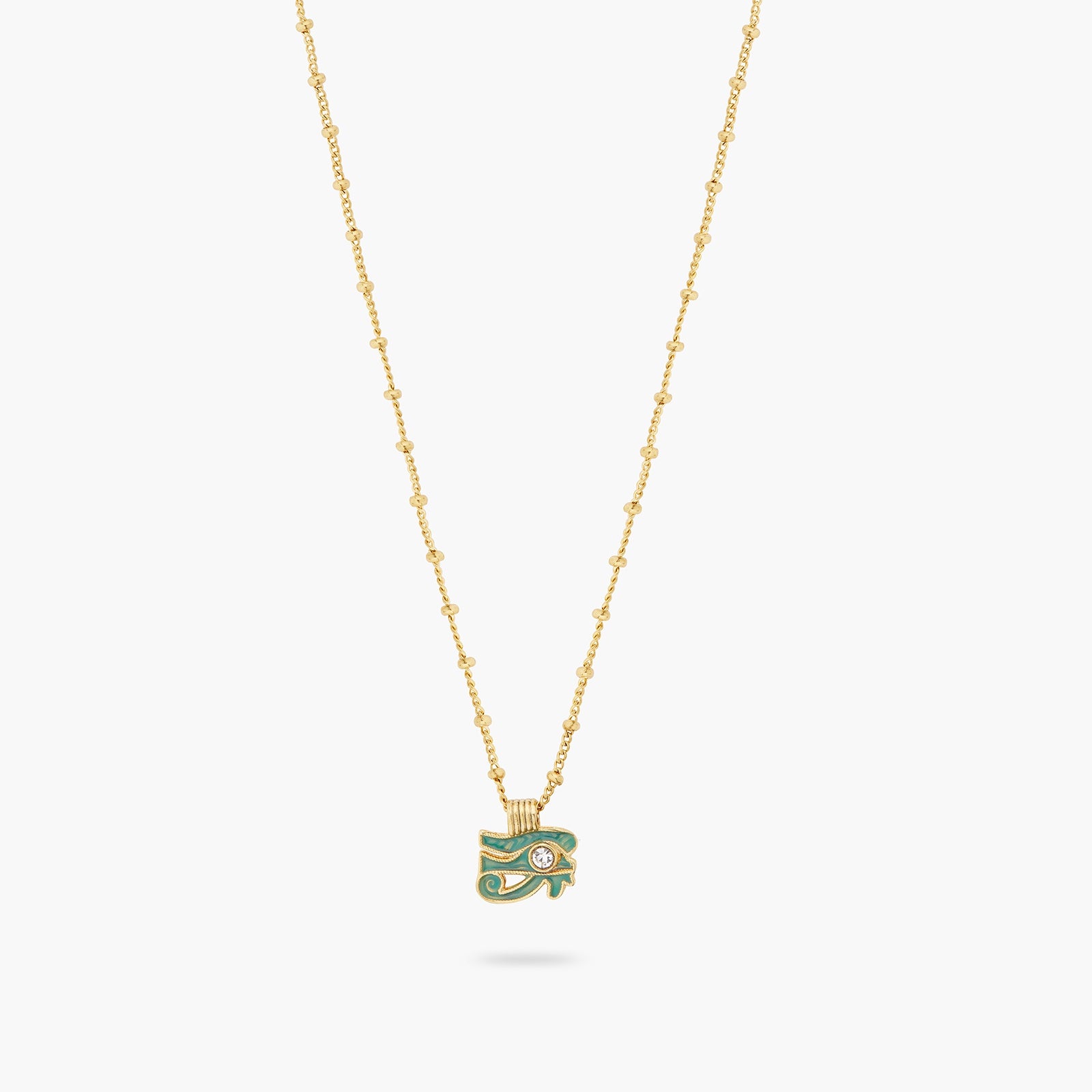 The Evil Eye pendant necklace is a distinguished piece from the esteemed Mystery of the Nile collection. This necklace showcases a gold-plated chain adorned with pearls. The pendant is painstakingly hand-enamelled in a stunning bluish-green hue, reminiscent of the grandeur of the sea. When worn, it envelops you in a tranquil energy, fostering inner peace and resilience. The Evil Eye symbolizes self-assurance and the power to surmount challenges. Donning this fashionable necklace can be a statement of your readiness to tap into your personal strengths to progress in life. This necklace can also serve as a thoughtful gift for someone navigating a time of change or recovery, as a token