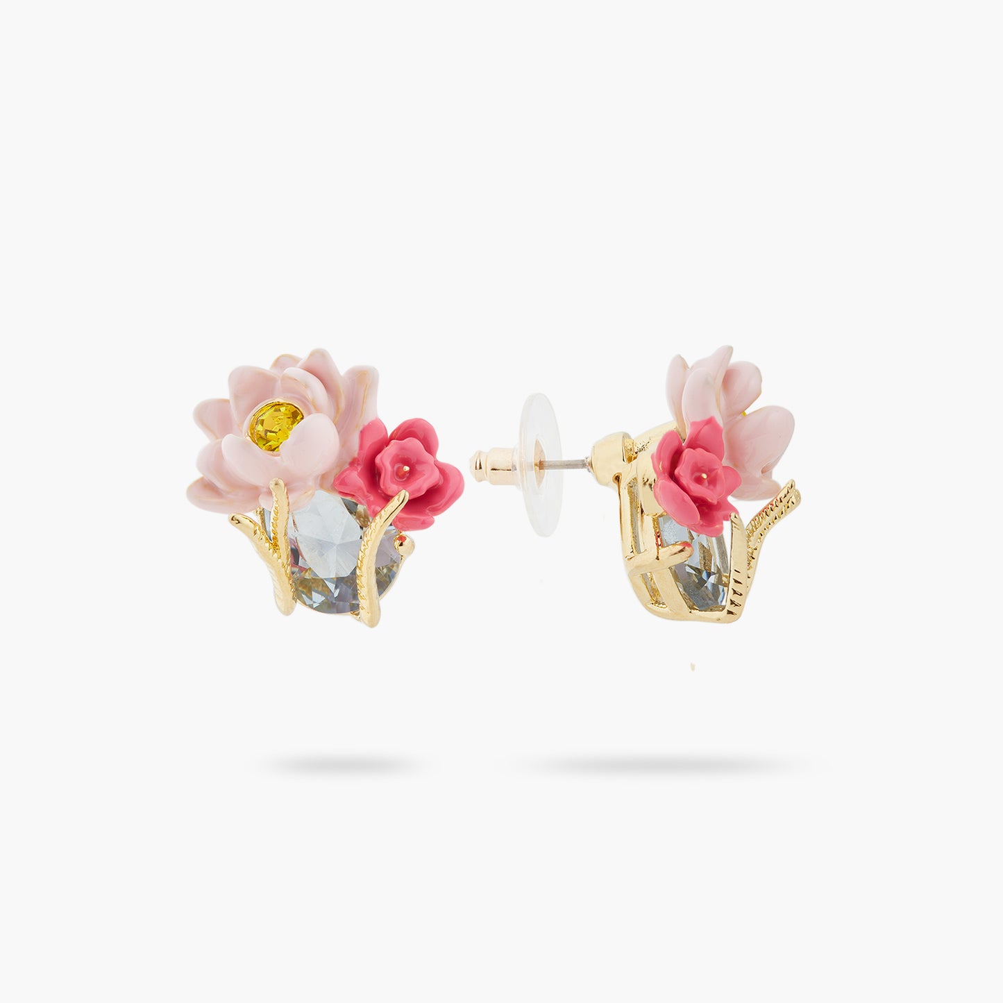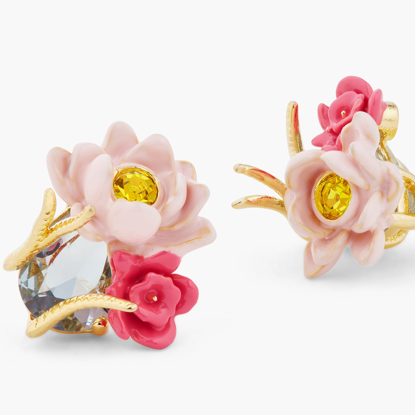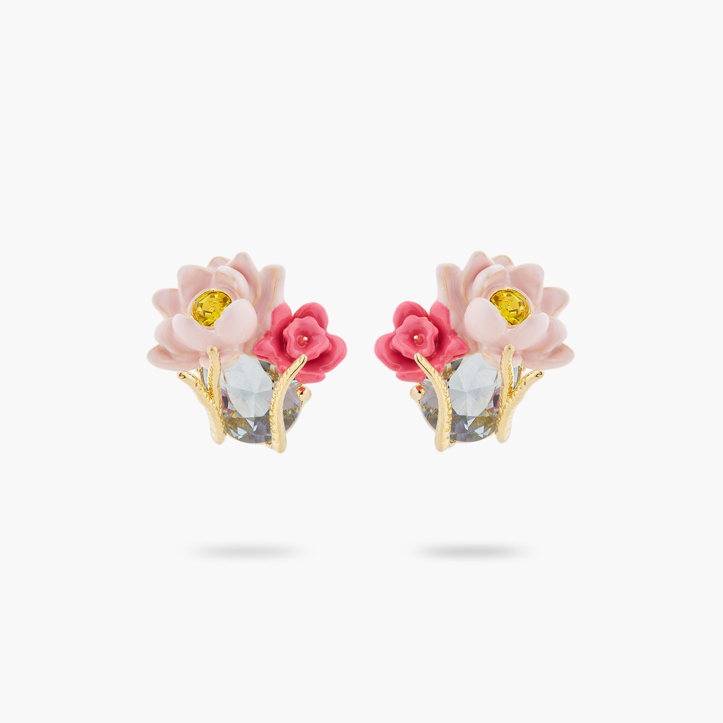 These pink lotus and aquamarine-coloured stone post earrings from the Serene Ripple costume jewellery set are pieces of rare elegance and great finesse. Inspired by the thousand-year-old landscapes of the Japanese regions, they will bring a touch of exotic and poetry to your outfits. The delicate and refined pink lotus seems to float on the aquamarine faceted crystal stone, adding a touch of colour and light to these earrings. The contrast between the pink colour of the lotus and the blue colour of the stone is also found on the pink lotus and aquamarine stone pendant necklace from the same collection.