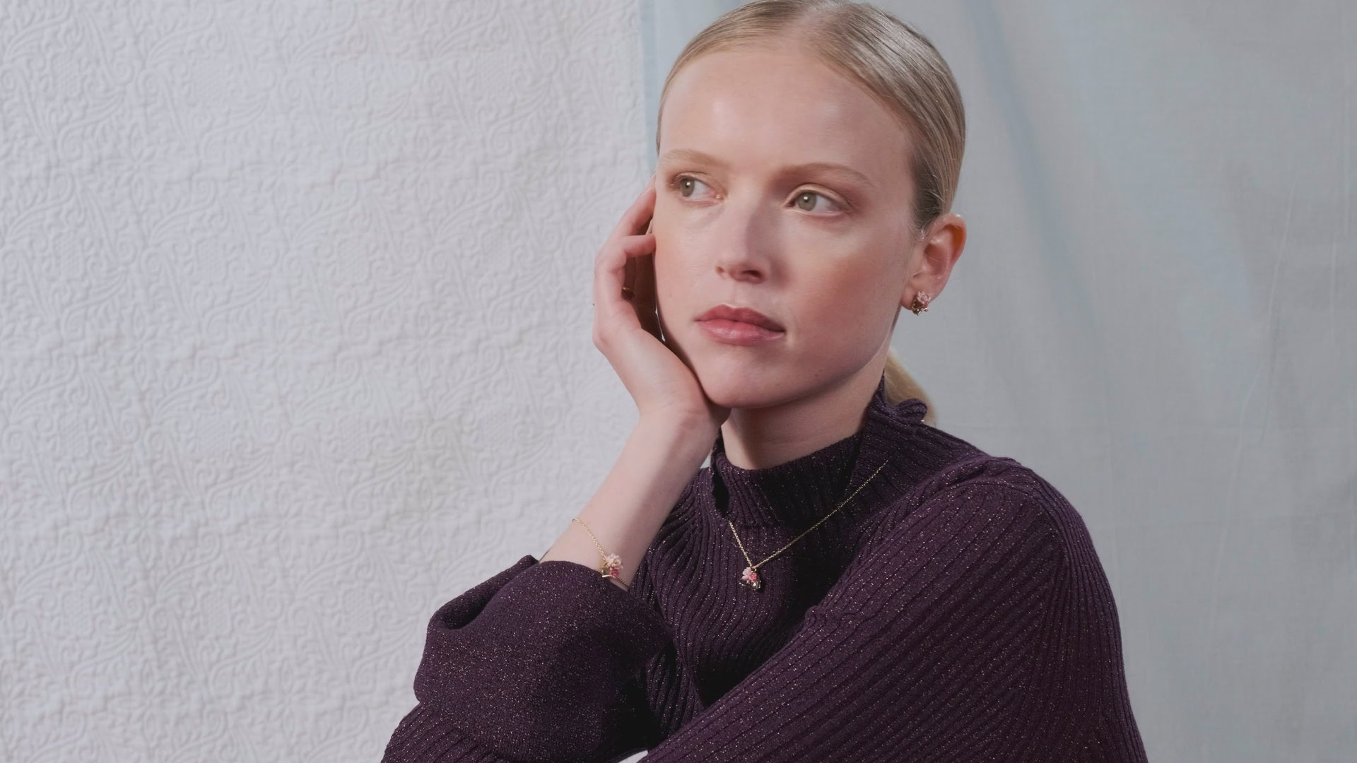 Gold-plated brass, hand-enamelled, faceted crystal.