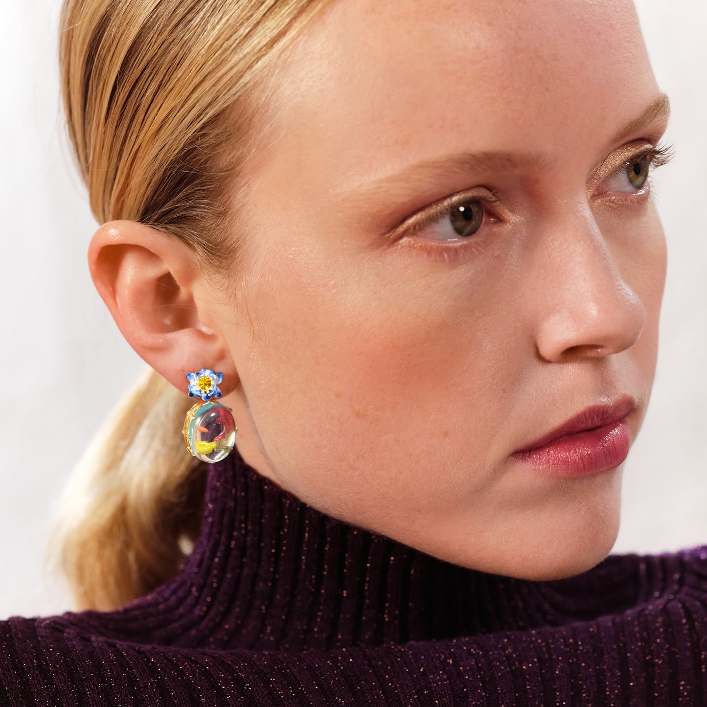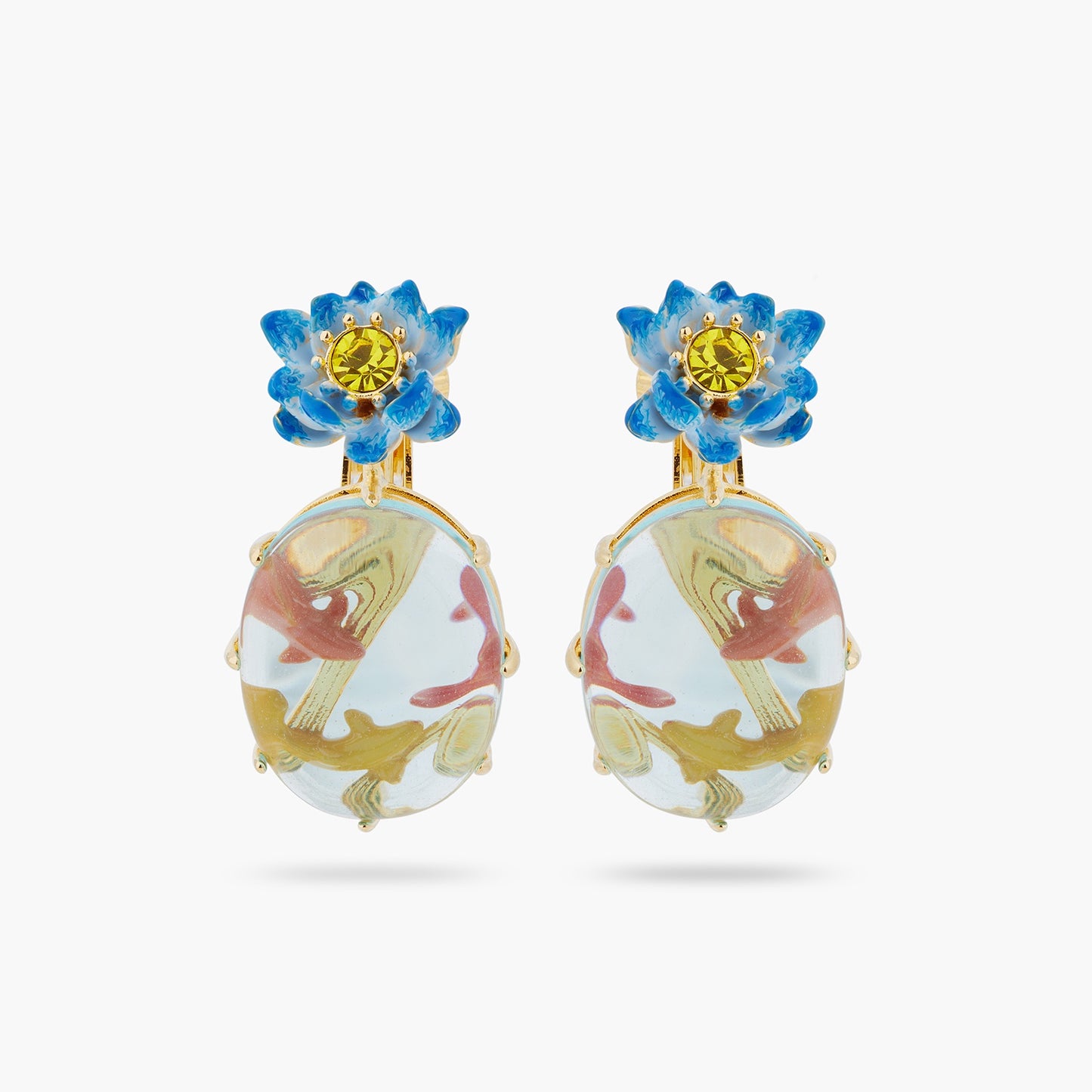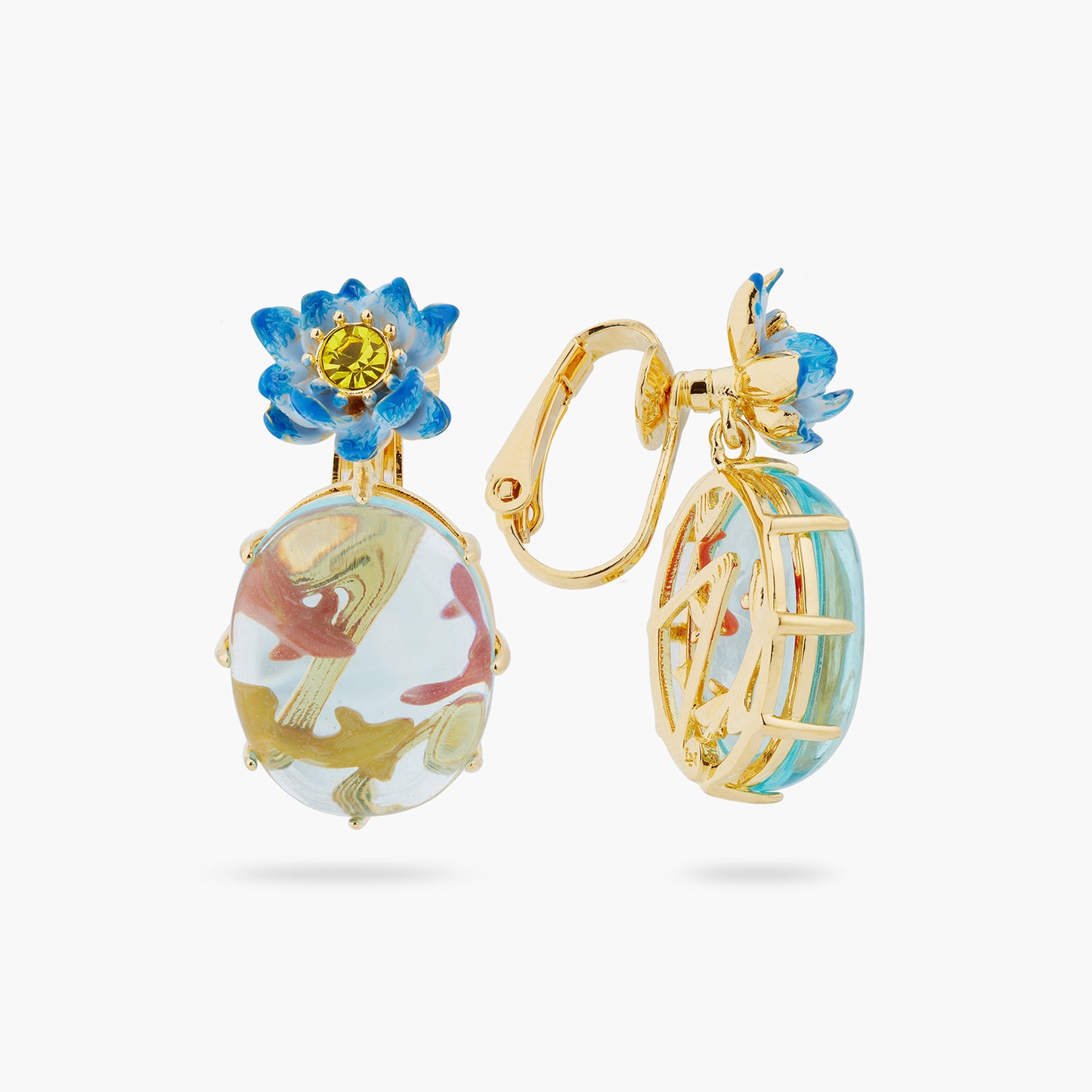 Welcome to the land of the Rising Sun with the Serene Ripple set which offers this very unique pair of blue lotus, oval crystal and koi fish clip-on earrings. A hand-painted blue lotus holds an oval of aquamarine-coloured crystal, inside of which an orange and yellow trio of koi fish swim peacefully. You can discover the whole set on our online store, and match these earrings with other jewels from the same collection for a coordinated and stylish look.