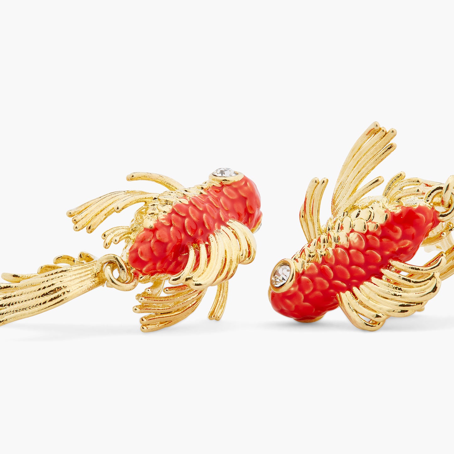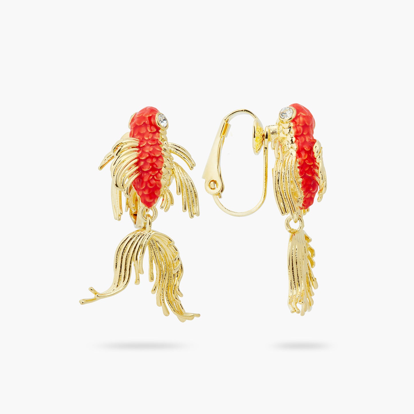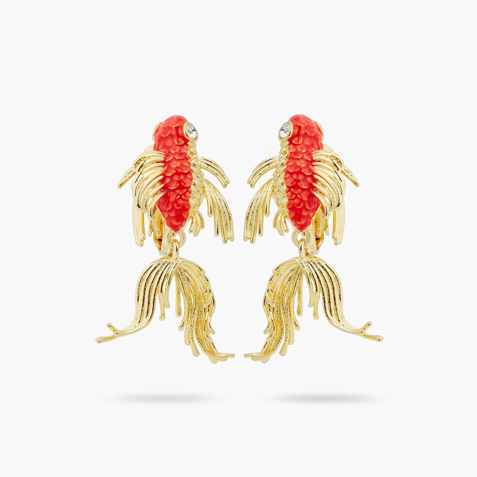 You are invited to the land of the Rising Sun to discover this unique pair of koi fish clip-on earrings. Part of the Serene Ripple collection, these earrings represent an undulating koi fish with an orange body and golden fins. This unique Les Néréides jewel will be a great gift for those who love creative jewellery and those who are interested in Japanese aesthetics. For a total Japanese look, choose the koi fish brooch trendy accessory to be attached to a jacket lapel or a scarf.