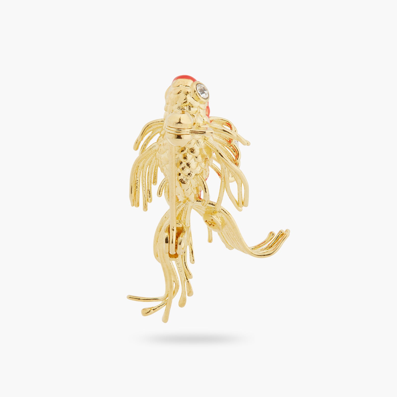 Description This unique brooch features a red-orange Koi fish with billowing golden fins. The details of the curved fins are carefully crafted to highlight the subtle movements of the koi fish. Two bright crystals add a touch of sophistication to this women's costume jewellery piece, ideal for embellishing your blouse or scarf.