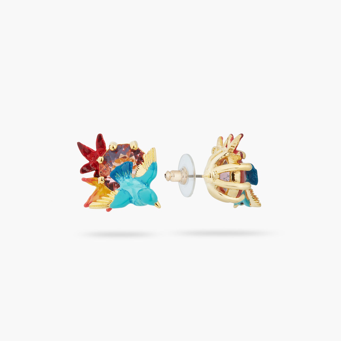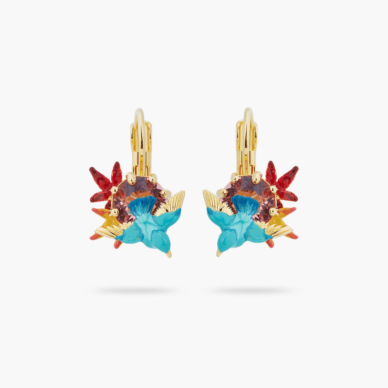 The centerpiece of these earrings is a stunning kingfisher, delicately hand-enamelled in blue and gold feathers. Its majestic flight above a round red faceted crystal creates a striking contrast, capturing the essence of these emblematic birds in all their glory.