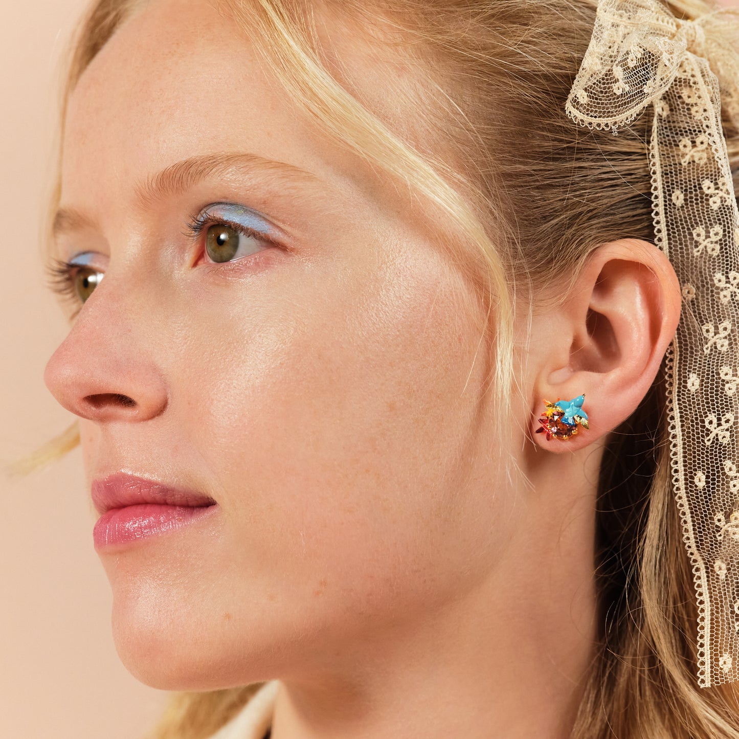 Experience the beauty of nature with these exquisite kingfisher, maple leaf, and round stone earrings from Les Nereides. Crafted with meticulous attention to detail, these earrings are a true ode to the wonders of the natural world.