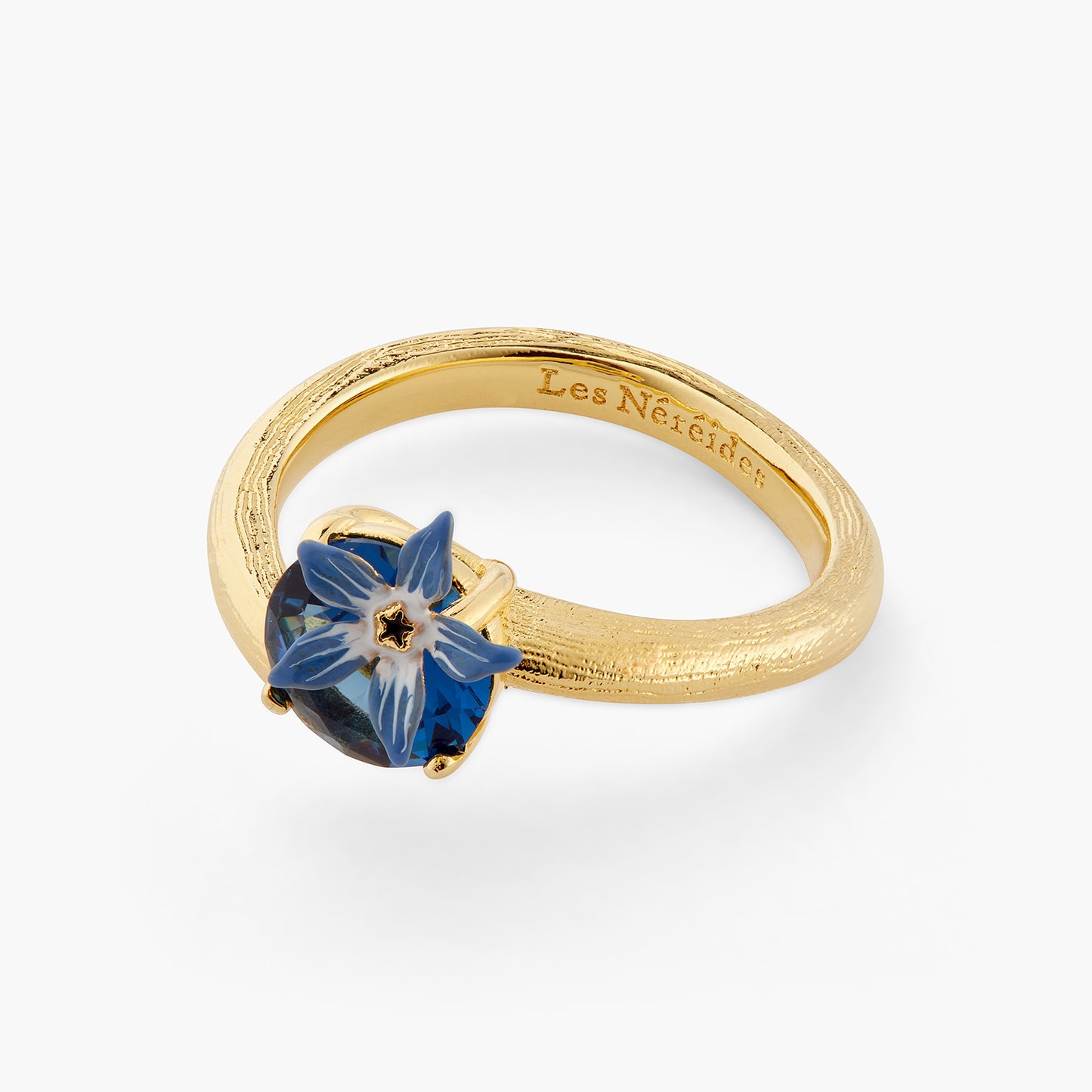 Emanating elegance and sophistication, this ring is a part of the Wonderful Vegetable Garden collection. It boasts a fine gold-plated band, an intense midnight-blue stone, and a borage flower, all of which conjure up images of enchanting gardens. The refined beauty of this ring is a testament to the exceptional craftsmanship of La Maison Les Néréides. Pair this high-end costume jewellery ring with the blue flower and round stone earrings and the blue flower and round stone pendant necklace for a harmonious set. Crafted from gold-plated brass, it is hand-enamelled and features a faceted crystal.
