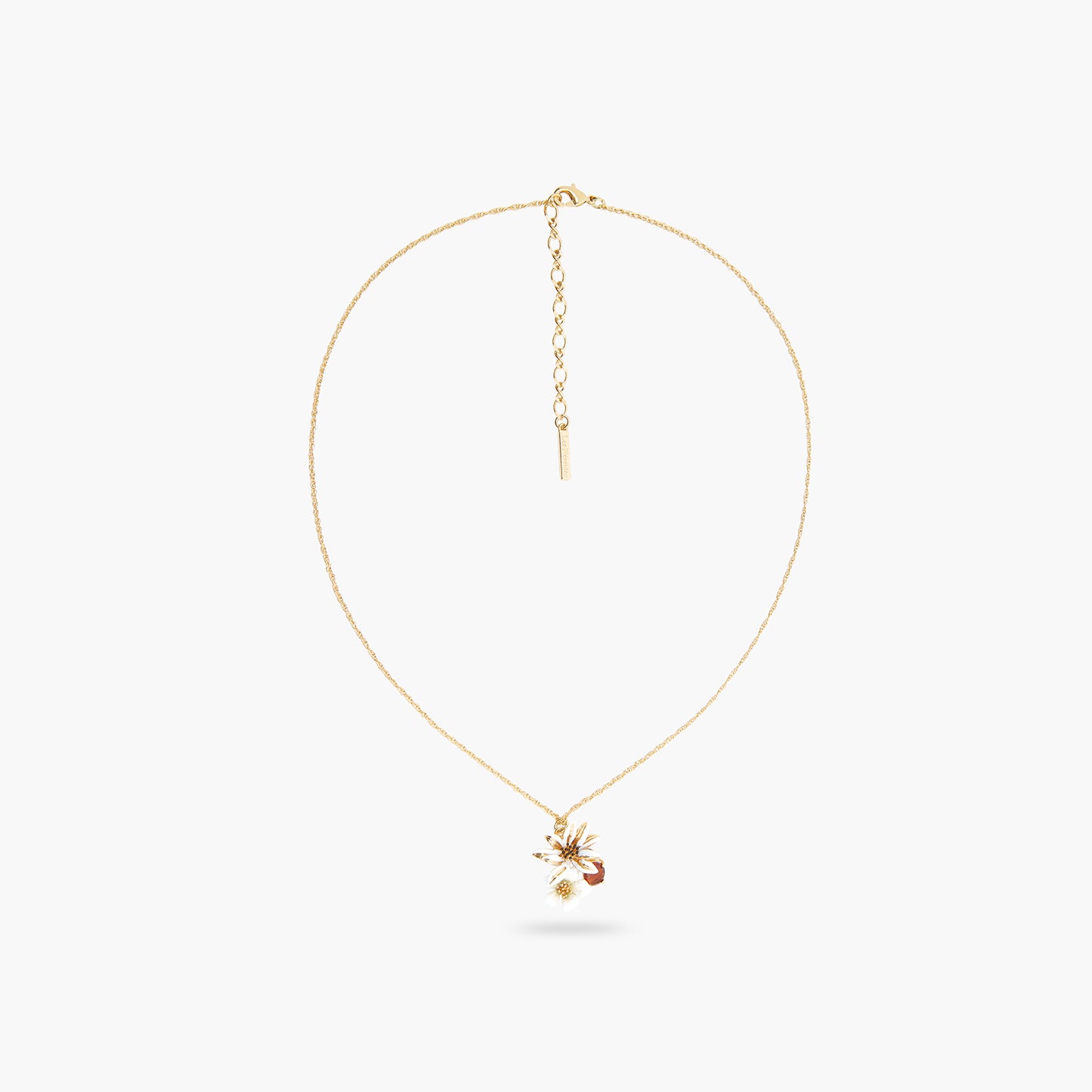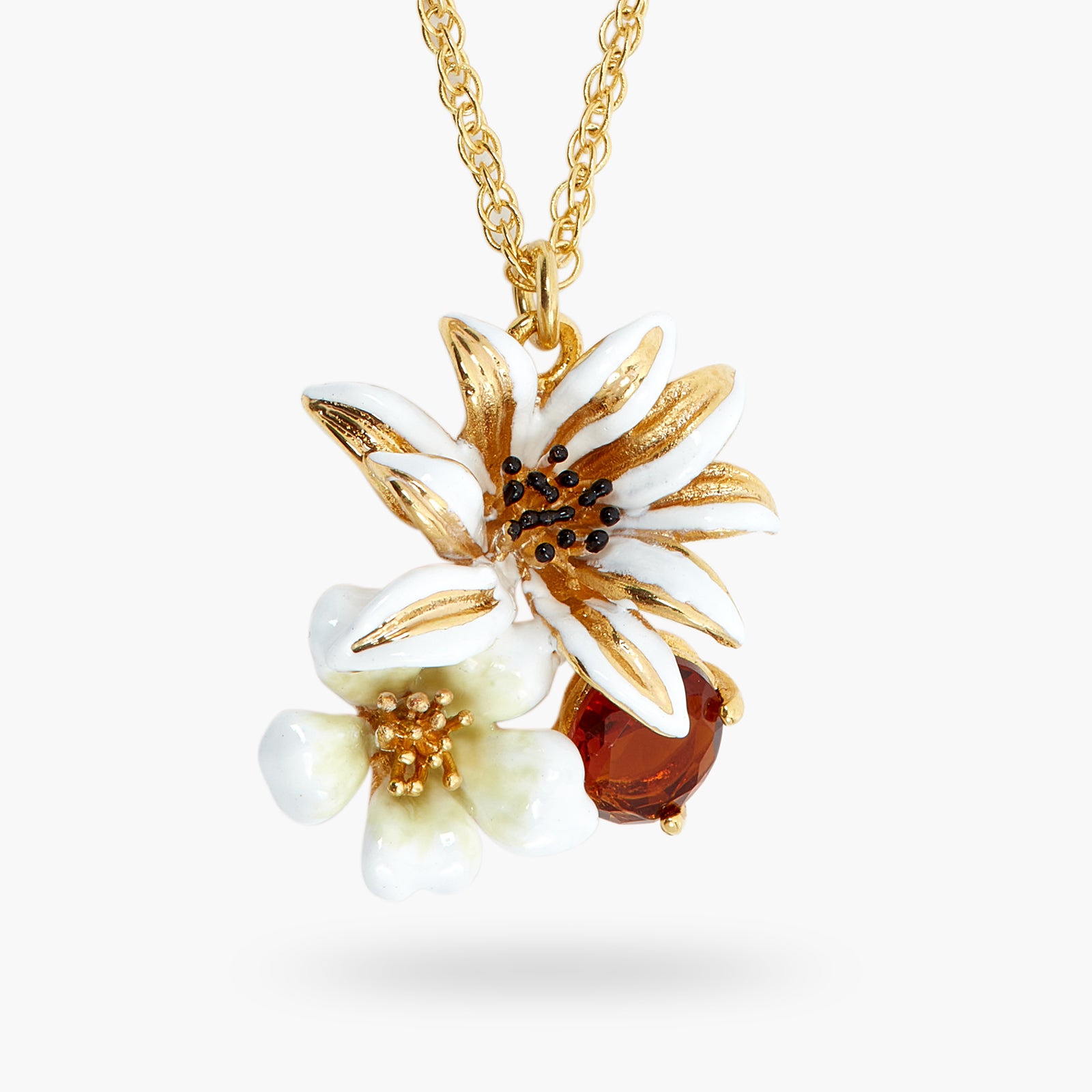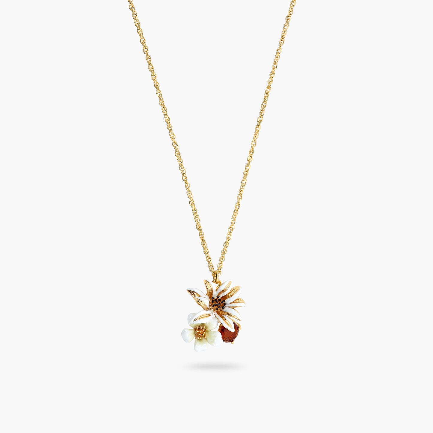 This flower pendant, suspended from a delicate gold-plated chain, adds a refined, sleek look to the person who wears it. Its two gold and white flowers, with open petals, are beautifully arranged on a round faceted crystal that catches the light beautifully. To follow the trend of layering necklaces, you can wear it with another necklace in the collection, such as the white, gold and blue flowers pendant necklace. Made from gold-plated brass and hand-enamelled for a unique touch.