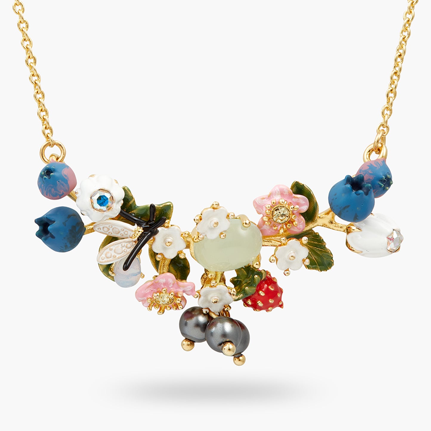 This plastron necklace attracts the look with its striking brilliance from a olive green carved crystal stone, dazzling with mystery. Around this enigmatic gem flourished with delicate flowers harmoniously mixing white and pink tones in a bewitching floral ballet. Within this floral symphony, a white flower is distinguished welcoming a firefly whose sweet light adds a touch of magic to the whole. At each end of the necklace, fine branches stretch decorated with blueberries reminiscent of the freshness of the enchanted undergrowth. These delicate bays adorn this work of art bringing a touch of wild nature and rustic charm to this jewel of timeless elegance. This designer jewel will sublimate all your everyday outfits with refinement. For a harmonious set, combine this plastron necklace with blueberry and beetle clips earrings.