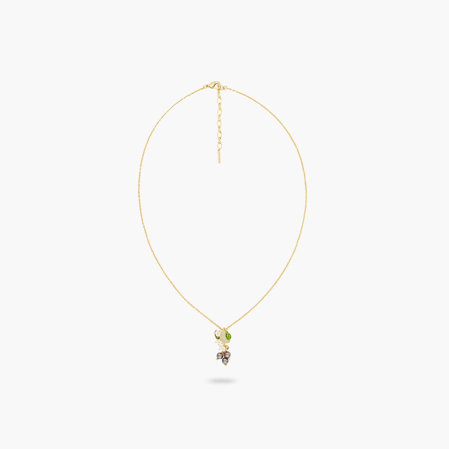 This pendant necklace evokes natural elegance with a round olive green stone, precision cut to reveal all its splendor. This central stone is surrounded by three delicate white flowers carefully arranged. On the other side of the stone is a green scarab symbol of luck and transformation. Just below, suspended like a delicate cascade are deep blue blueberries. The whole evokes harmony between nature and beauty reflecting the essence of the earth with its rich colors and its symbolic elements. This necklace can be worn on a daily basis, and the blueberries that make up this jewel will be delighted with the fine blueberry and beetle bracelet.