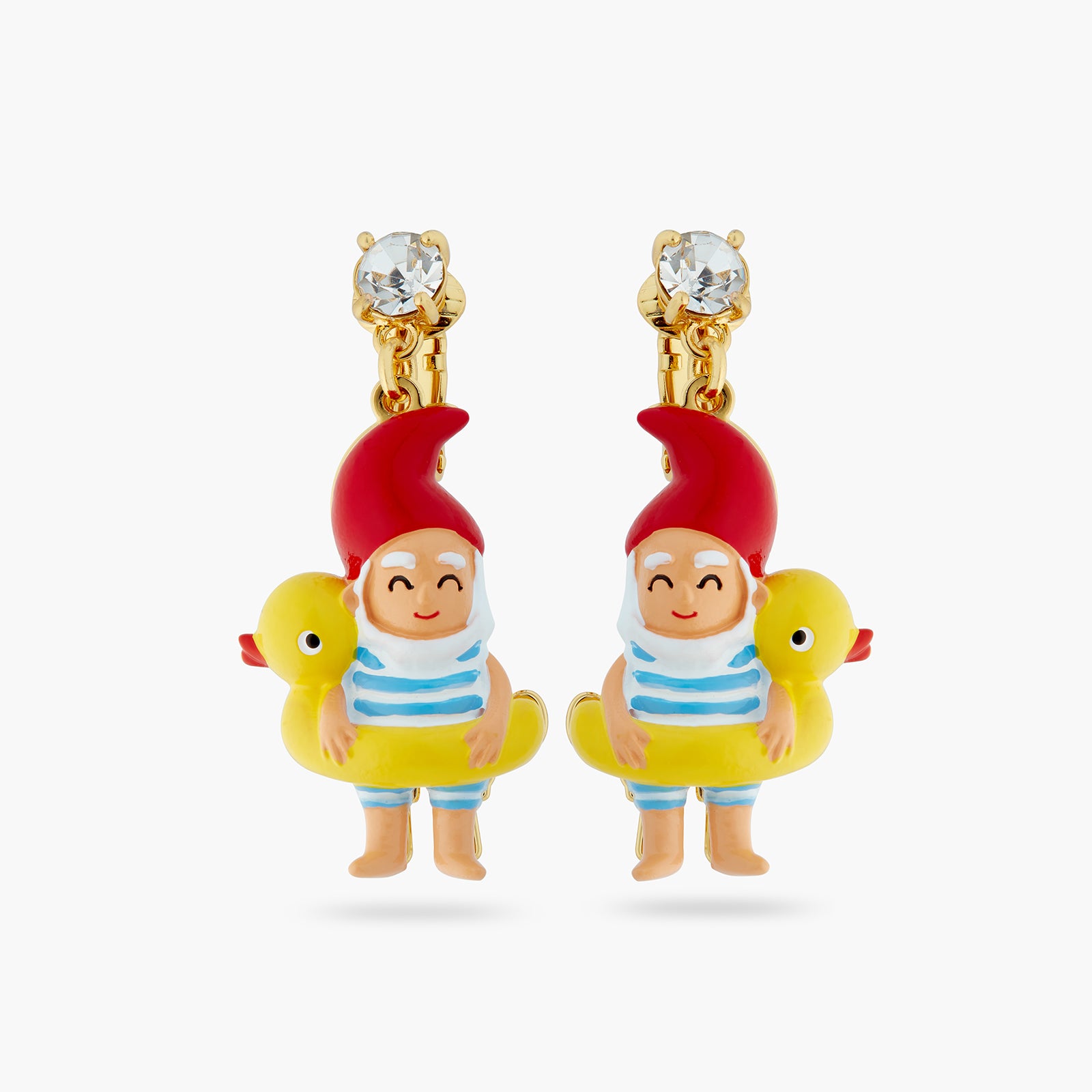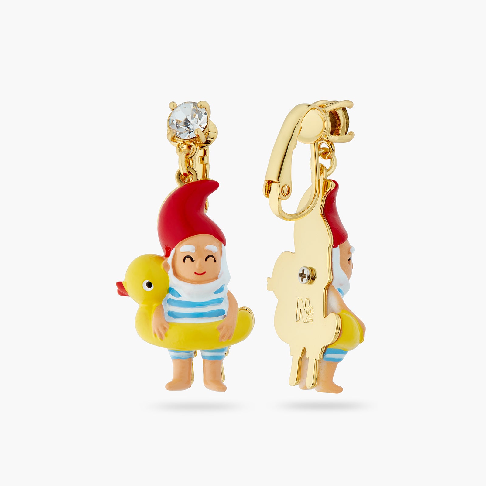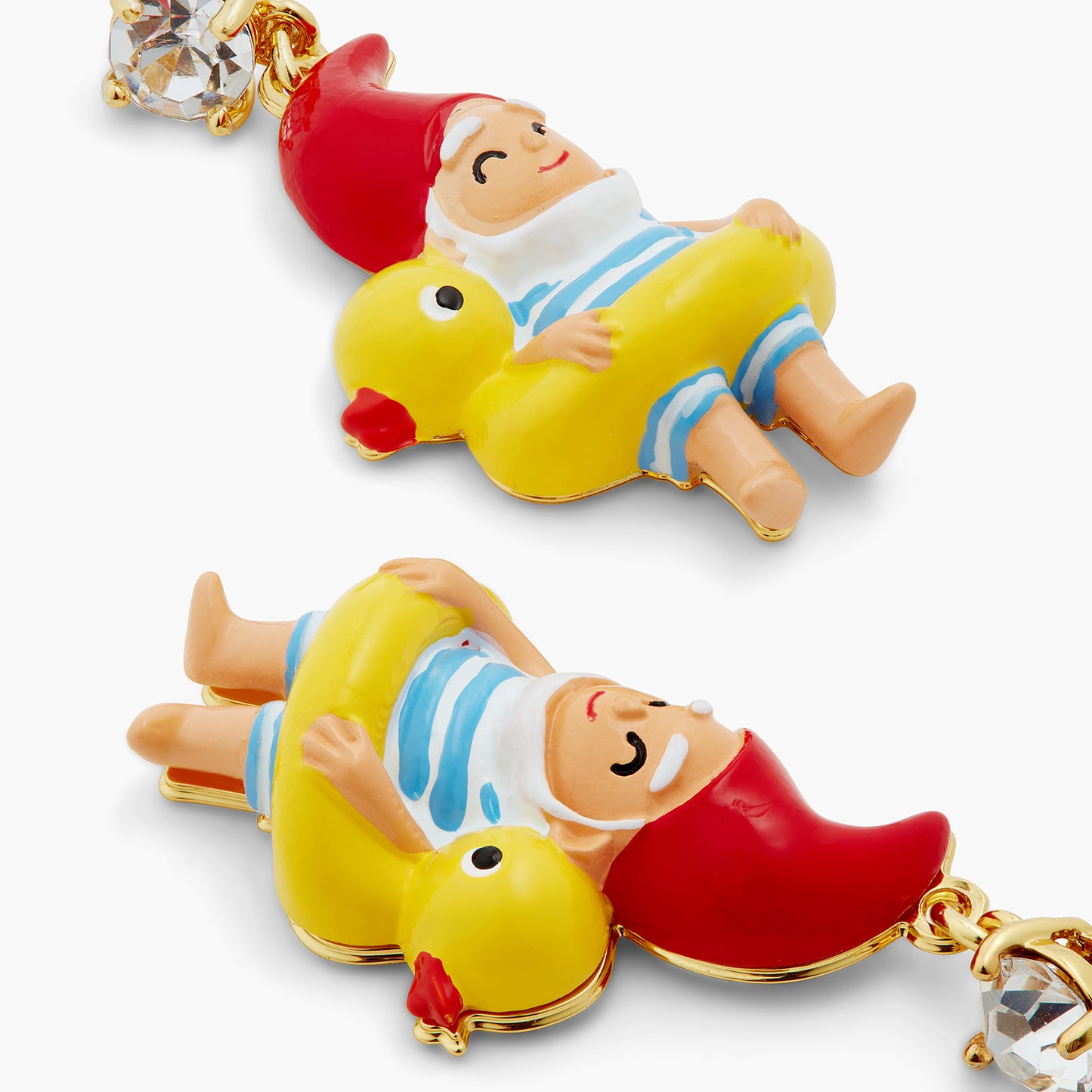 Clip-on earrings, hand-enamelled diving gnome on an inflatable pool ring adorned with a crystal. On the sunny seaside, a family of garden gnomes ventures out onto the beach in awe. This jewellery set matches the Splendour of the Depths and Charms collections.