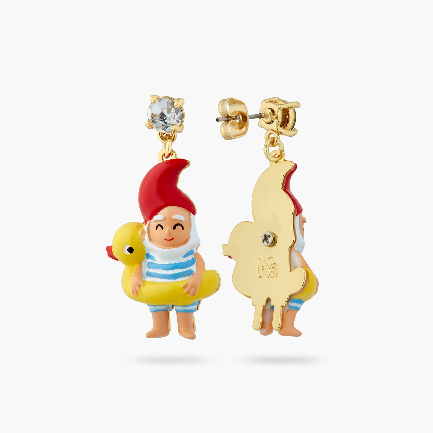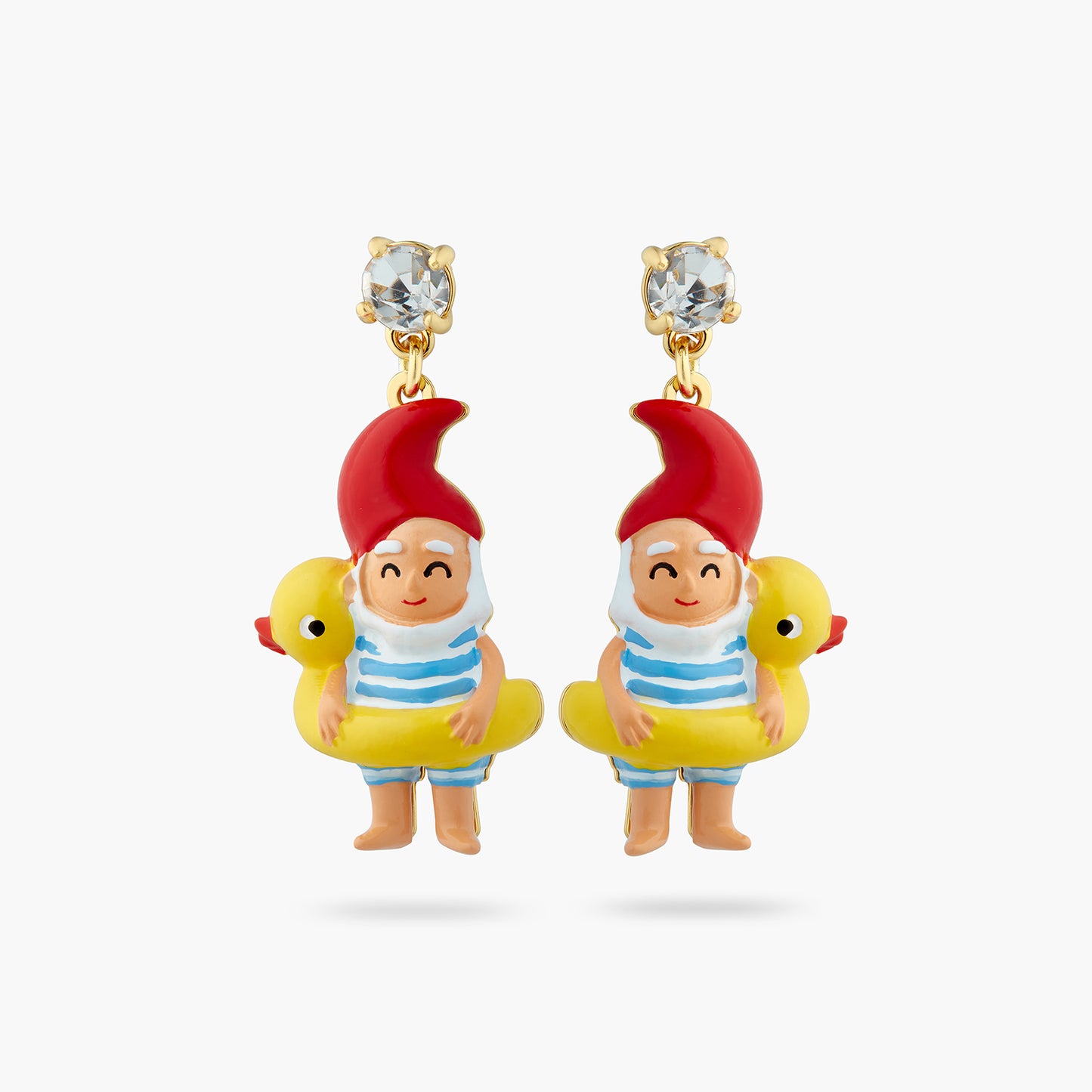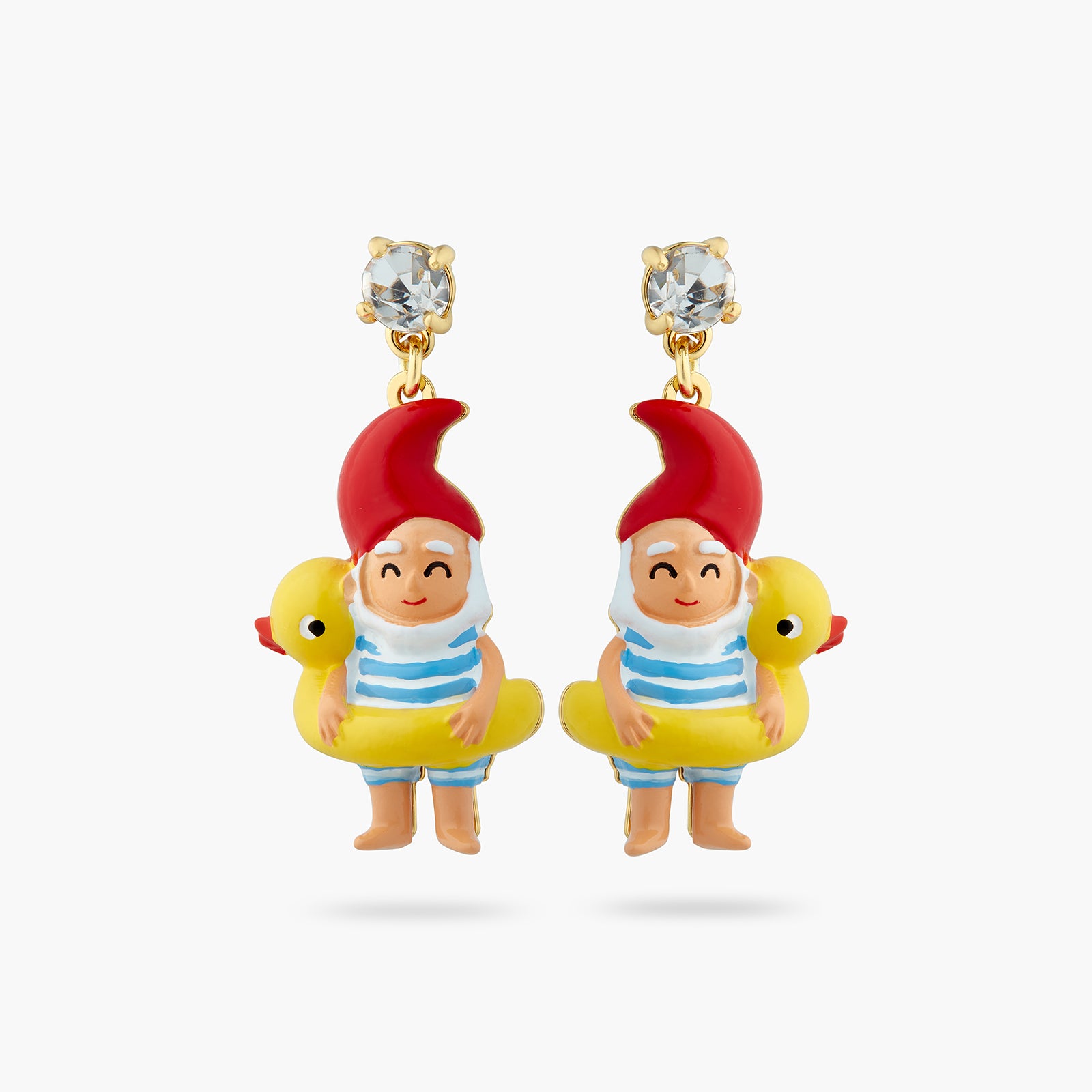 Clip-on earrings, hand-enamelled diving gnome on an inflatable pool ring adorned with a crystal. On the sunny seaside, a family of garden gnomes ventures out onto the beach in awe. This jewellery set matches the Splendour of the Depths and Charms collections.