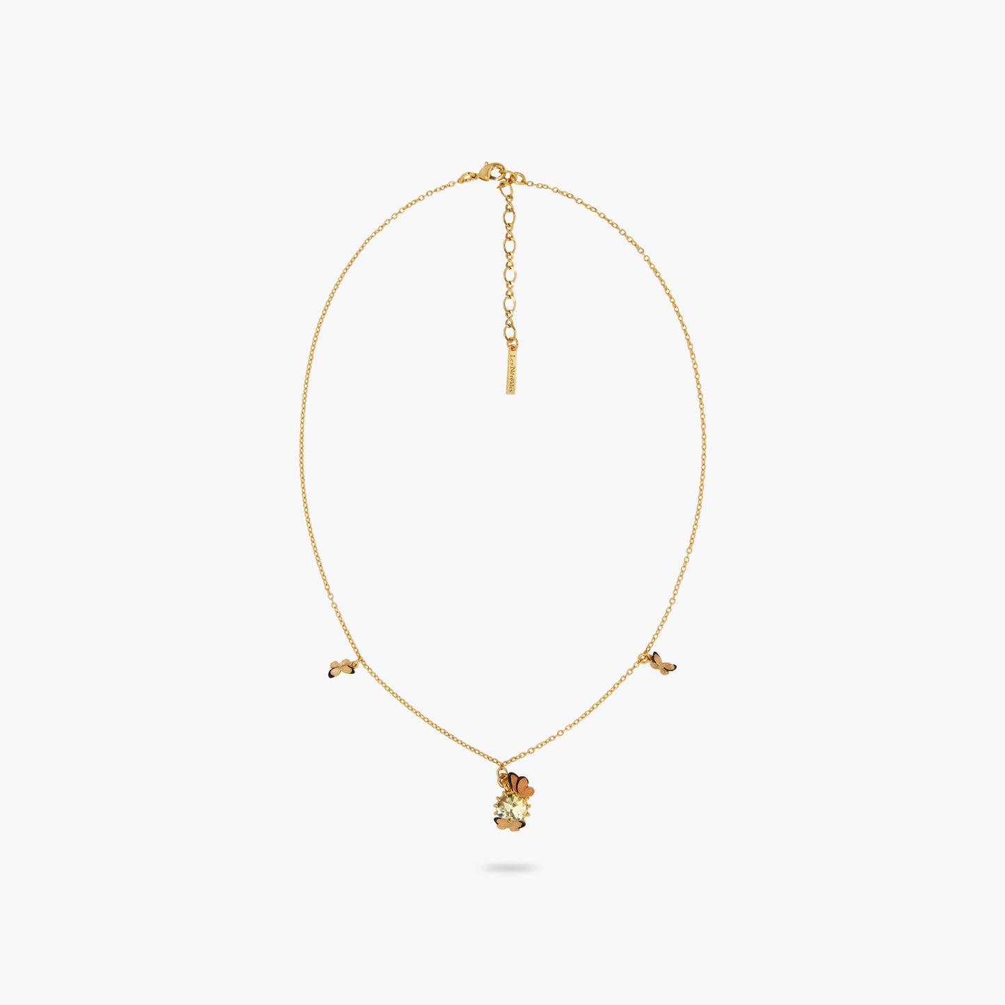 Pendant collar, butterflies enamelled by hand in pastel shades, chain and set in golden brass with fine gold, golden round stone in cut crystal.