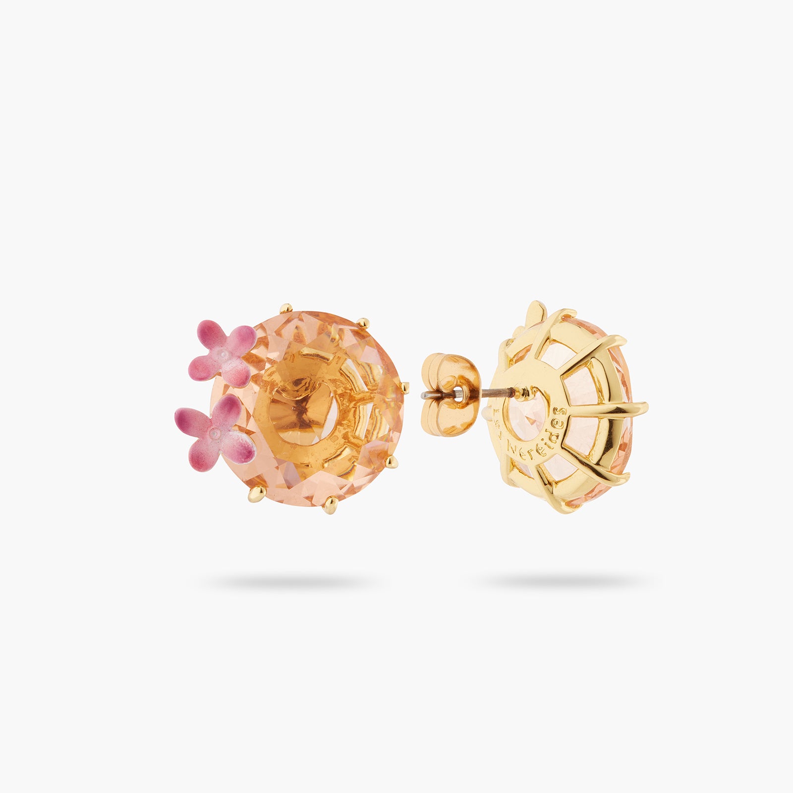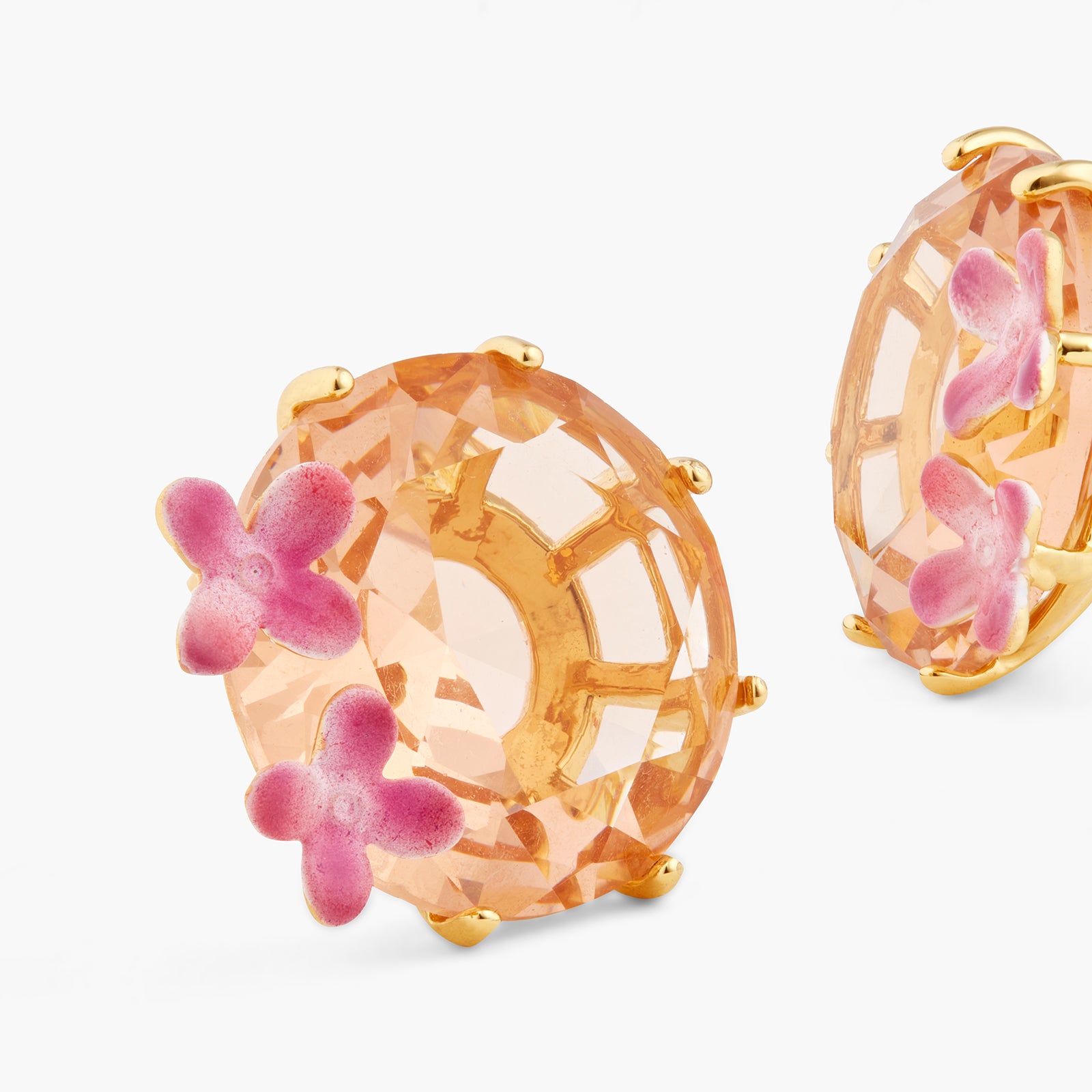 Drazy earrings, round crystal in front of apricot tones, details of pink lilac flowers in enamel, golden brass frame with fine gold.