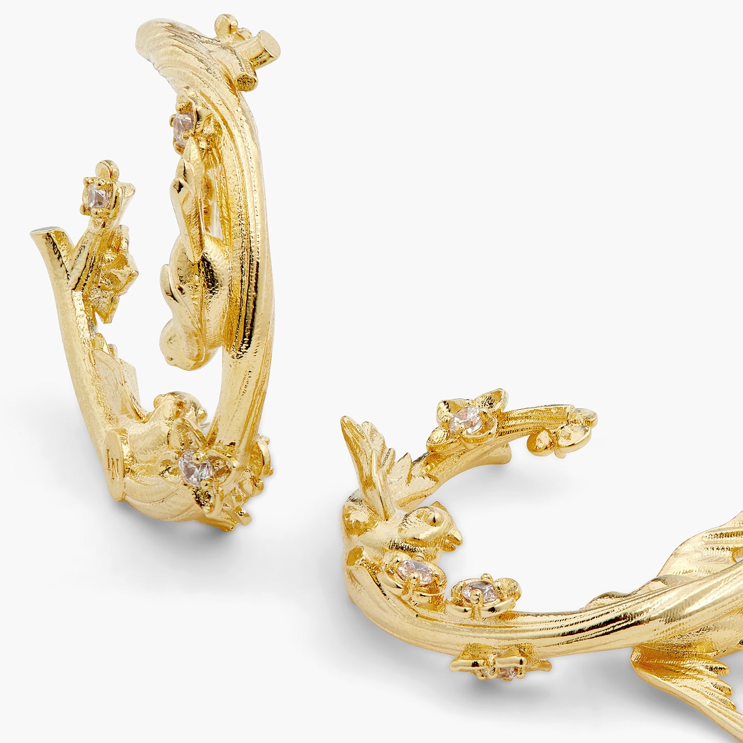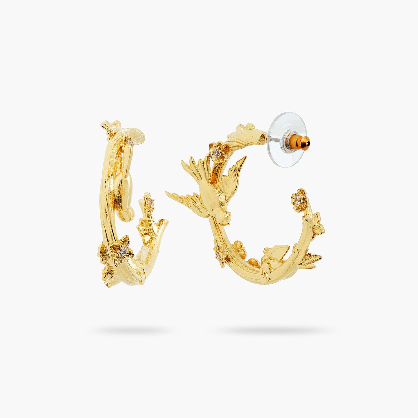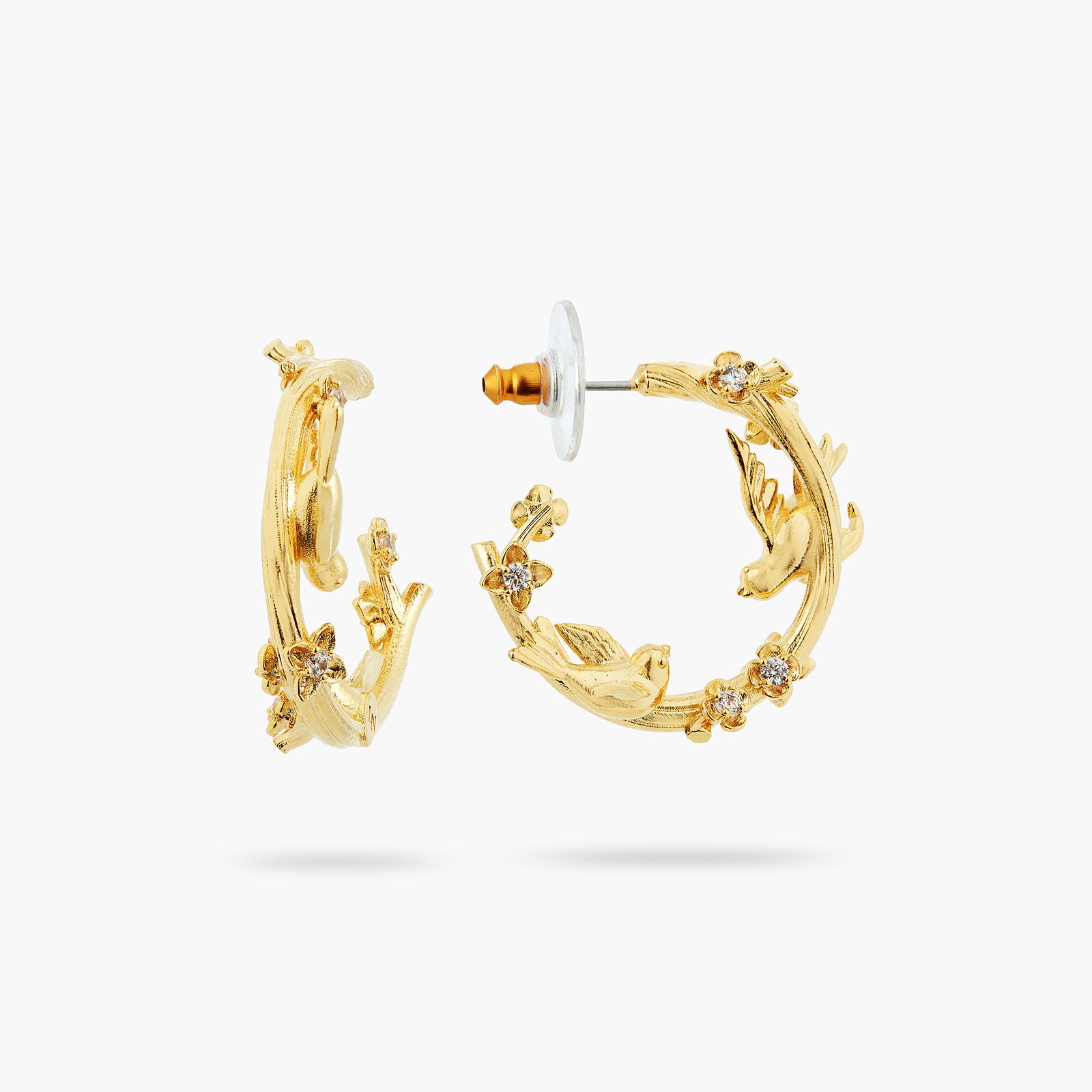 Earrings Creole stems, golden golden brass, vegetable inspiration, two golden swallows, small flowers adorned with crystals.