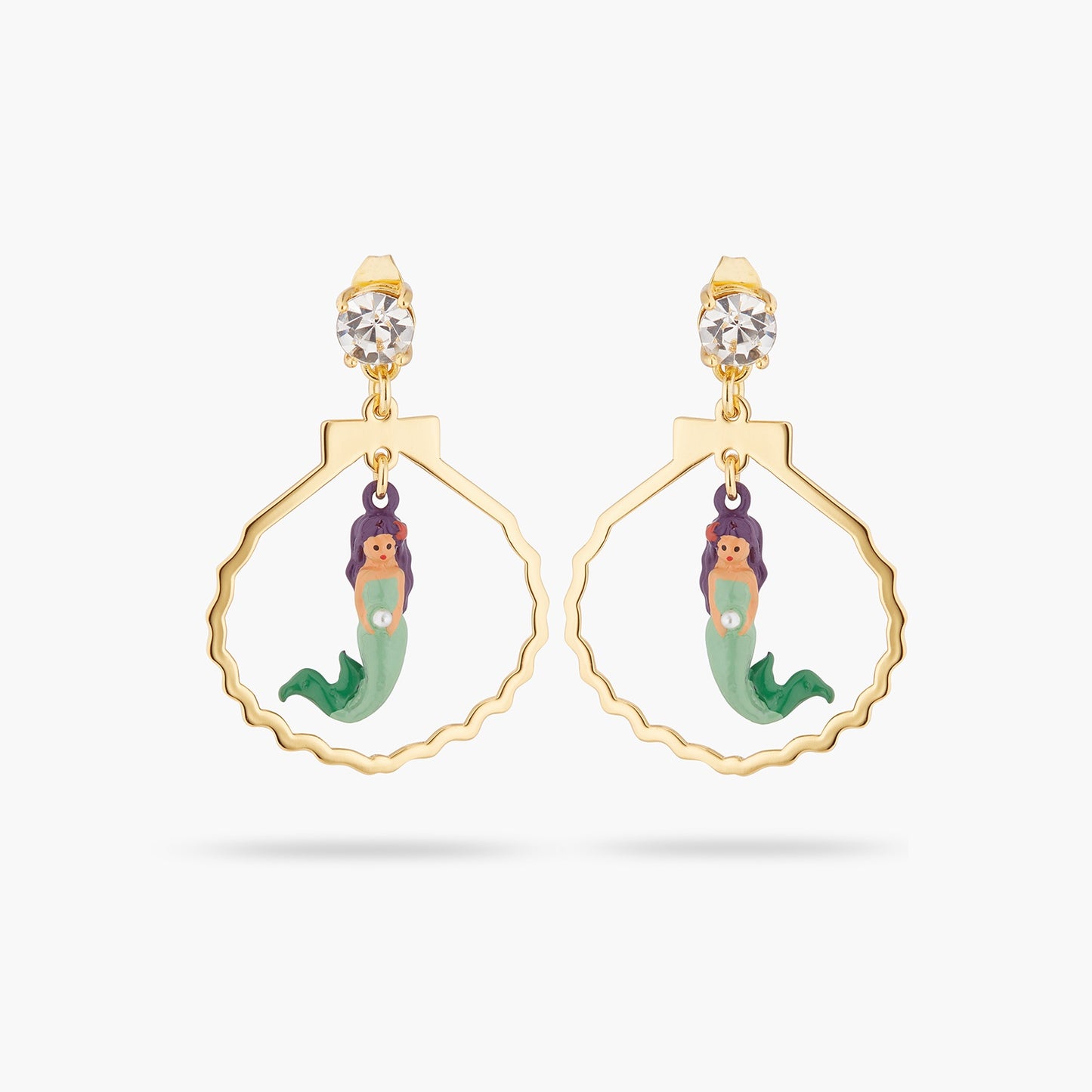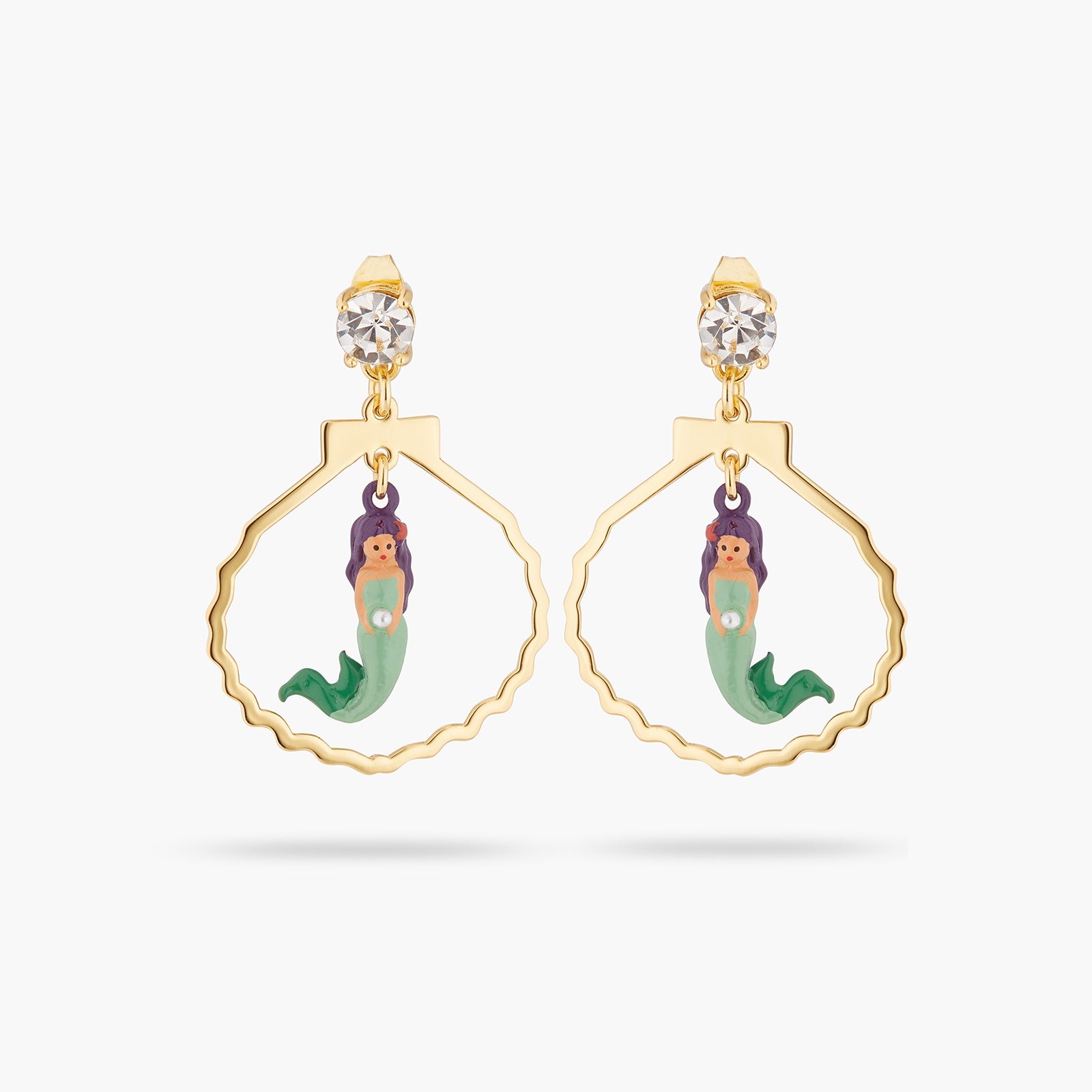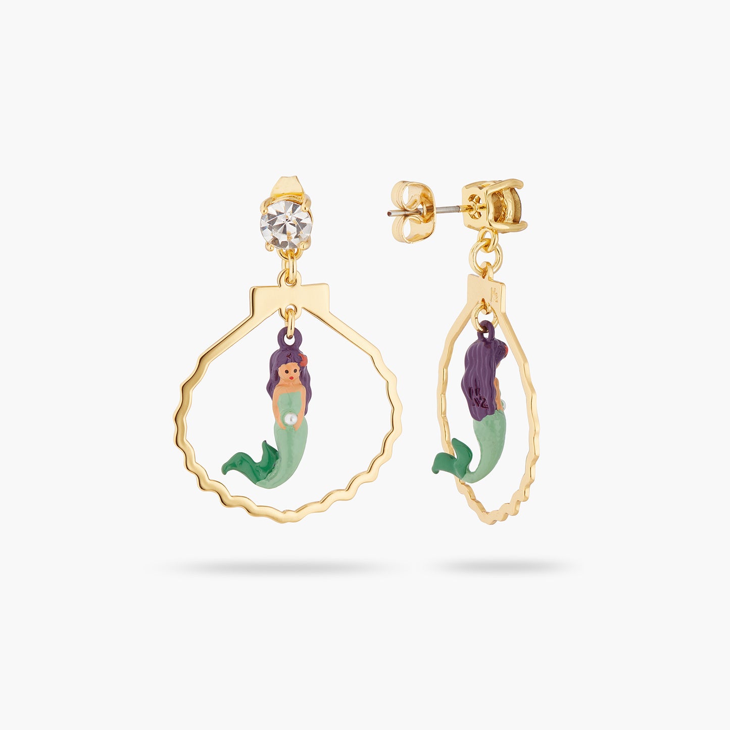 Clip earrings, siren enameled by hand hanging in a golden brass shell with fine gold and holding a small pearly fancy pearl, round stone set in cut crystal.