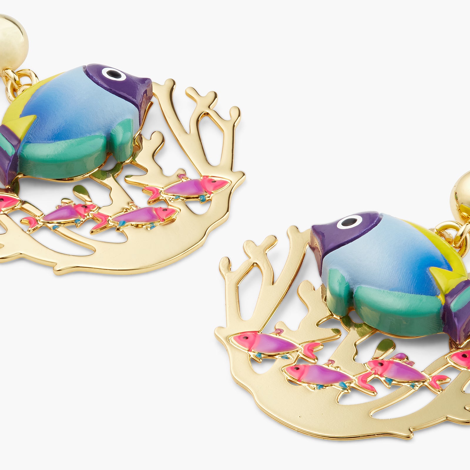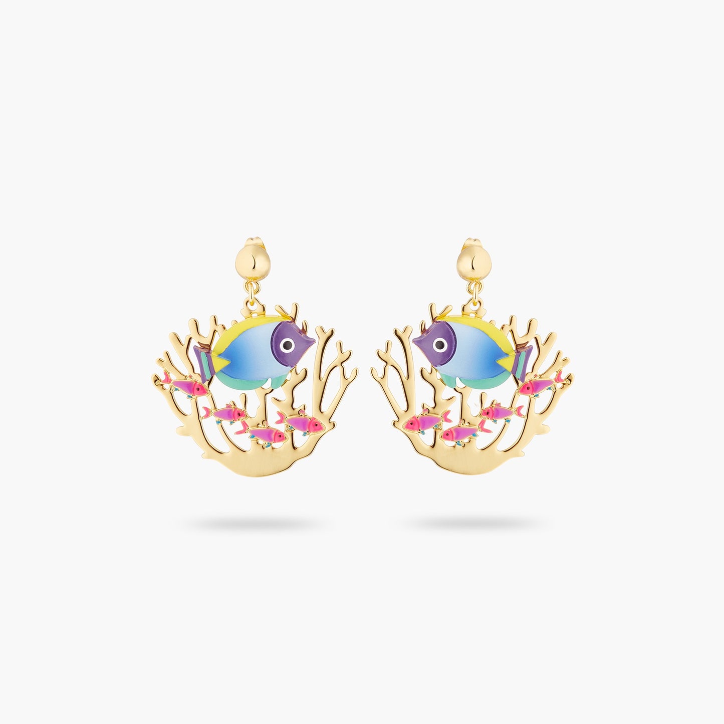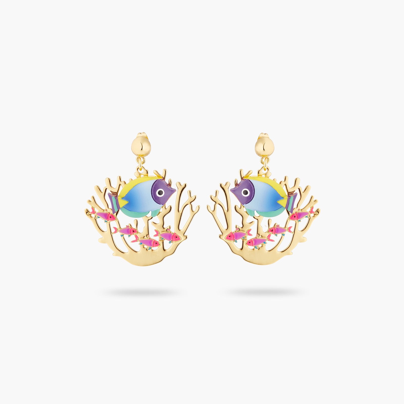Earrings rods, Marine scene in enamel and golden golden brass, colored tropical fish and coral, golden pearl.