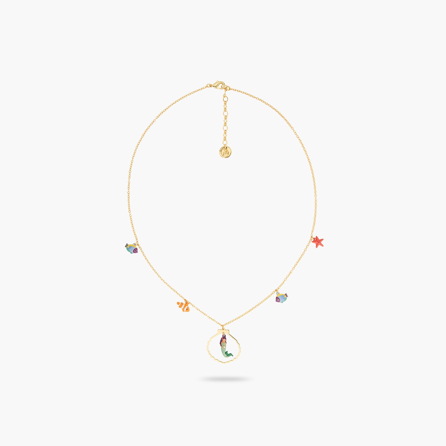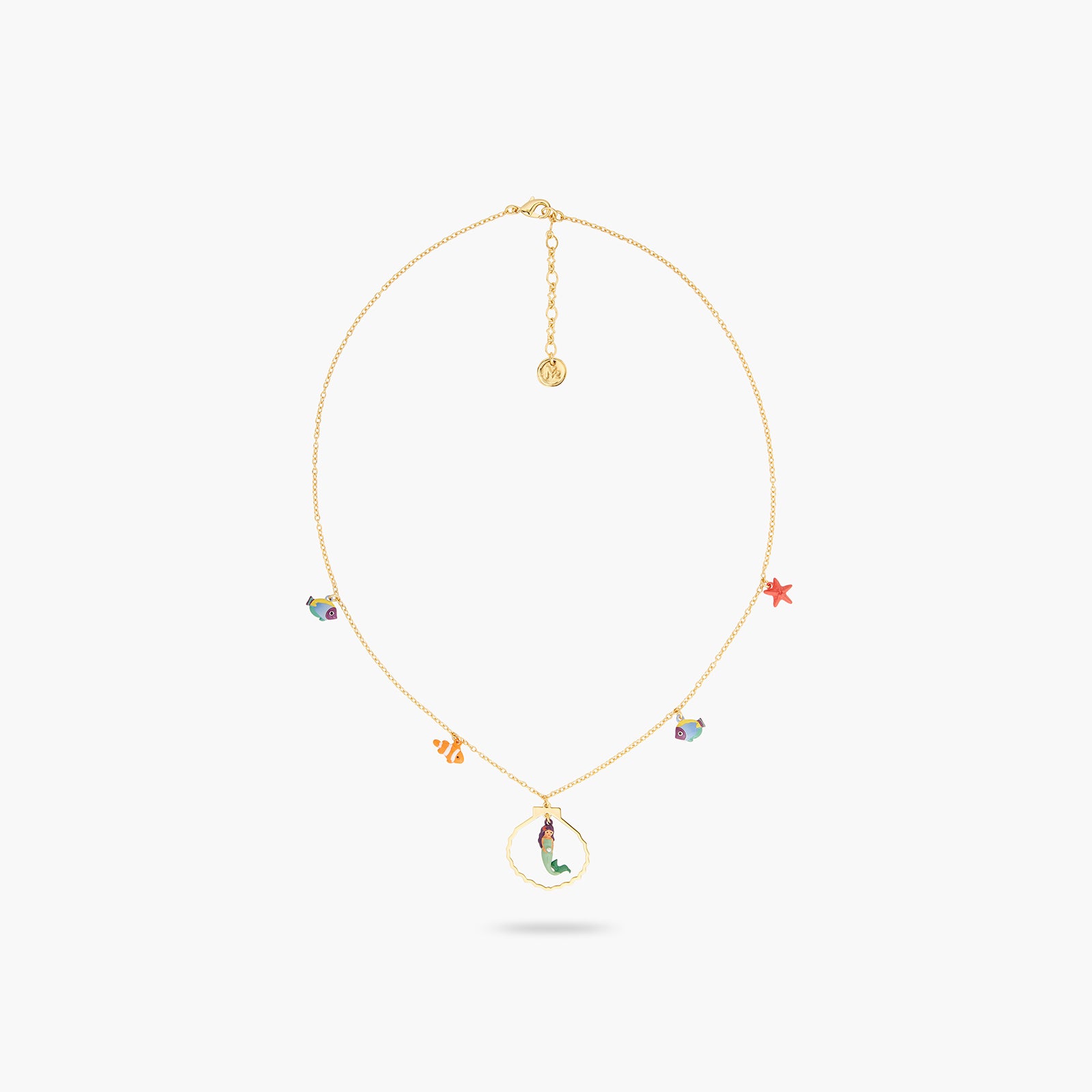 Charm's necklace, golden golden shell, starfish, colored tropical fish and small mermaids, decorated with a pearl.