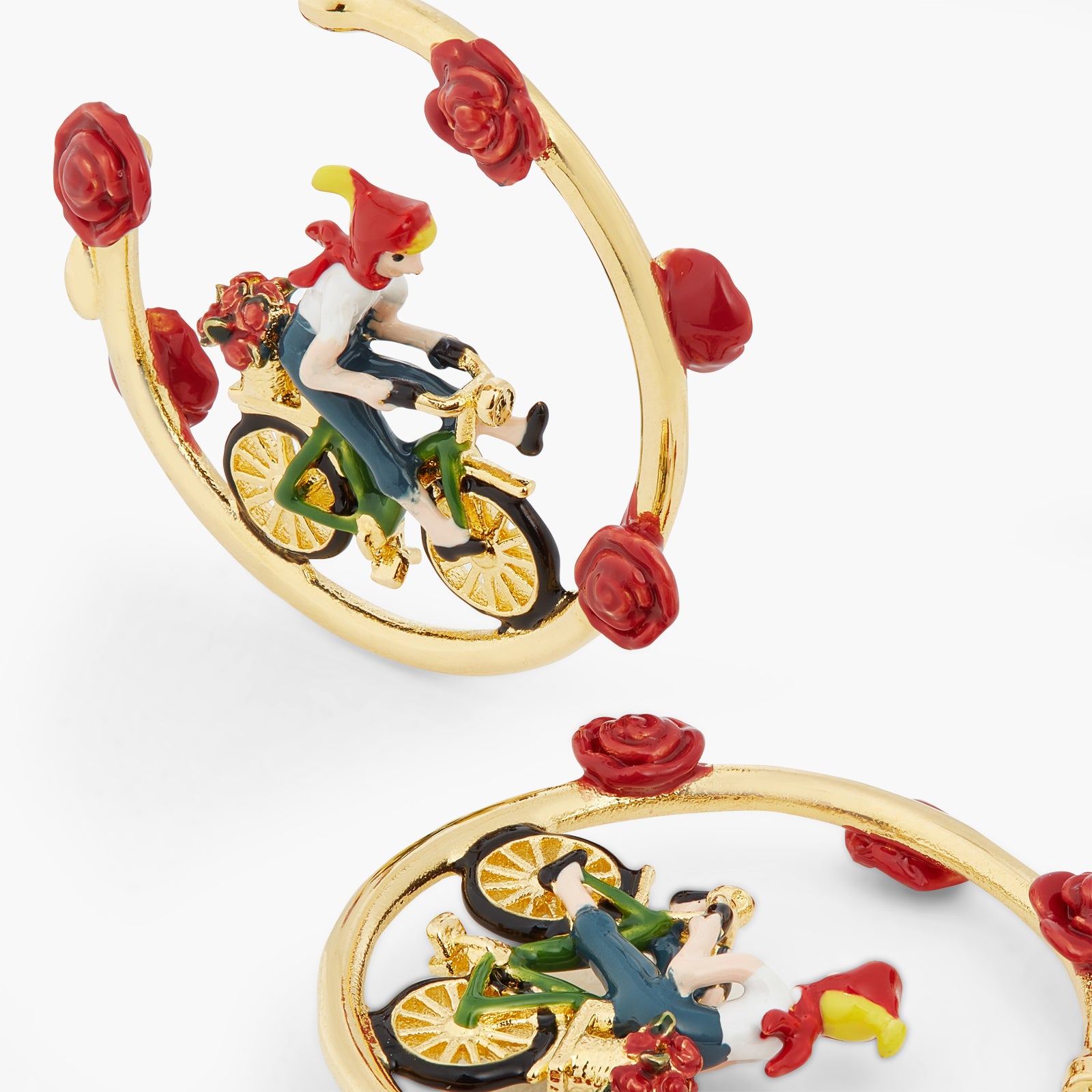Post hoop earrings, gold-plated circles adorned with red roses, and a hand-enamelled woman riding a bicycle in the centre of the jewel. Embrace dreamy memories of Paris through images that are typical of Parisian women's lives. A range of jewellery pieces to bring home as souvenirs.