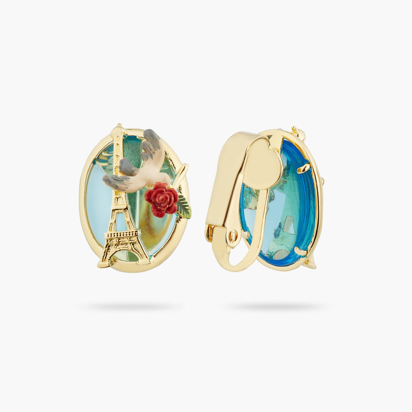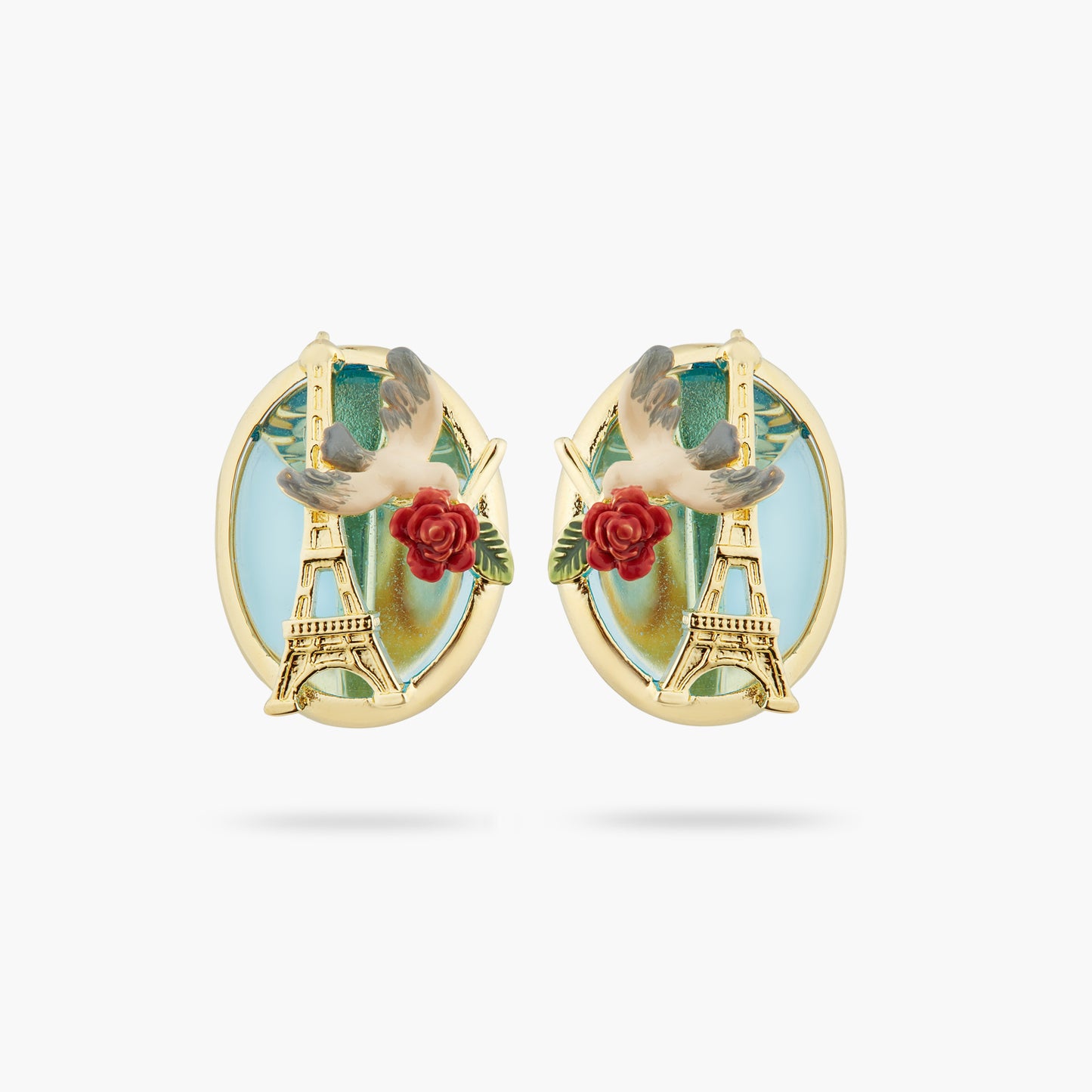 Clip-on earrings, Paris postcard, hand-enamelled rose and sparrow, gold-plated brass Eiffel Tower. Embrace dreamy memories of Paris through images that are typical of Parisian women's lives. A range of jewellery pieces to bring home as souvenirs.