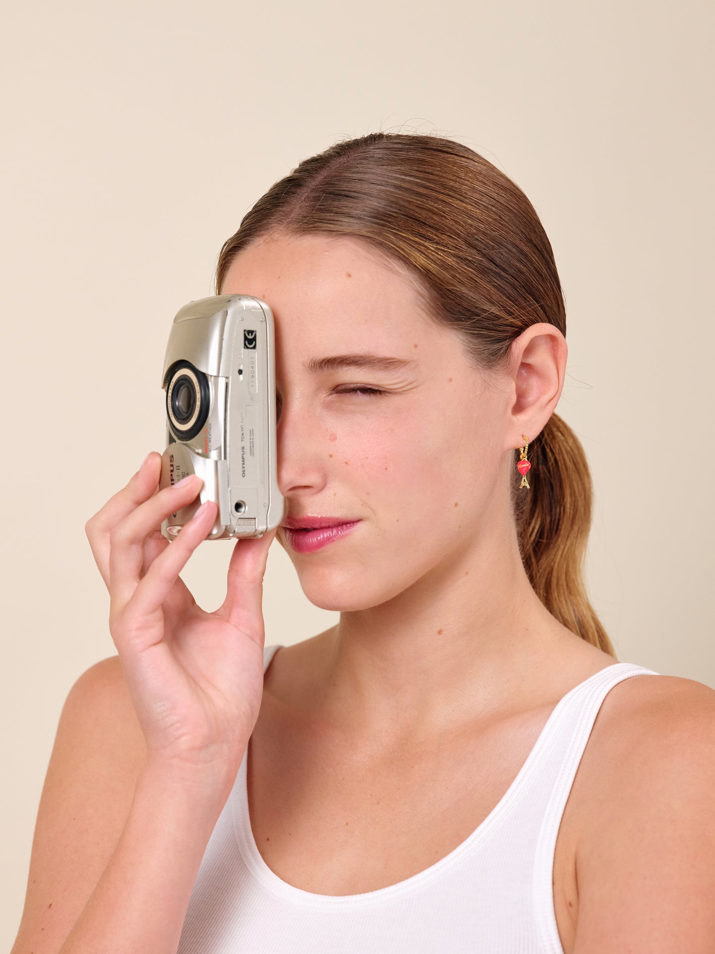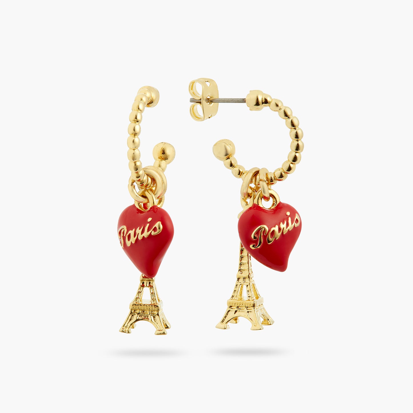Gold-plated brass post hoop earrings , dangling Eiffel Tower, hand-enamelled red heart. Embrace dreamy memories of Paris through images that are typical of Parisian women's lives. A range of jewellery pieces to bring home as souvenirs.