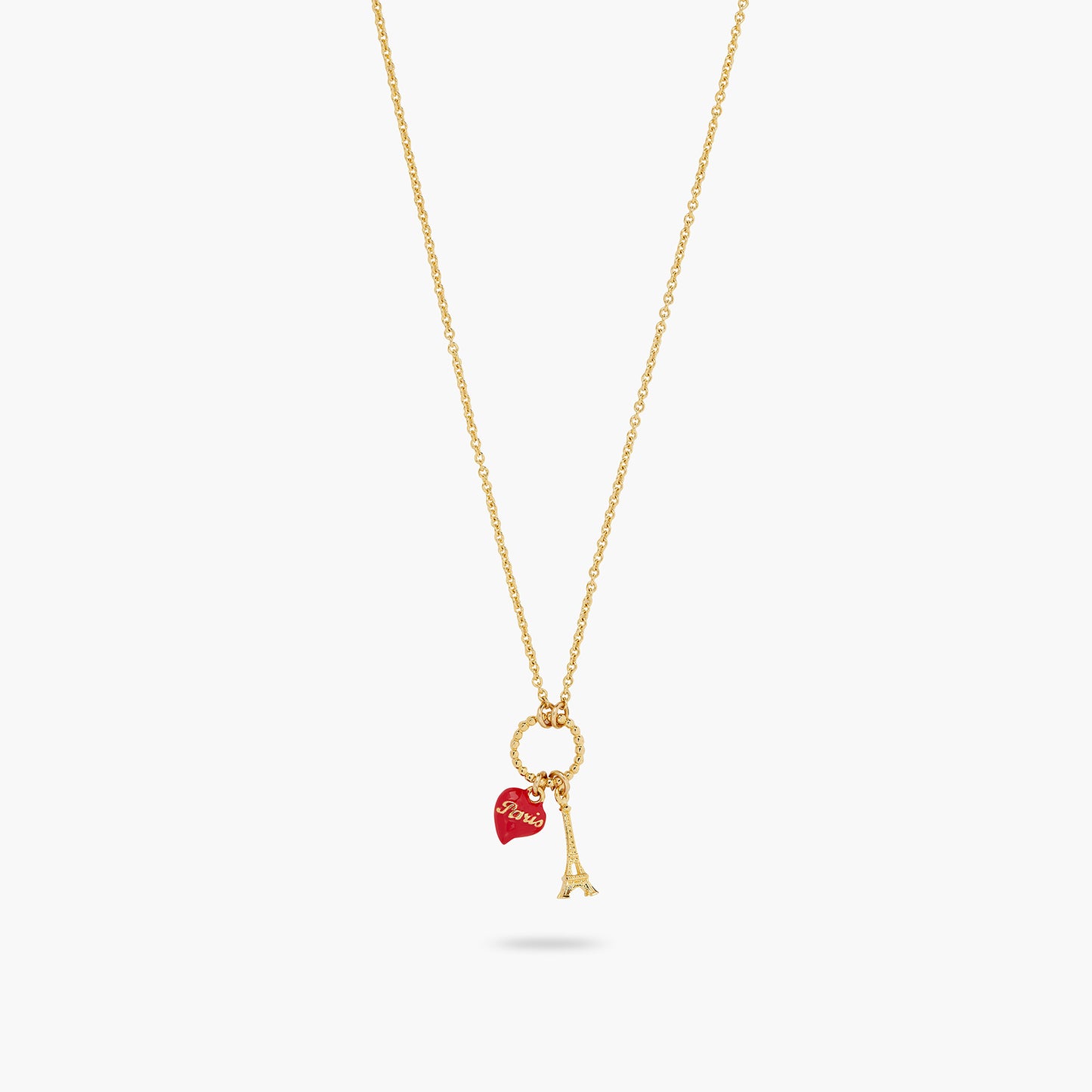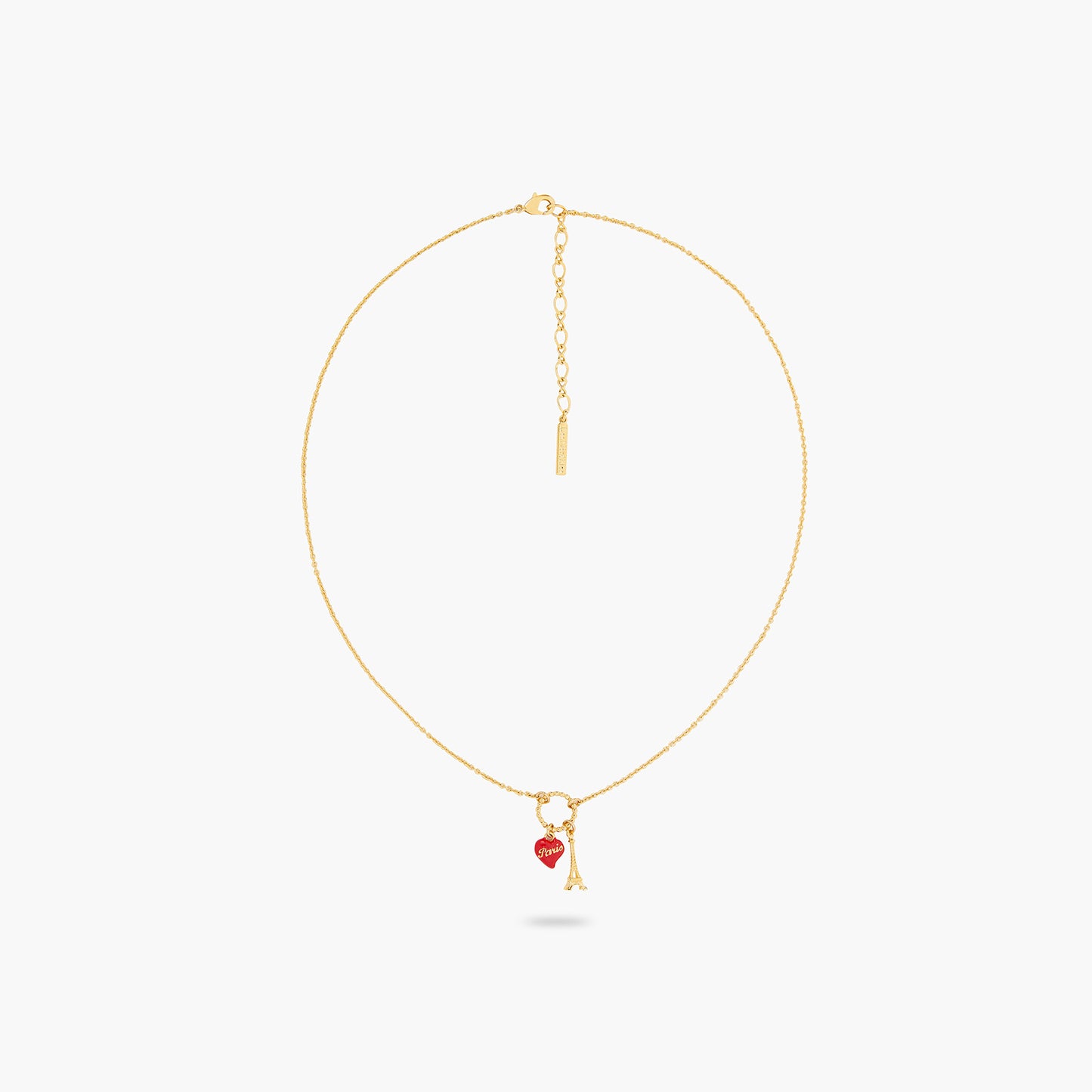Pendant charm necklace, hand-enamelled heart, gold-plated brass Eiffel Tower. Embrace dreamy memories of Paris through images that are typical of Parisian women's lives. A range of jewellery pieces to bring home as souvenirs.