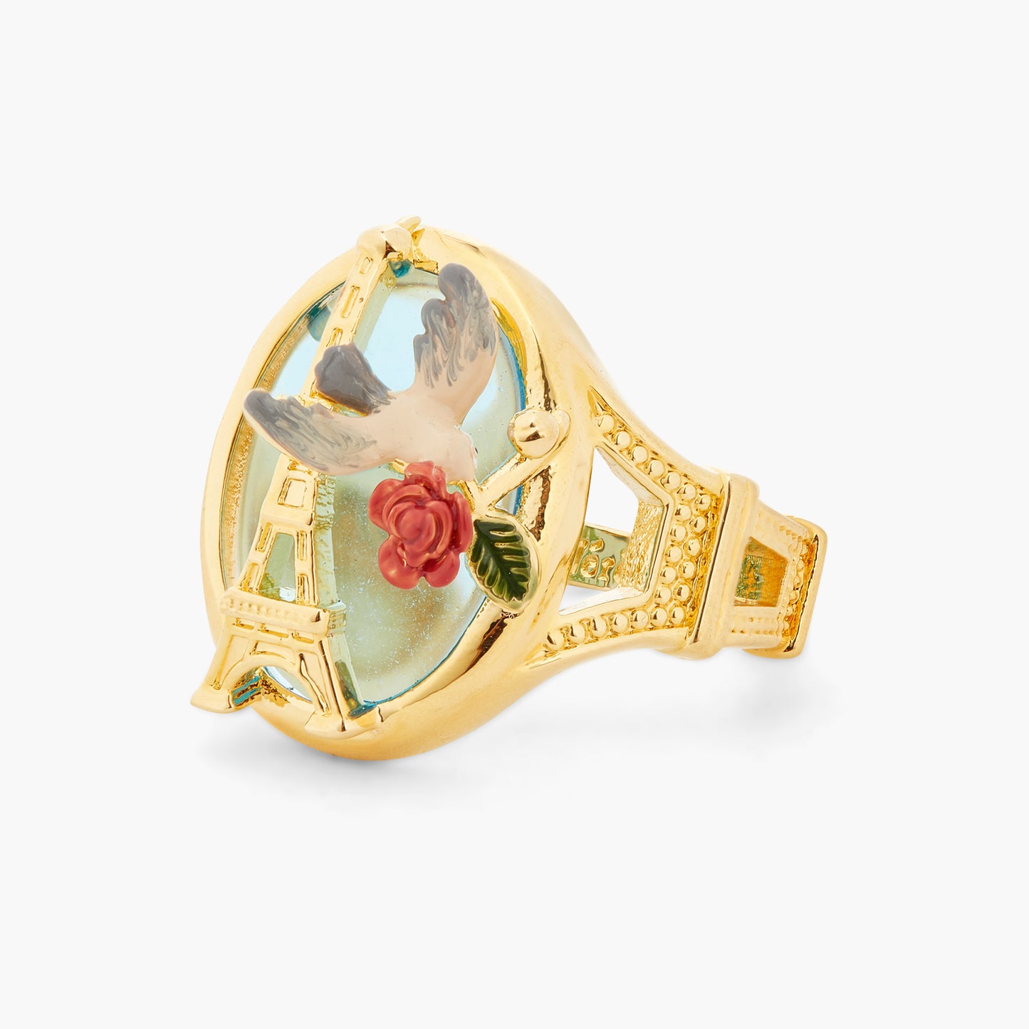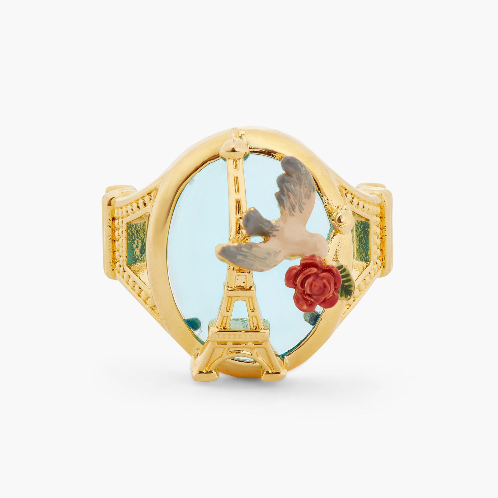 Cocktail ring, hand-enamelled Paris postcard, rose and sparrow, gold-plated brass Eiffel tower. Embrace dreamy memories of Paris through images that are typical of Parisian women's lives. A range of jewellery pieces to bring home as souvenirs.