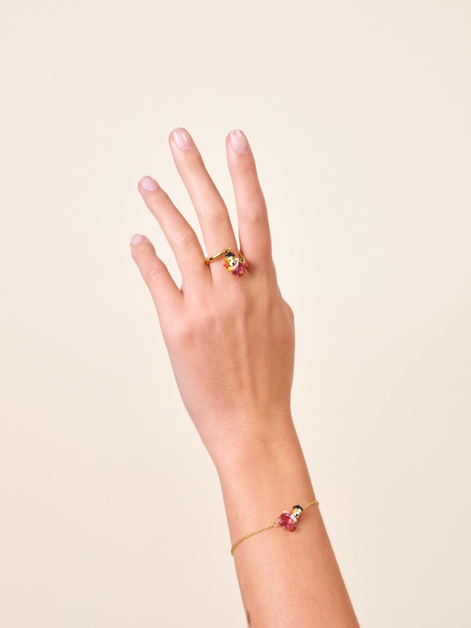 Adjustable ring with a beagle wearing a beret on one side, a cut crystal stone and a rose on the other. Embrace these dreamy memories of Paris through images that are typical of Parisian women's lives. A range of jewellery pieces to bring home as souvenirs.