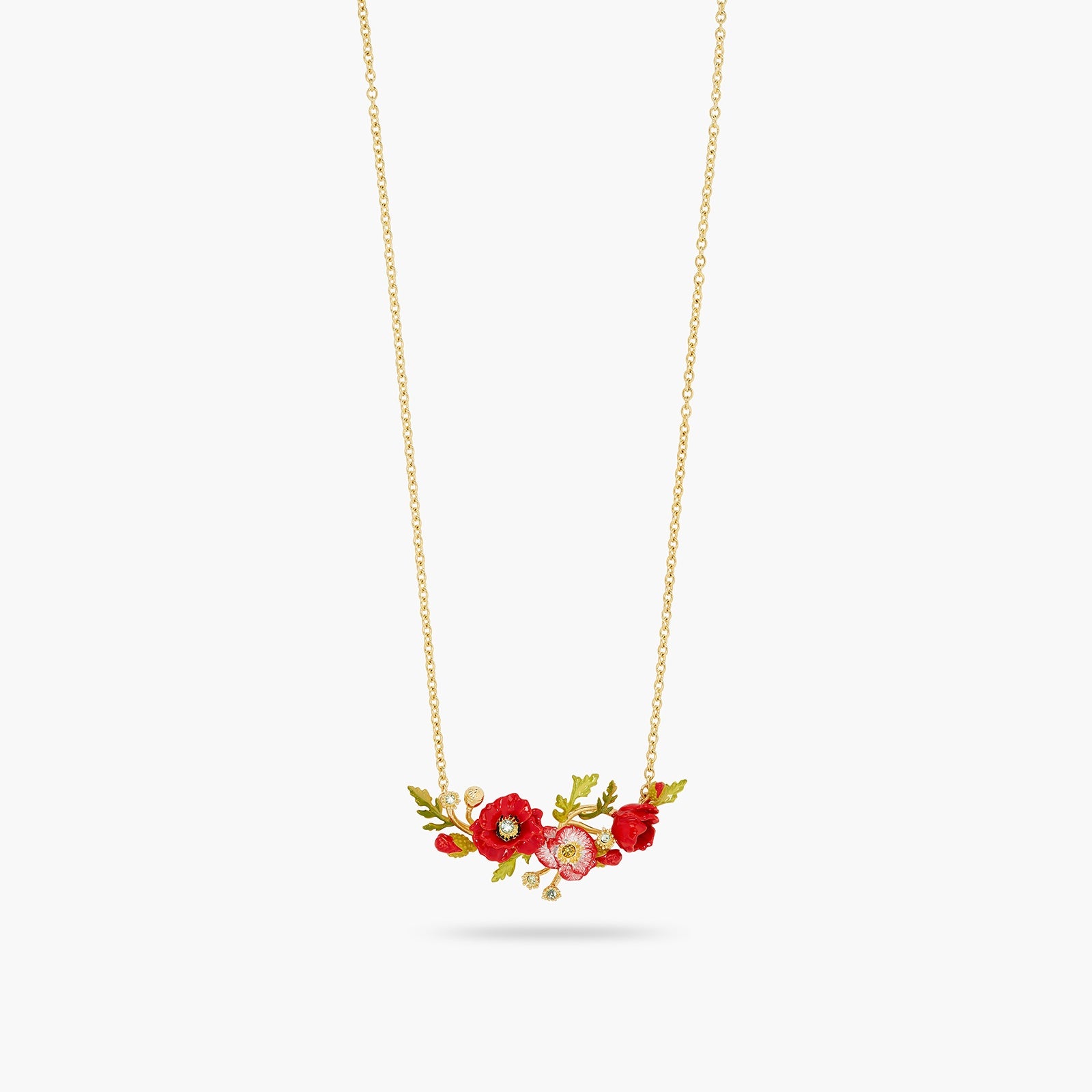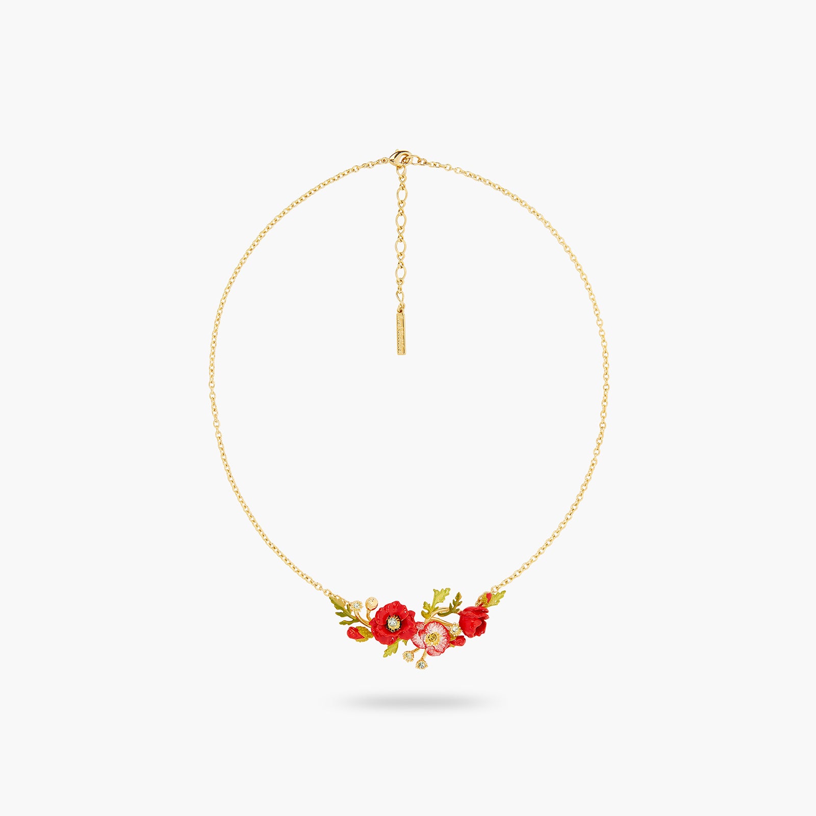 Immerse yourself in the enchantment of nature with our coquelicots and marguerite plastron collar. This sumptuous piece is shaped from flamboyant poppies and an elegant daisy. The red poppies form the backdrop of this necklace reminiscent of the heat of the summer sun. Each detail is precisely captured allowing the poppies to intertwine harmoniously to create a floral explosion. At the heart of this composition, the Marguerite brings a note of freshness and innocence. The delicate and pure petals of this flower are deployed with grace beautifully contrasting with the intensity of the coquelicot red which surrounds it. Do not hesitate to combine this necklace with the ears earrings poppy and golden pearl.