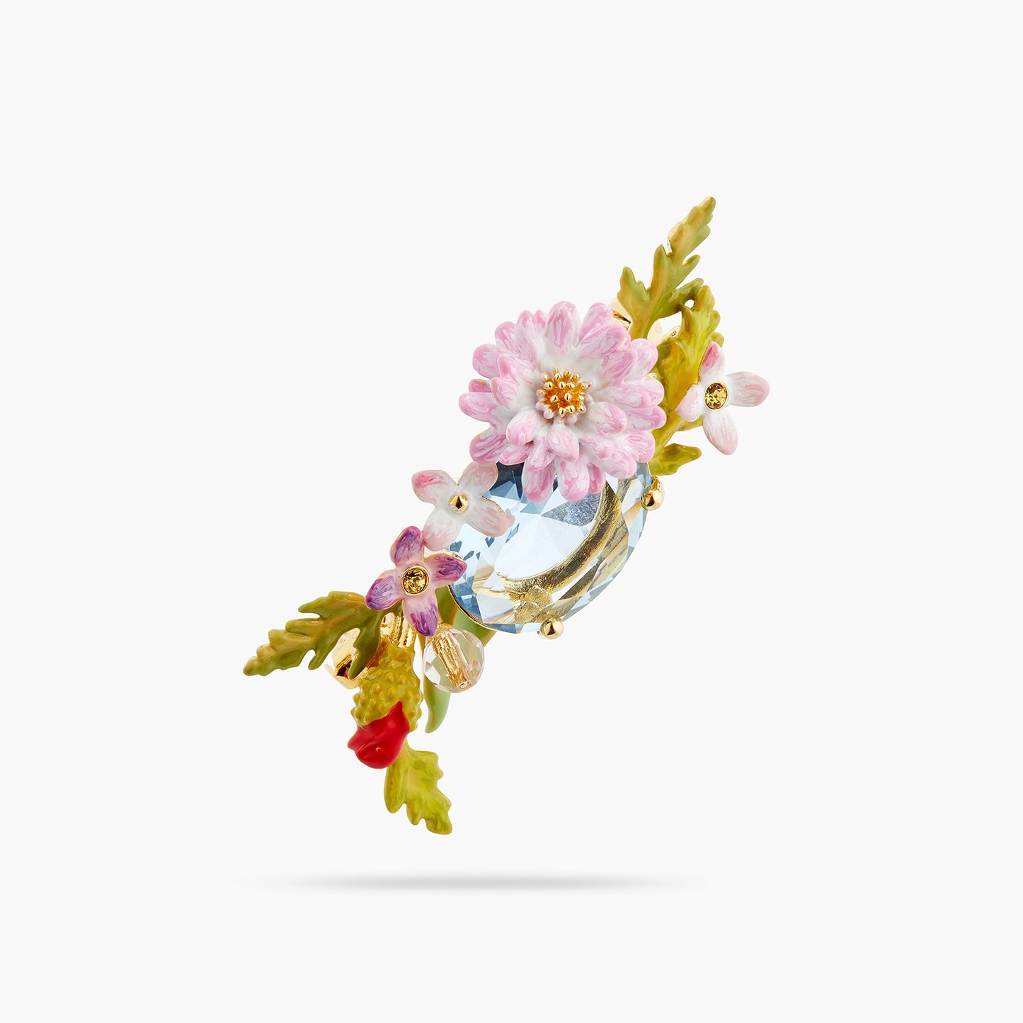 This spindle embodies the poetic fusion between the purity of a carved crystal stone and the natural splendor of field flowers. An almost translucent blue -cut crystal stone stone sits in the center surrounded by a floral composition. A brilliant daisy, fragrant lilac flowers and a poppy poppy surround this stone creating a mosaic of colors and natural details. This pin is perfect for adding a touch of poetry to any outfit.