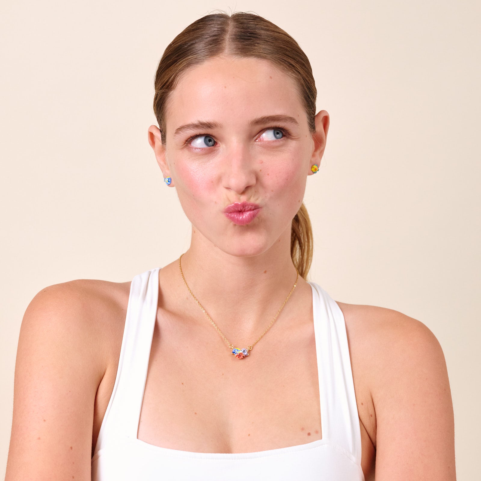 Immerse yourself in the enchantment of marine depths by wearing this pendant necklace where every detail evokes the bewitching charm of the seabed. An orange anemone, jewel of depths, houses in its heart a carved crystal stone reflecting the purity of the waters. Overlooking this marine setting, a vibrating blue fish seems to float gracefully, while at its side a blue sea urchin decorated with a sparkling crystal stone embodies the mystery of the depths. As a gift for someone special, this pendant necklace will add a personal and symbolic note, recalling shared moments or passions for the ocean and nature.