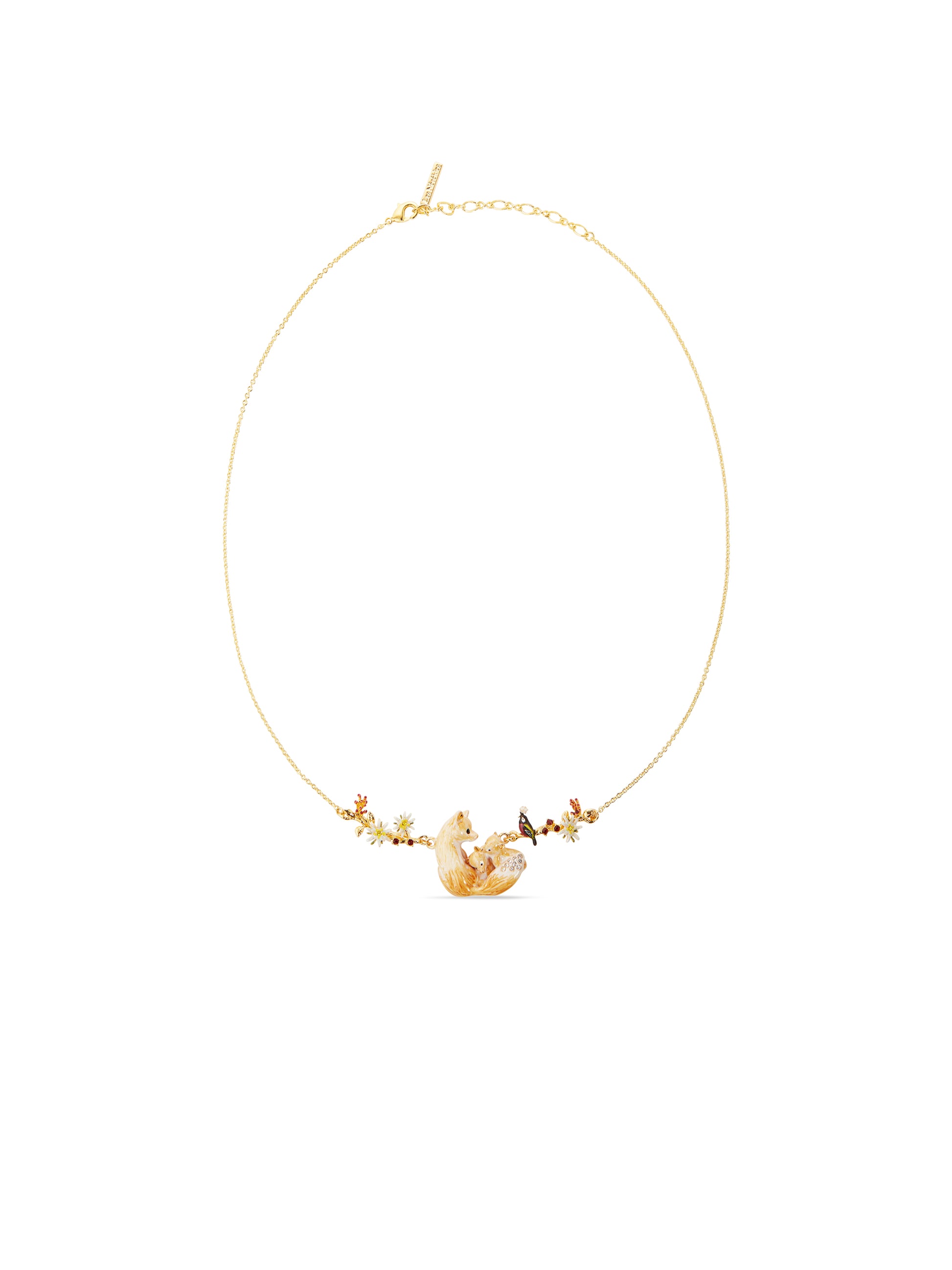 Find on this statement necklace all the elements that make up the Les Néréides Loves Animals collection this season: the arctic fox family, a varied tit, an edelweiss flower and cotoneaster. This season, Les Néréides Loves Animals is celebrating winter. In the heart of the mountains, a family of arctic foxes blends into the landscape. 15% of the profits from this collection are donated to the Les Néréides Loves Animals foundation.