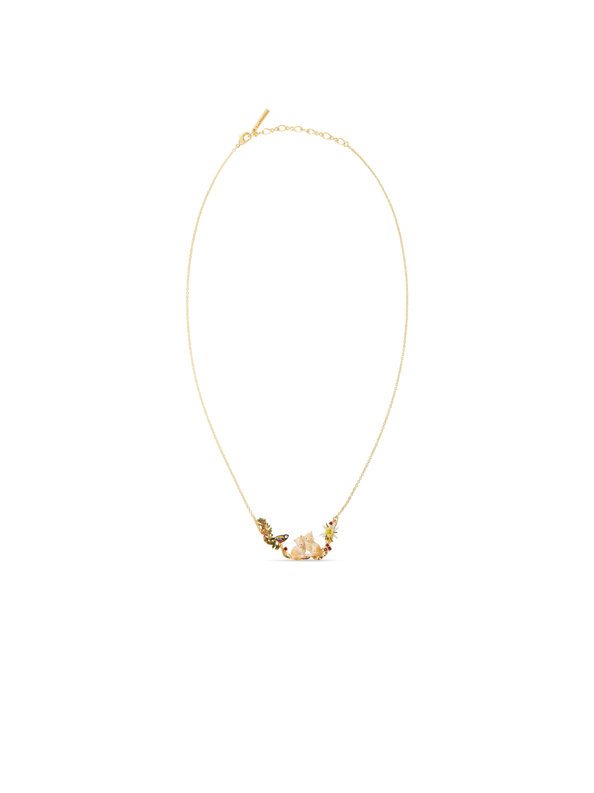 This statement necklace showcases a couple of arctic foxes together with a varied tit. This perfect picture is complemented by wonderful edelweiss flowers and cotoneasters. This season, Les Néréides Loves Animals is celebrating winter. In the heart of the mountains, a family of arctic foxes blends into the landscape. 15% of the profits from this collection are donated to the Les Néréides Loves Animals foundation.