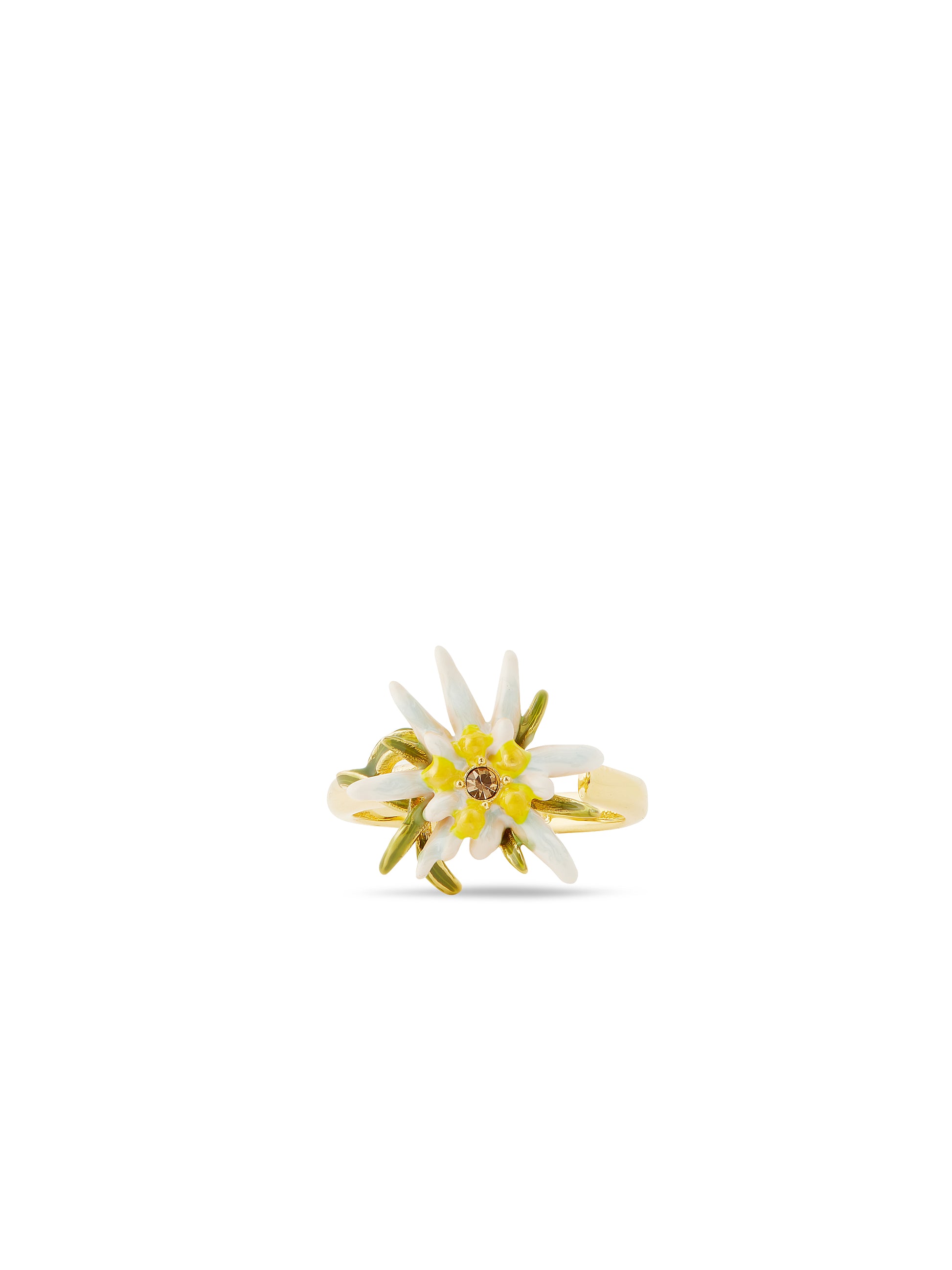 Adjustable ring showcasing an edelweiss flower with white, yellow and green petals. This flower is the emblem of Switzerland and also the symbole of the Alps. This season, Les Néréides Loves Animals is celebrating winter. In the heart of the mountains, a family of arctic foxes blends into the landscape. 15% of the profits from this collection are donated to the Les Néréides Loves Animals foundation.