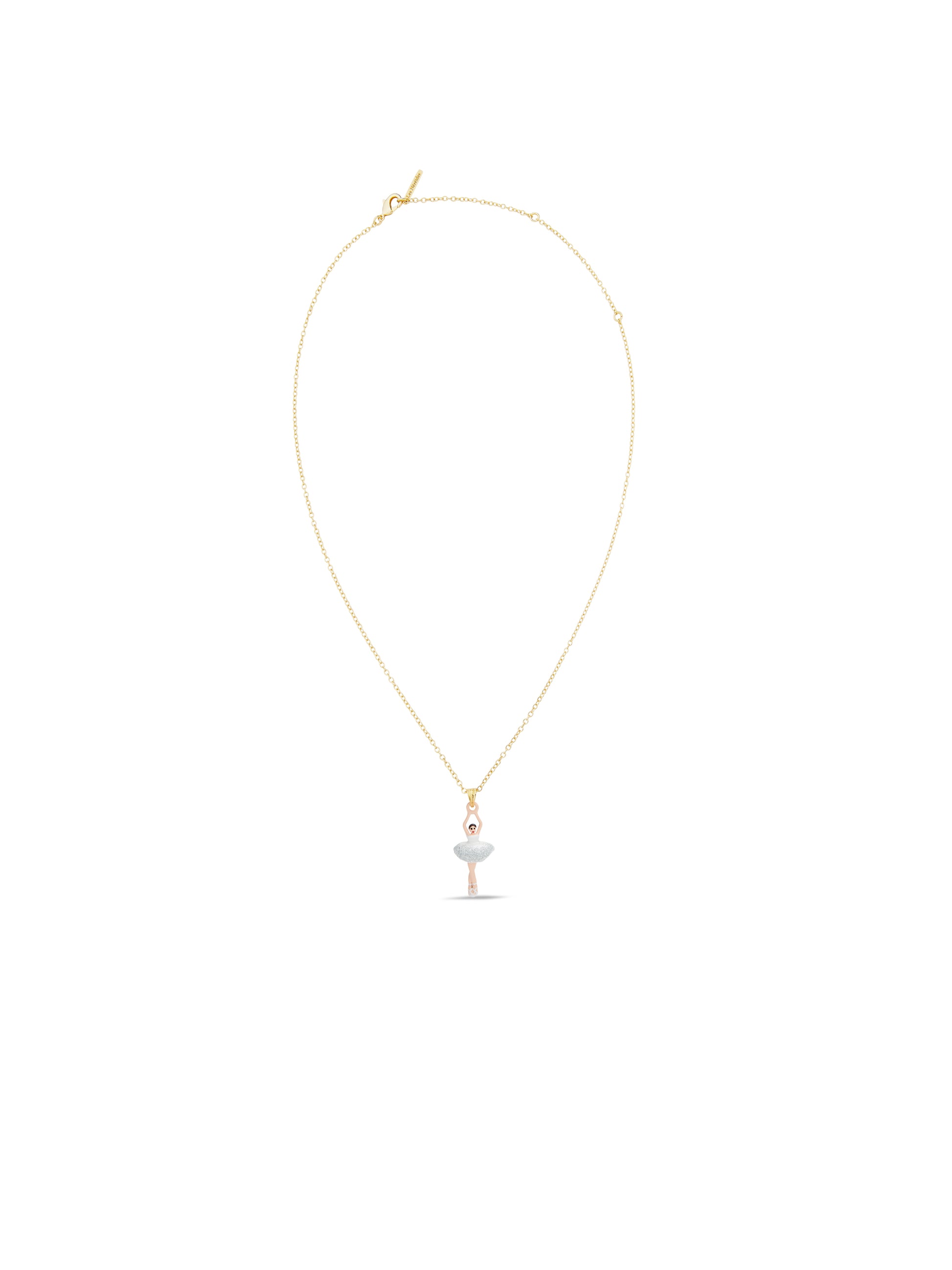 Description: Pendant necklace composed of a ballerina dressed with a glittery grey tutu, delicately hanging on a gold-plated brass chain. The Mini Pas de Deux collection adorns its prima ballerinas' tutus with glitter this season.