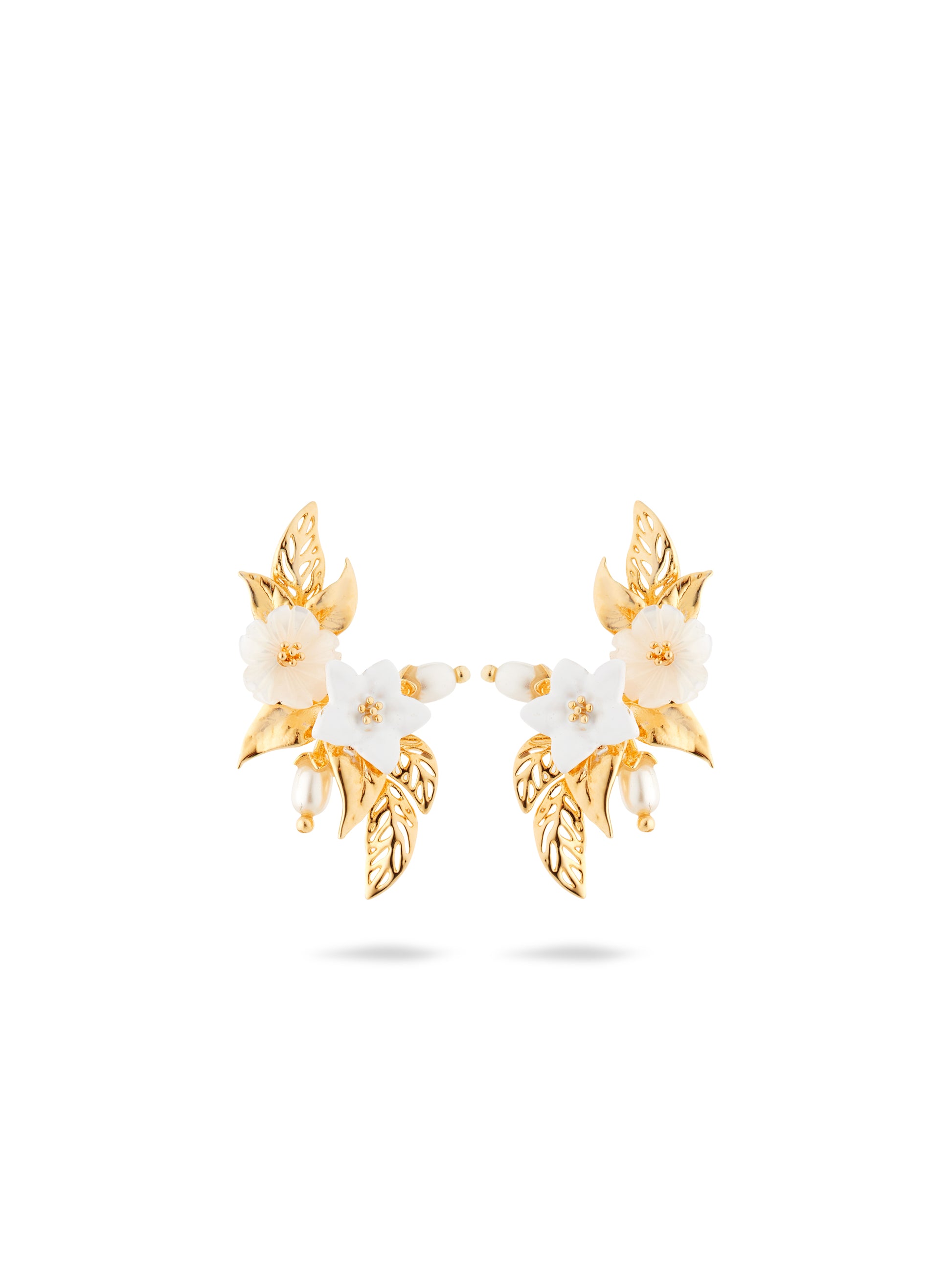 Earrings featuring a white jasmine flower, complemented by gold-plated leaves. Jasmine possesses an incredibly varied symbolic power. It is associated with values such as freedom, beauty, wisdom, love, friendship and prosperity.