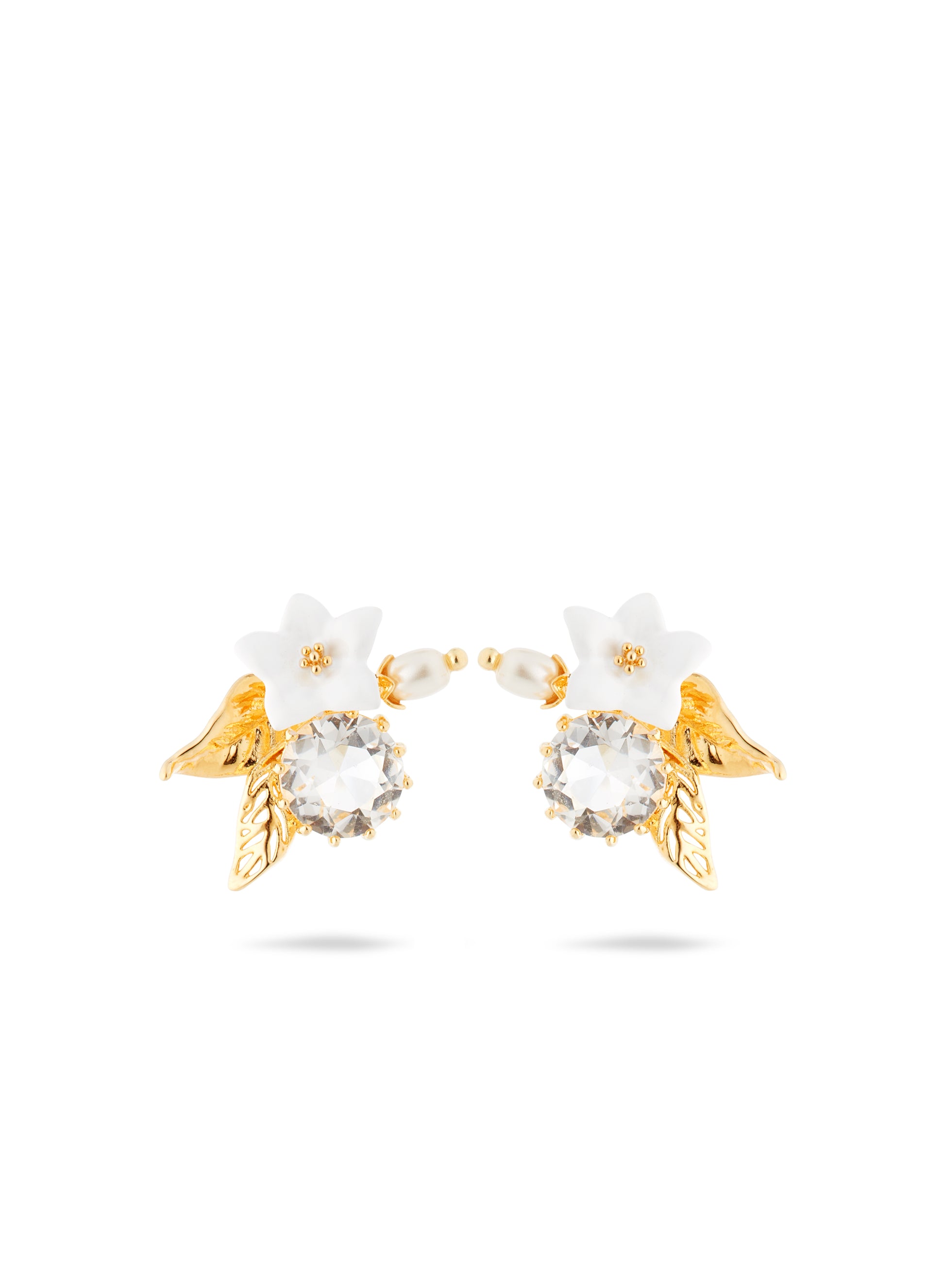 Post earrings featuring a white jasmine flower, complemented by transparent faceted crystal and a crystal pearl bead. Jasmine possesses an incredibly varied symbolic power. It is associated with values such as freedom, beauty, wisdom, love, friendship and prosperity.Materials