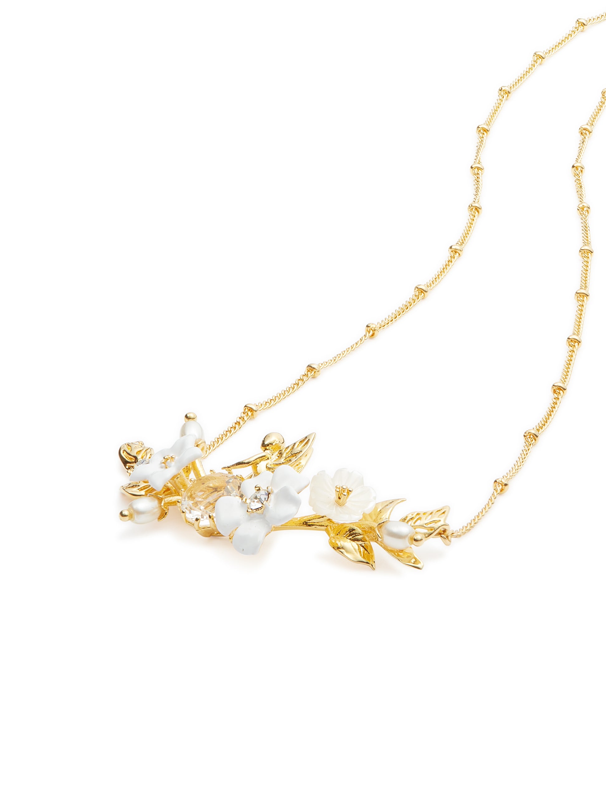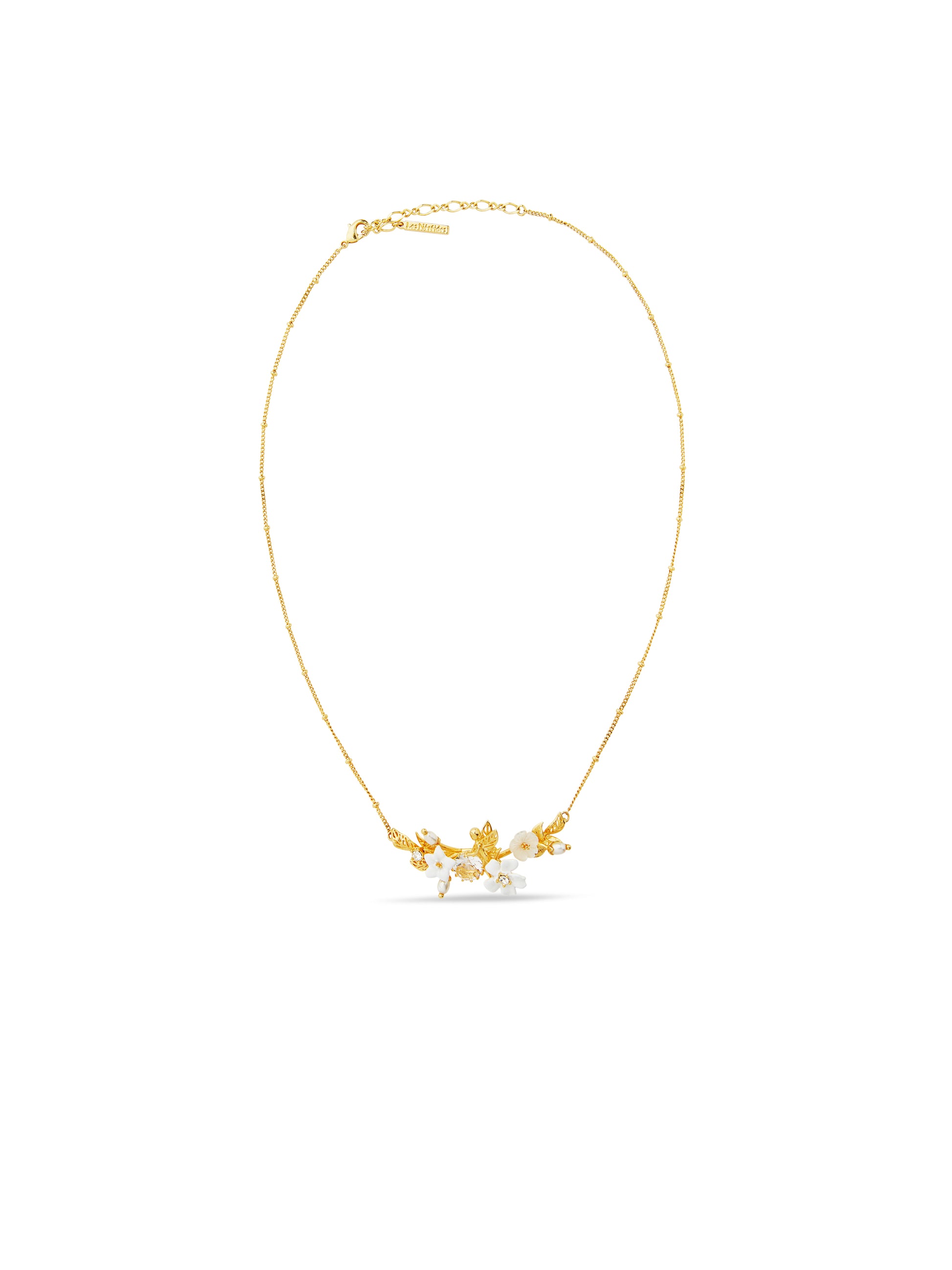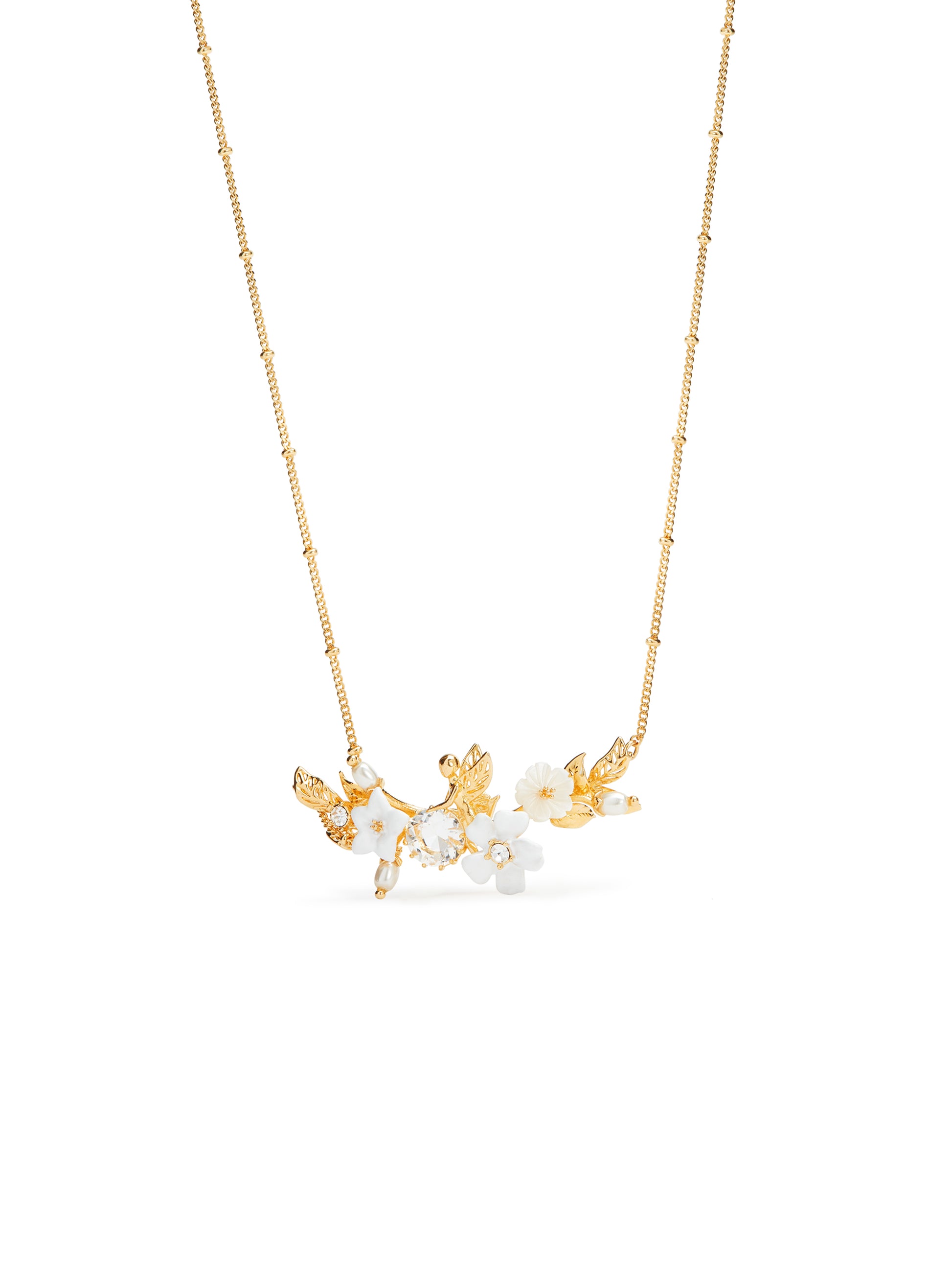 Statement necklace featuring jasmine flowers, complemented by transparent faceted crystal and crystal pearl beads. The flowers adorn a bed of gold-plated leaves. Jasmine possesses an incredibly varied symbolic power. It is associated with values such as freedom, beauty, wisdom, love, friendship and prosperity.