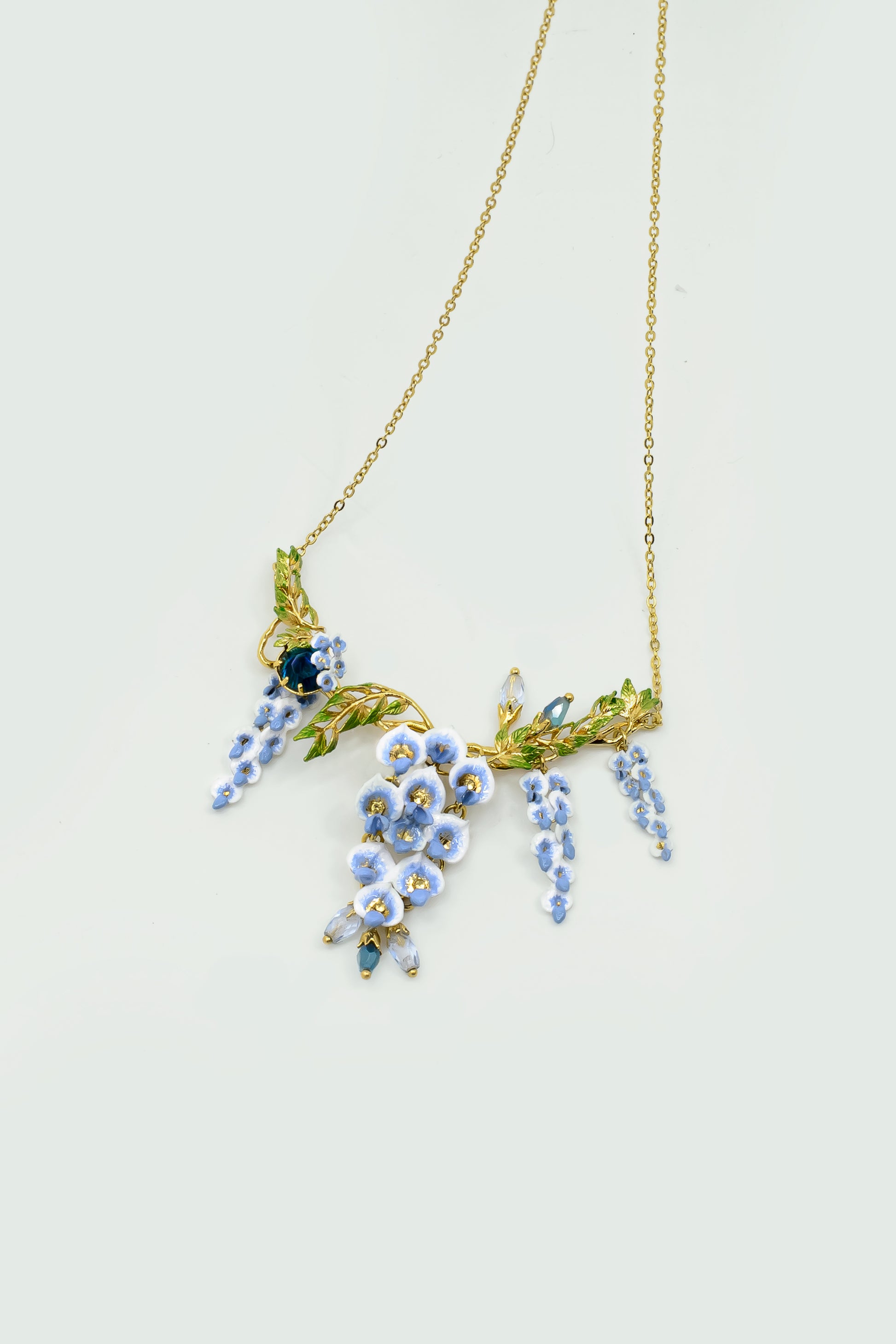 Statement necklace displaying cascades of wisteria flowers, a blue faceted crystal stone, and wisteria buds made of faceted crystal beads.