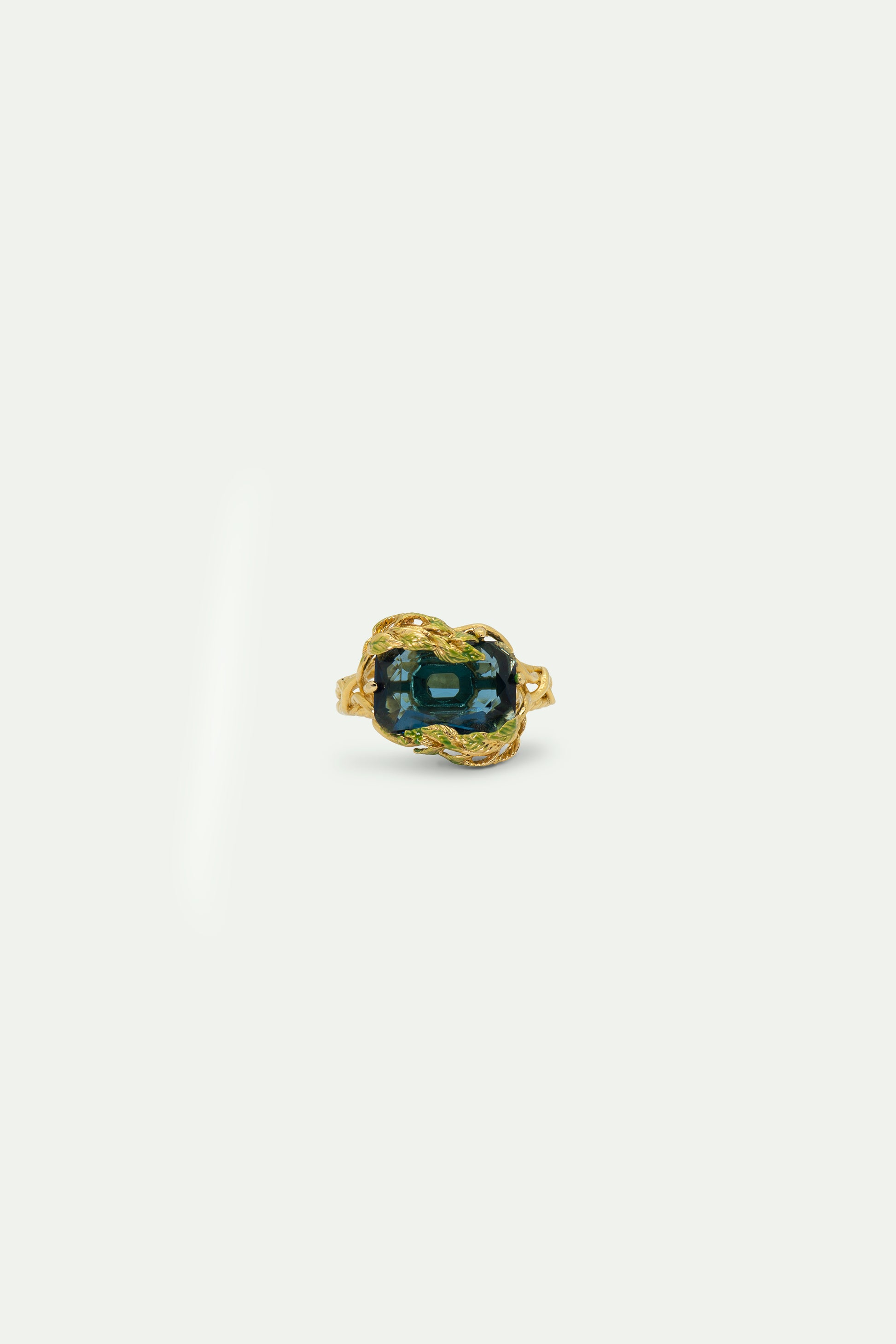 Cocktail ring adorned with a blue faceted crystal stone, surrounded by wisteria leaves. The setting is gold-plated. The flowers, resembling a cloud of butterflies, take on a soft blue hue and are a delight to bees.