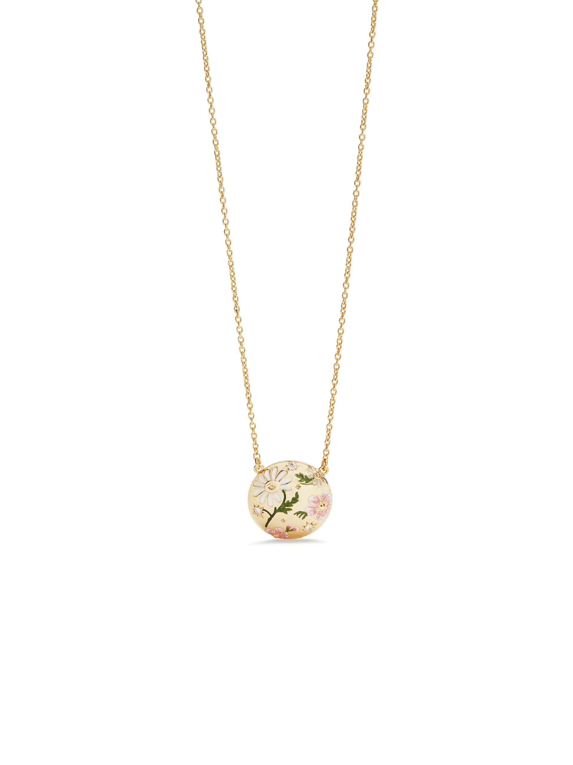 Description: Pendant necklace, hand-enamelled daisy and pansy flowers, gold-plated brass chain. Inspired by the sentimental jewellery popular in 19th-century England, Les Néréides offers a new way of expressing your love to your beloved thanks to the My Little Secret collection.