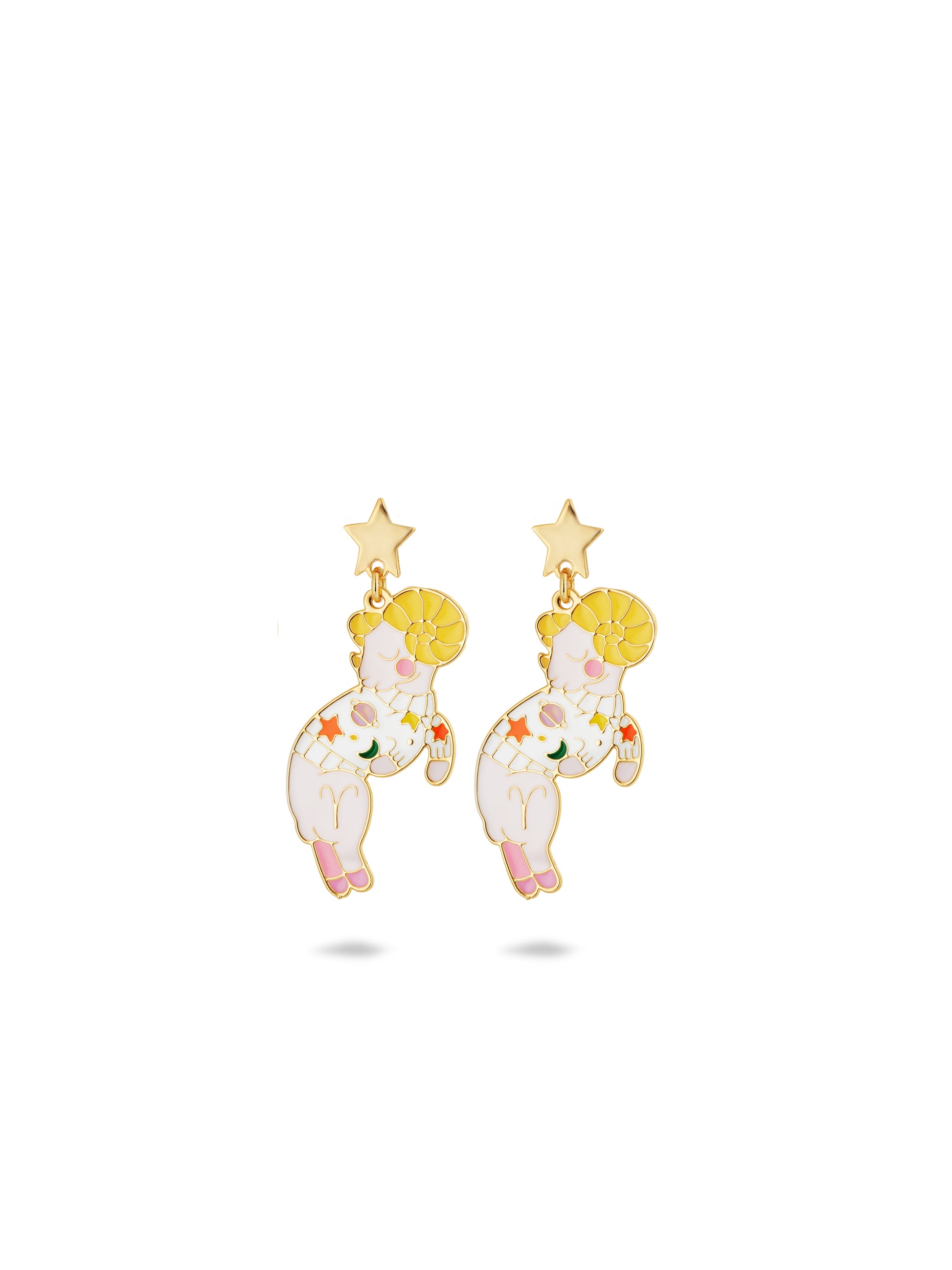 Earrings featuring the Aries astrological sign with yellow horns, an astrology-themed jumper and the Aries sign engraved on the animal's paw. Astrology, a theme close to Les Néréides' heart, is being explored for the first time by N2. Colourful animals and characters play with the stars and destiny in their own way!Materials