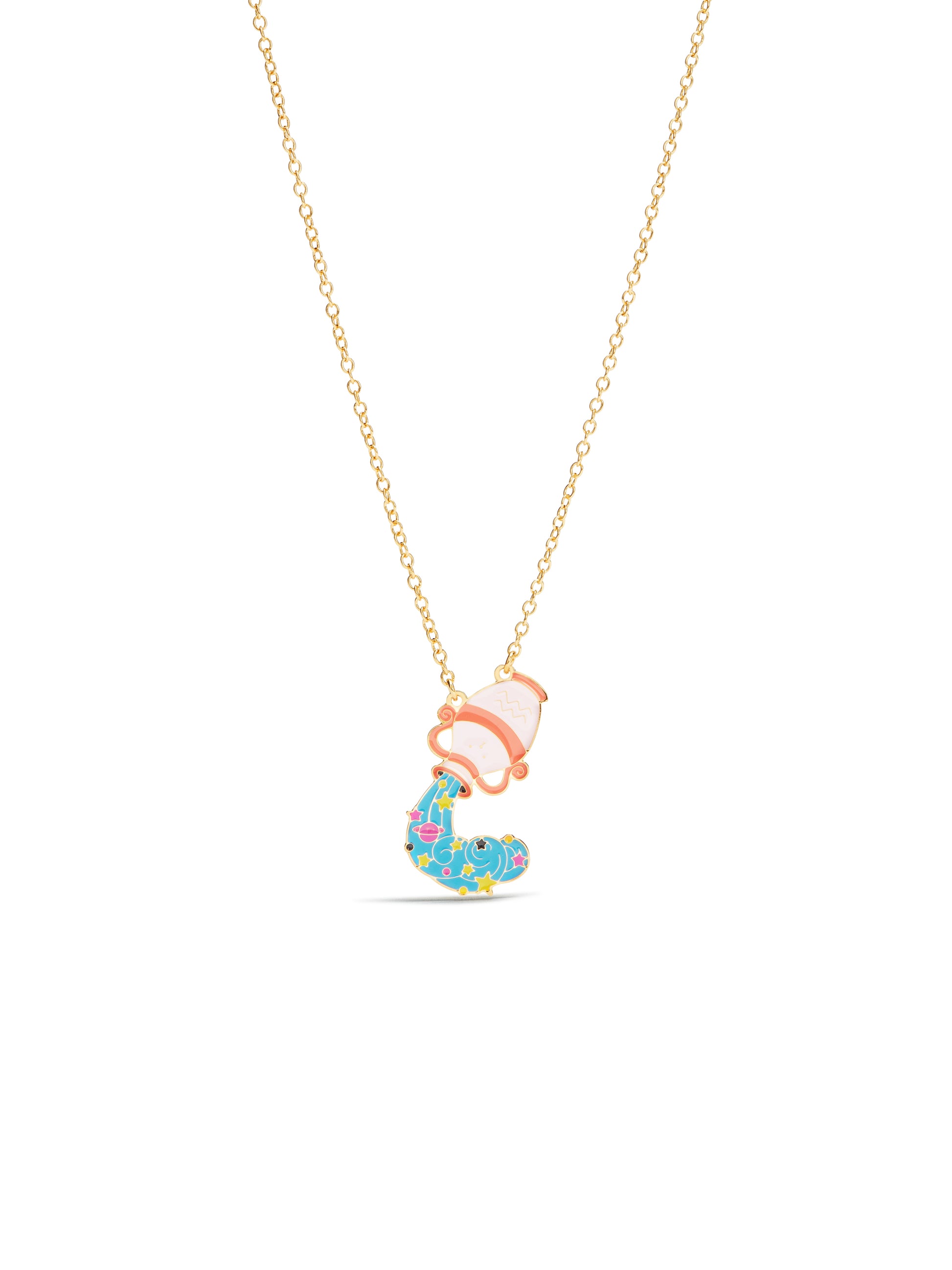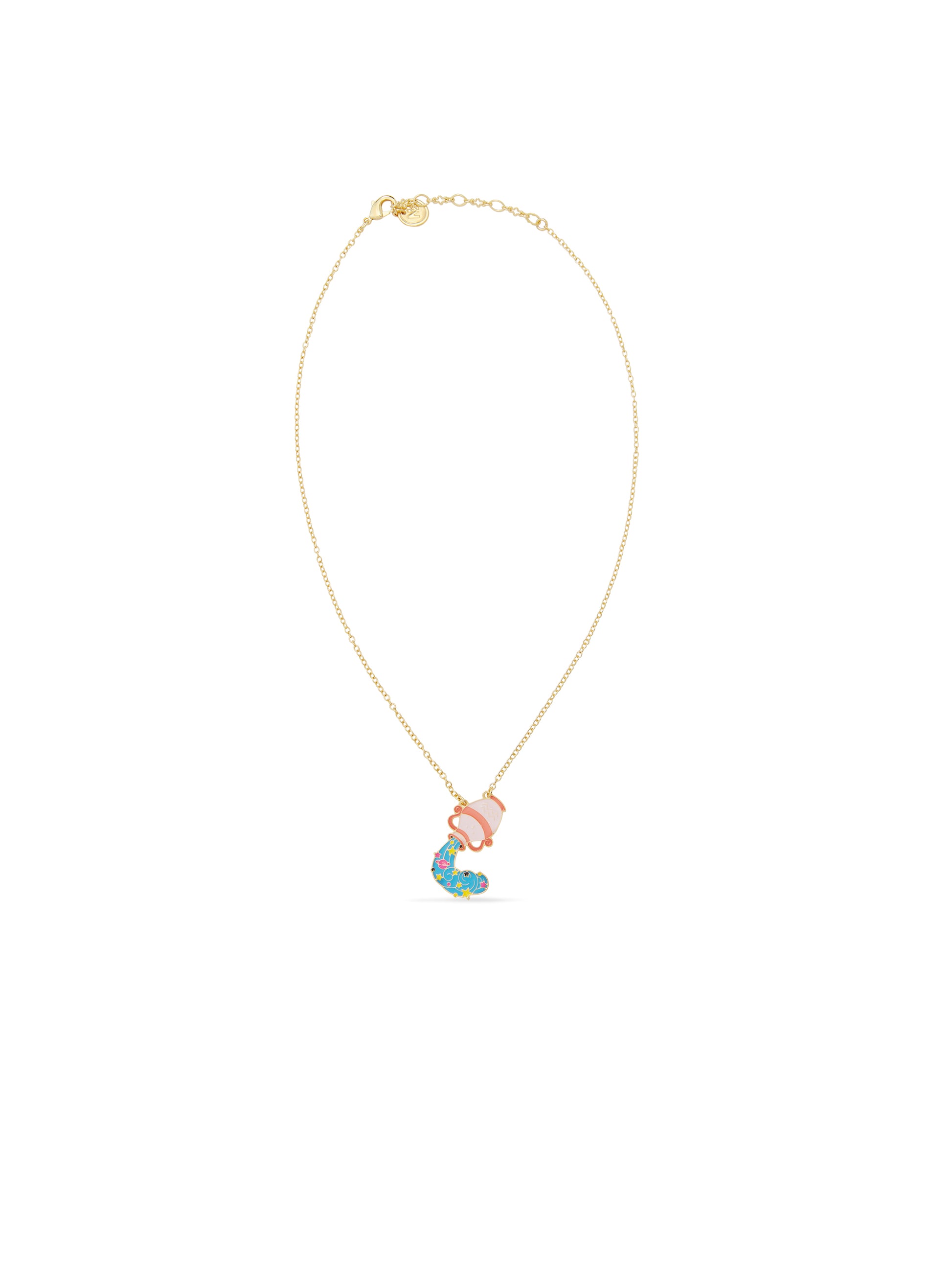 This pendant necklace represents the astrological sign of Aquarius in the form of a jug of water coloured pinkish brown and orange, with the sign of Aquarius appearing on it. Astrology, a theme close to Les Néréides' heart, is being explored for the first time by N2. Colourful animals and characters play with the stars and destiny in their own way!Materials